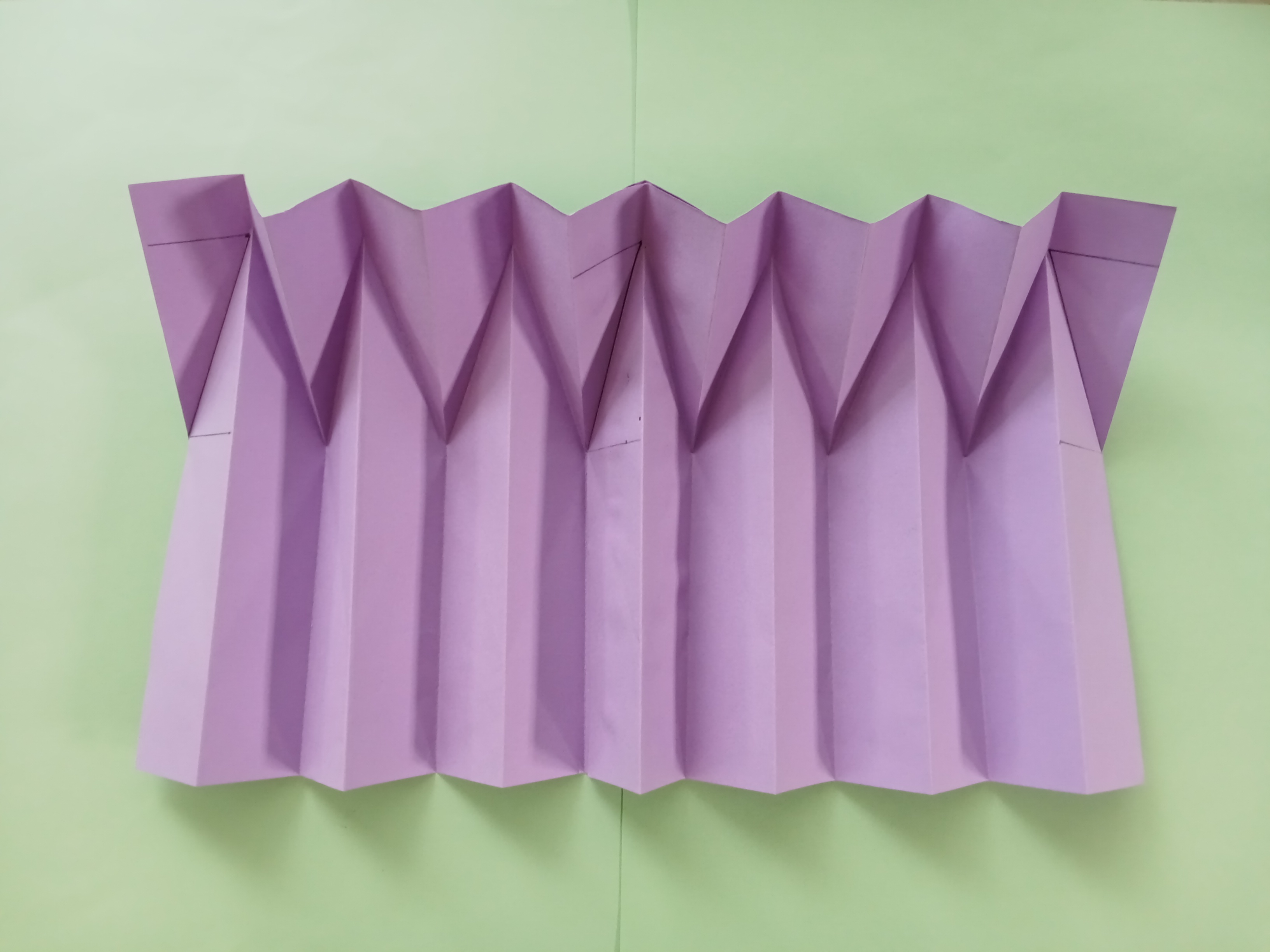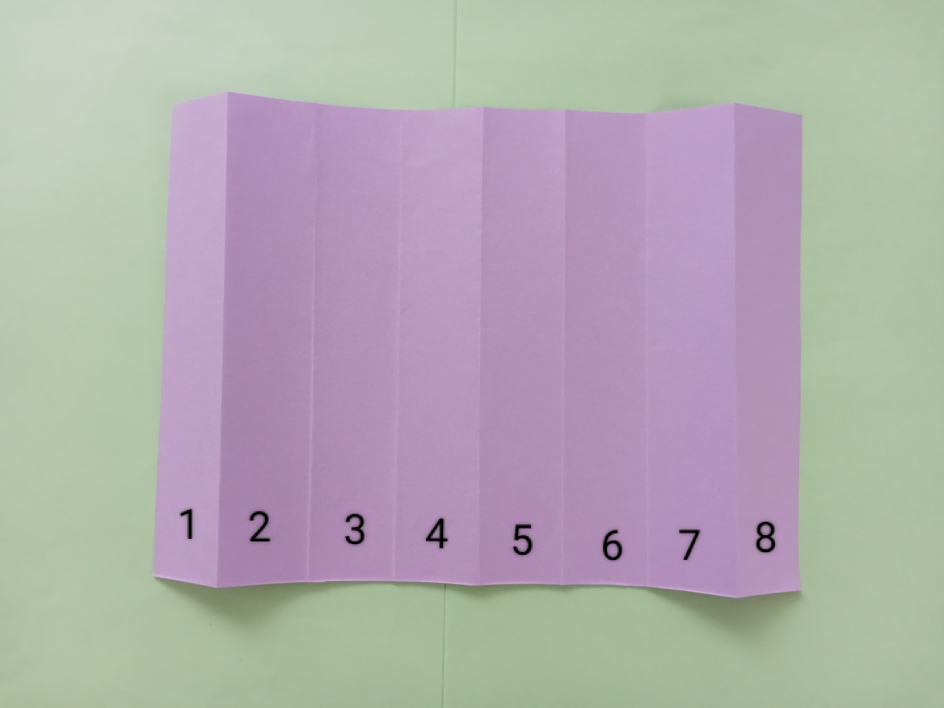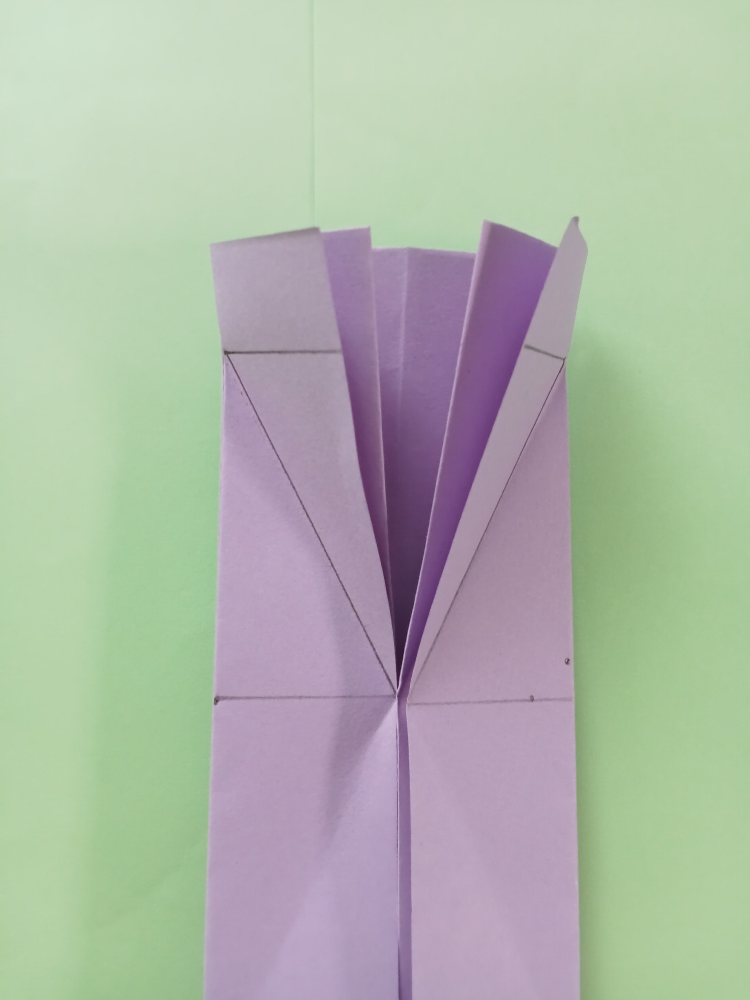 In the first step, cut the A4 size paper in half. Fold each piece of paper in half step by step to make eight equal parts. Gather the folding lines to the middle. Measure 1.5cm and 5cm from the top edge of the paper. Draw two lines in the middle and fold these lines. The next step is to spread this paper and then fold the folding lines again as shown. Gather the folding lines to the middle.