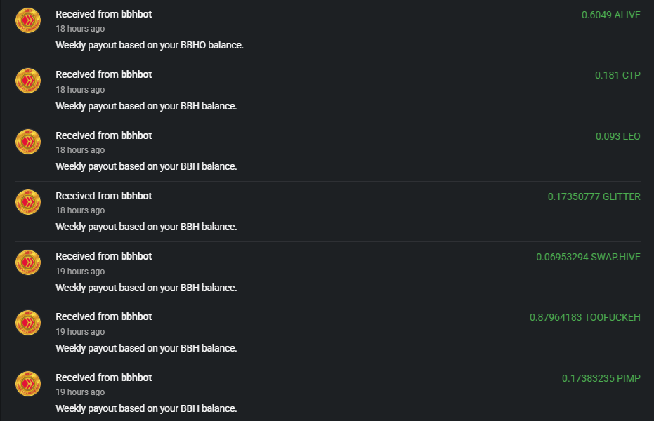 If you own 10,000 or more BBH tokens you got a drip of swap.hive, PIMP, TOOFUCKEH, GLITTER, CTP, and LEO tokens.
