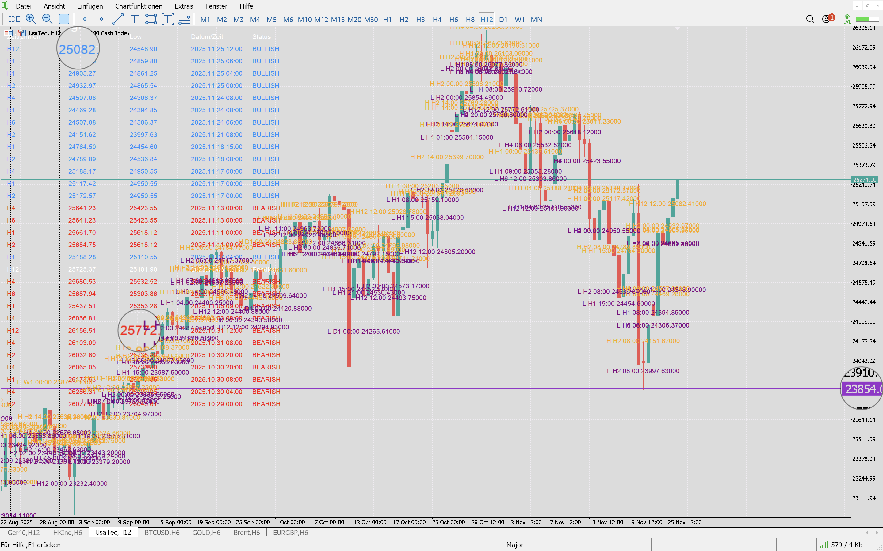 Das neue Signal sollte uns an die alte Ausbruchsmarke bei 25.700 heranführen und somit das Setup Short beerdigen. Ausgeschlossen ist natürlich nichts und so ist es jederzeit möglich, dass erneut die Bären aktiv werden. Zum Ende des Jahres wollen allerdings die meisten Geldhäuser noch mal ordentlich Performance machen und ob das mit einer Shortposition gelinkt ist stark zu bezweifeln.