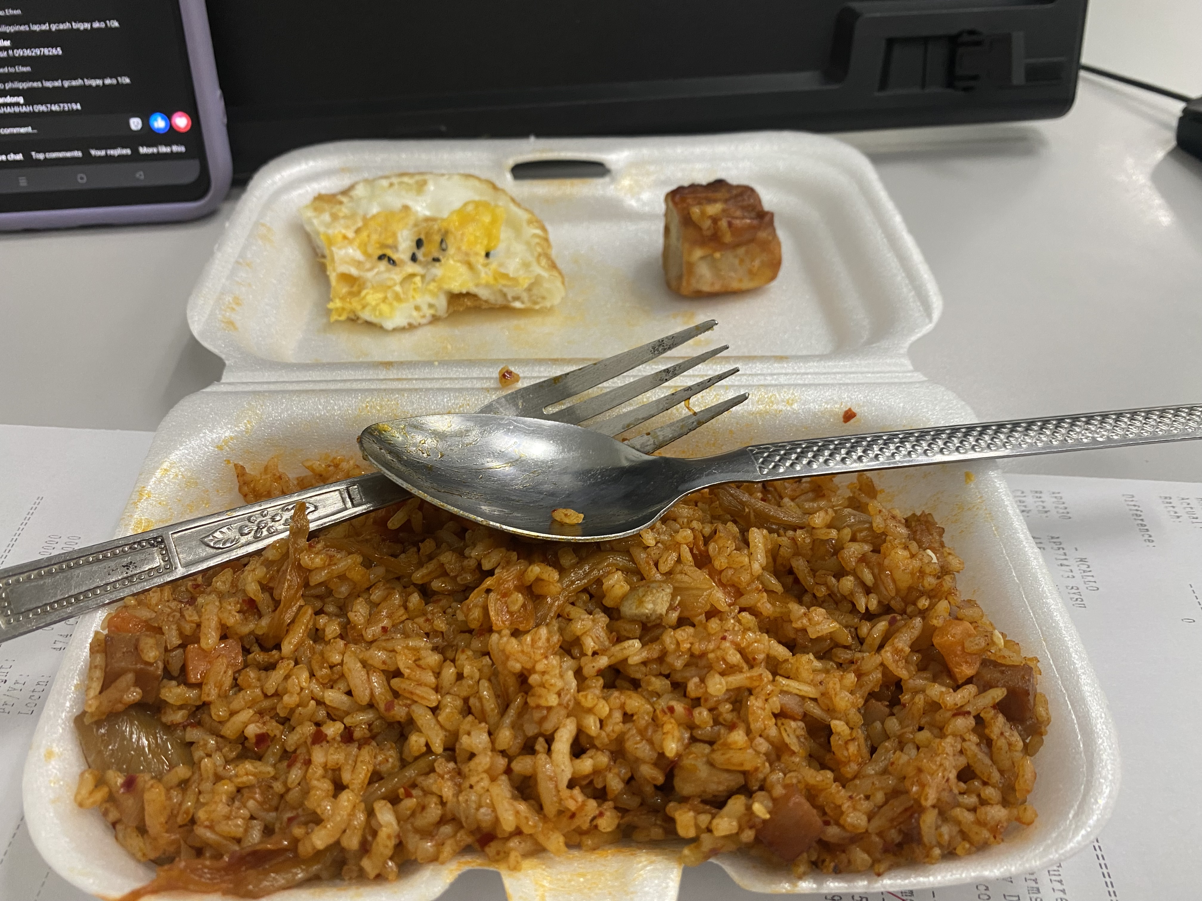 When I clocked out for lunch, I didn't know what to eat yet. I wanted to buy outside quickly, so I decided to have some kimchi rice. I bought this at the nearest Korean food stall. It's just a few walks away from the office.