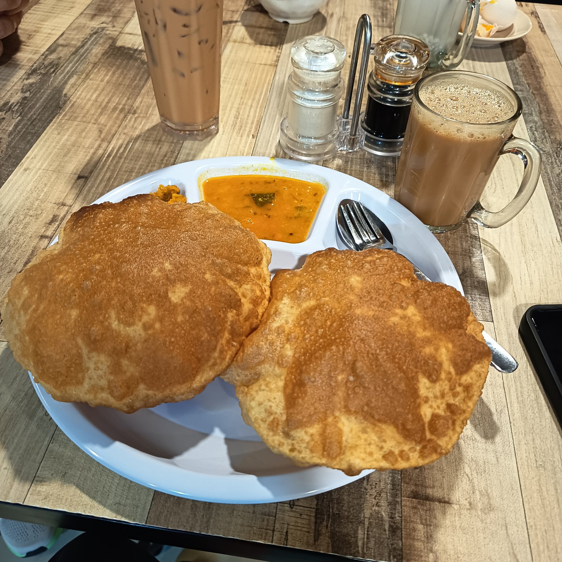 這個是舊日常了。拉叔最近幾年都在吃這個印度油炸餅。健康是完全沒有這的份了,只是價格便宜而且夠飽。我覺得,只要不亂吃,份量控制住,應該還是可以吃的吧。這麼兩片油炸餅,伴隨著的是咖哩土豆,沾著吃非常有意思。咖哩醬裡面也有伴著豆豆之類的,口感一流。下次來馬可以點這個吃,絕對不是太辣的。但,你不以為自己是吃湘菜長大的就看不起印度人的咖哩哈。他們主要不煮太辣就是為了我們這班不太會吃辣的廣東人。南印度本來就是他們的四川🤪你如果吩咐這些印度人說不夠辣,我跟你講你準備噴火了。他們玩辣,也絕對不是省油的燈。