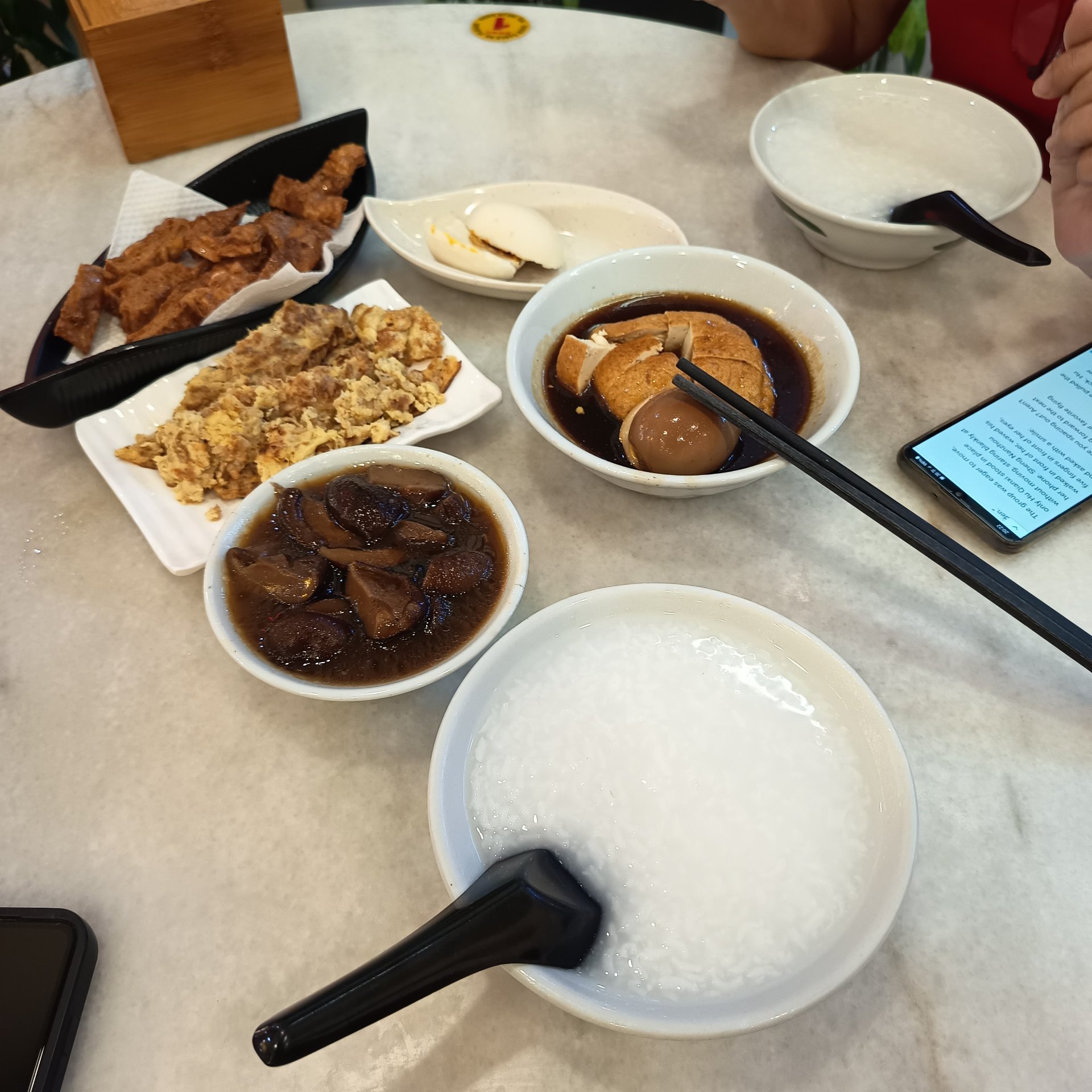 好了,開玩笑也要有個額度。不是每個人都有第二次機會,所以拉叔還是盡量在飲食方面,開始遷就一哈,盡可能不吃太肥膩的。於是,晚上招了母老虎到我們家附近的潮州店去吃粥。@aellly [@atyh](/@atyh) 這一種是不是很有親切感啊?我們點了一碟腐竹(素燒鵝),一顆鹹蛋(切半),一碗滷冬菇,一片滷豆腐,一粒鹵蛋(切半),最後再來一碟菜脯炒蛋。這頓潮州粥,真的吃得酸爽。吃得剛好夠飽。吃飽後也不會覺得撐住,算不錯。