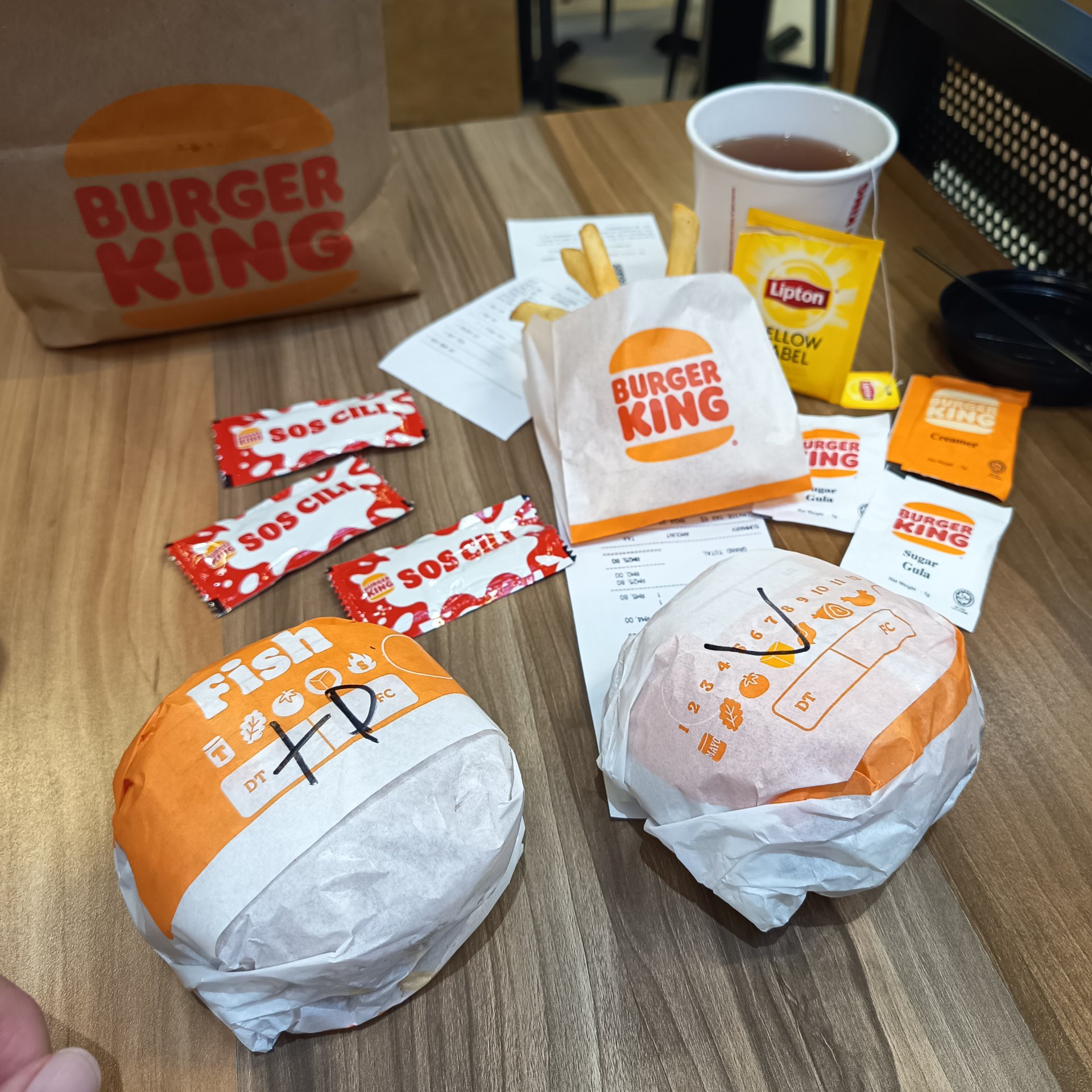 至於去商場午餐,還真的非常頭疼。一個手已經拿著拐杖了,剩下另一隻手很去搬食物。由於同事們全部都出勤去了,剩下我一人去午飯,最後決定了到漢堡王去吃漢堡,並且點餐時點了打包。這麼一來,他們就會將全部食物裝進袋子,我就可以提著一個袋子回到座位去慢慢吃了。我點了兩個包,一個是全素的冬菇蔬菜漢堡,沒有芝士,沒有蛋,沒有肉,竟然出奇好吃,而且才5.8一個。相當不錯了。另一個魚柳漢堡……感覺很腥😑而且還得整16一個套餐,包括一杯紅茶和一小袋子的薯條🍟