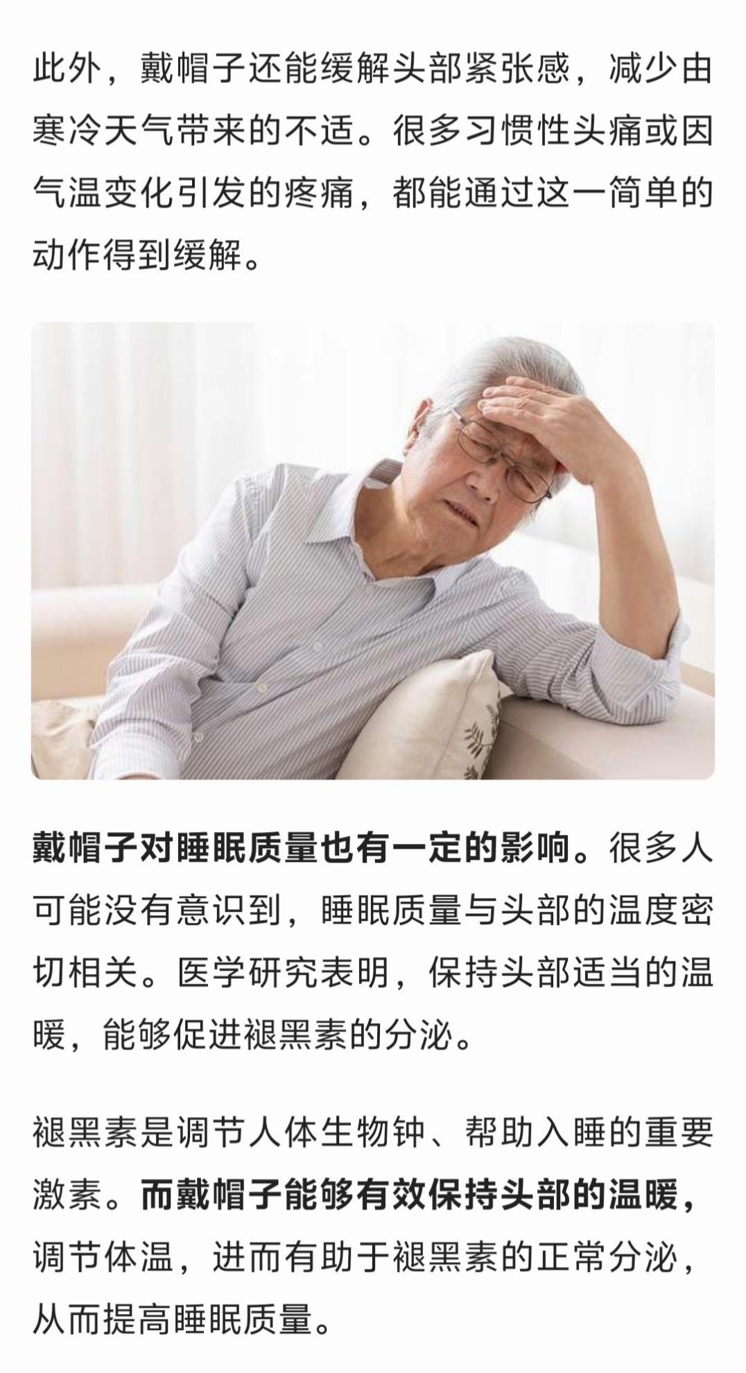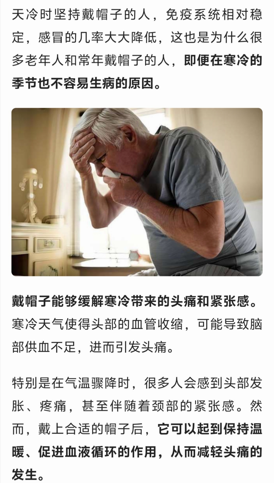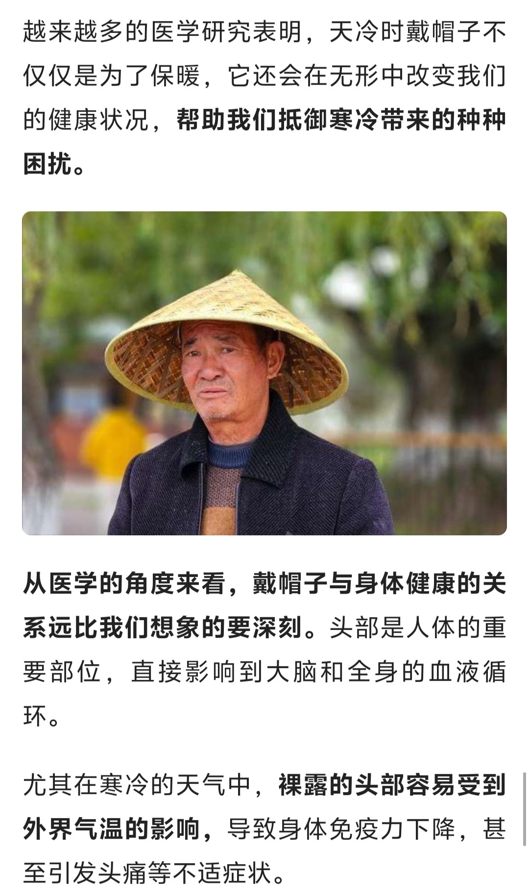 领导关心我,我也得关心领导一下,中年人夫妻除了关心就是关心对吧,中年夫妻是家挺的过度期最难的时候,上有老下有小,自身的身体健康关乎着一个家庭的幸福。最近小雪天气该渐冷了。领导这人冬天最不喜欢戴帽子,再冷的天气他都不戴。今天我发现了一个篇冬季戴帽子的好处文章的图片给领导转过去了,看看他看完之后会不会喜欢上戴帽子吧😃(来自文章截图)