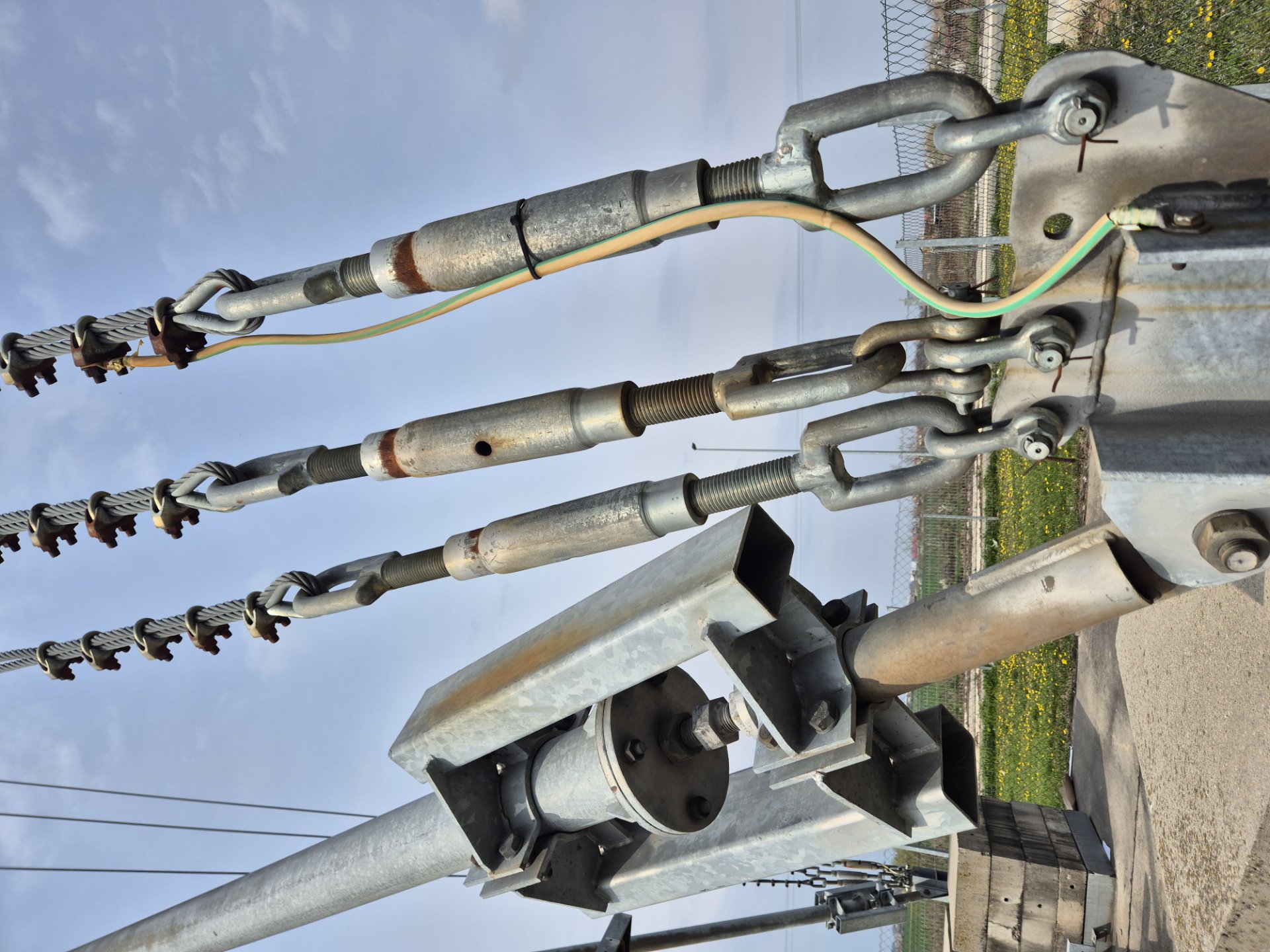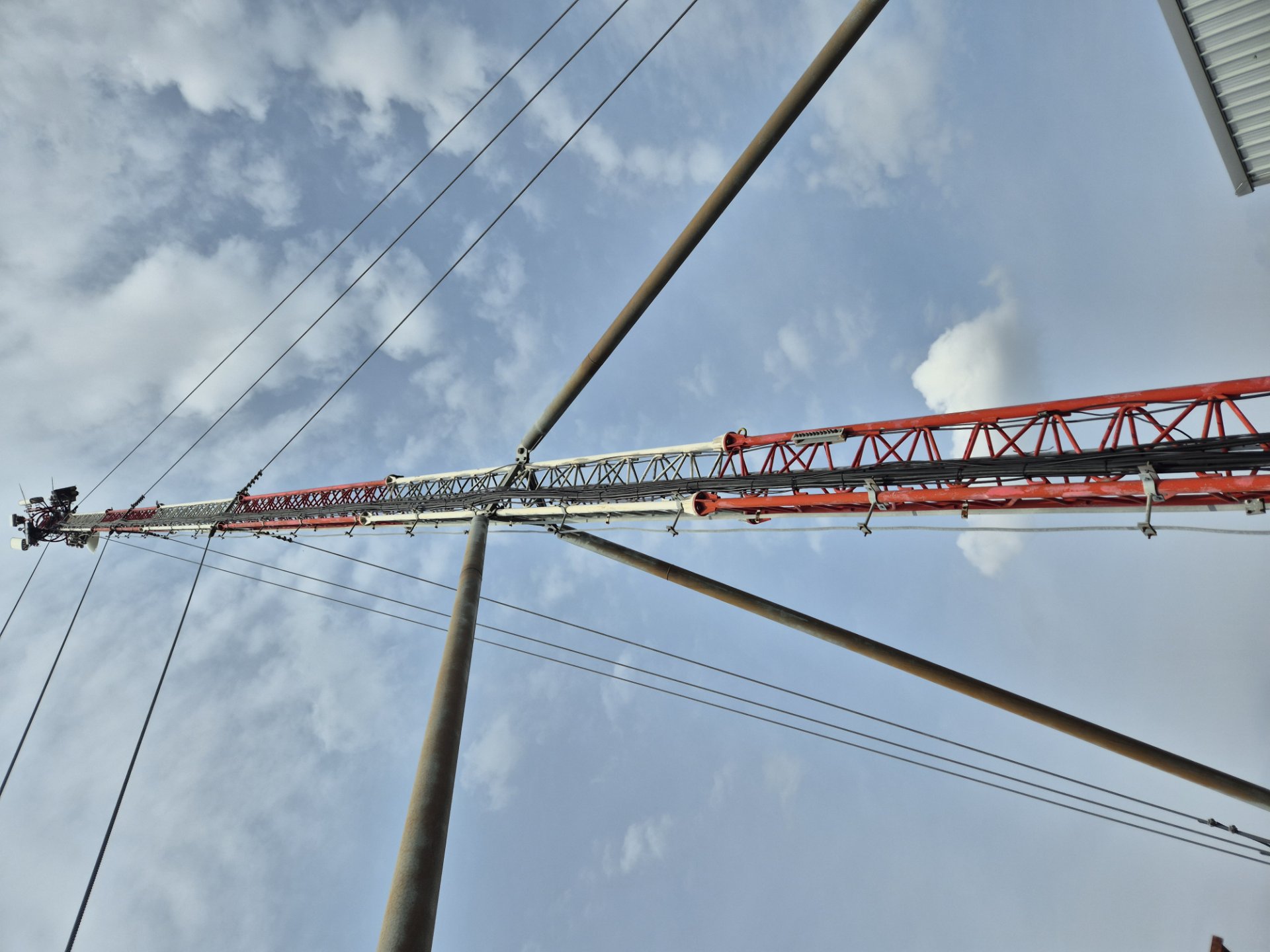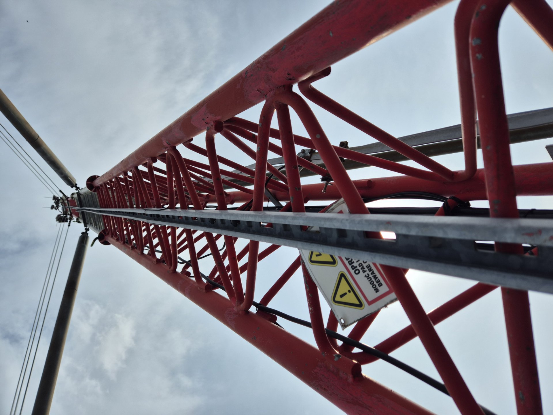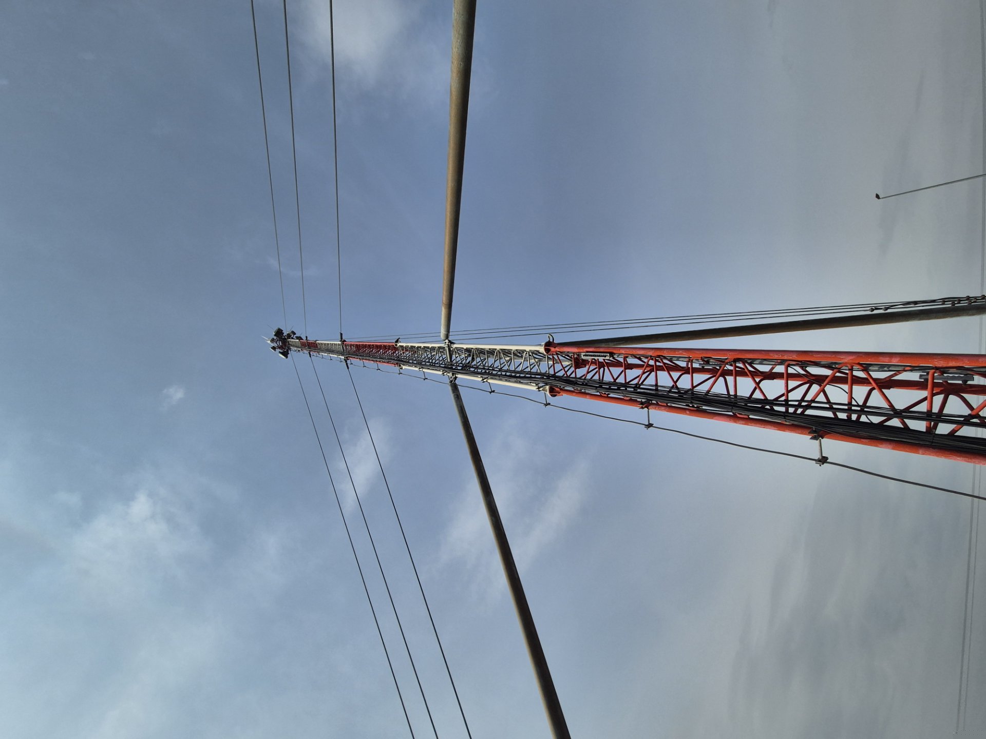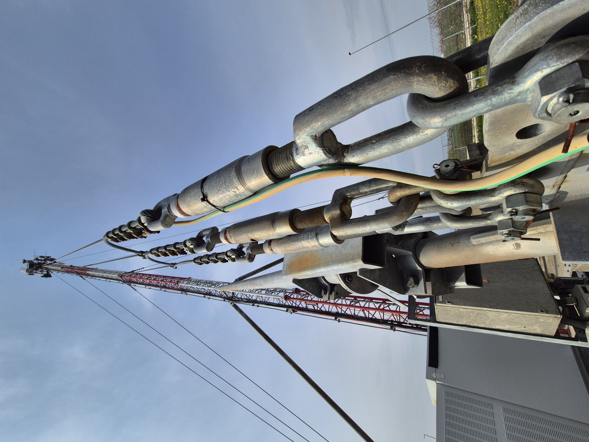 A narrow grid column, this tall and at first glance unstable, is loaded at the base with concrete blocks and attached with steel cables that give it sufficient stability.