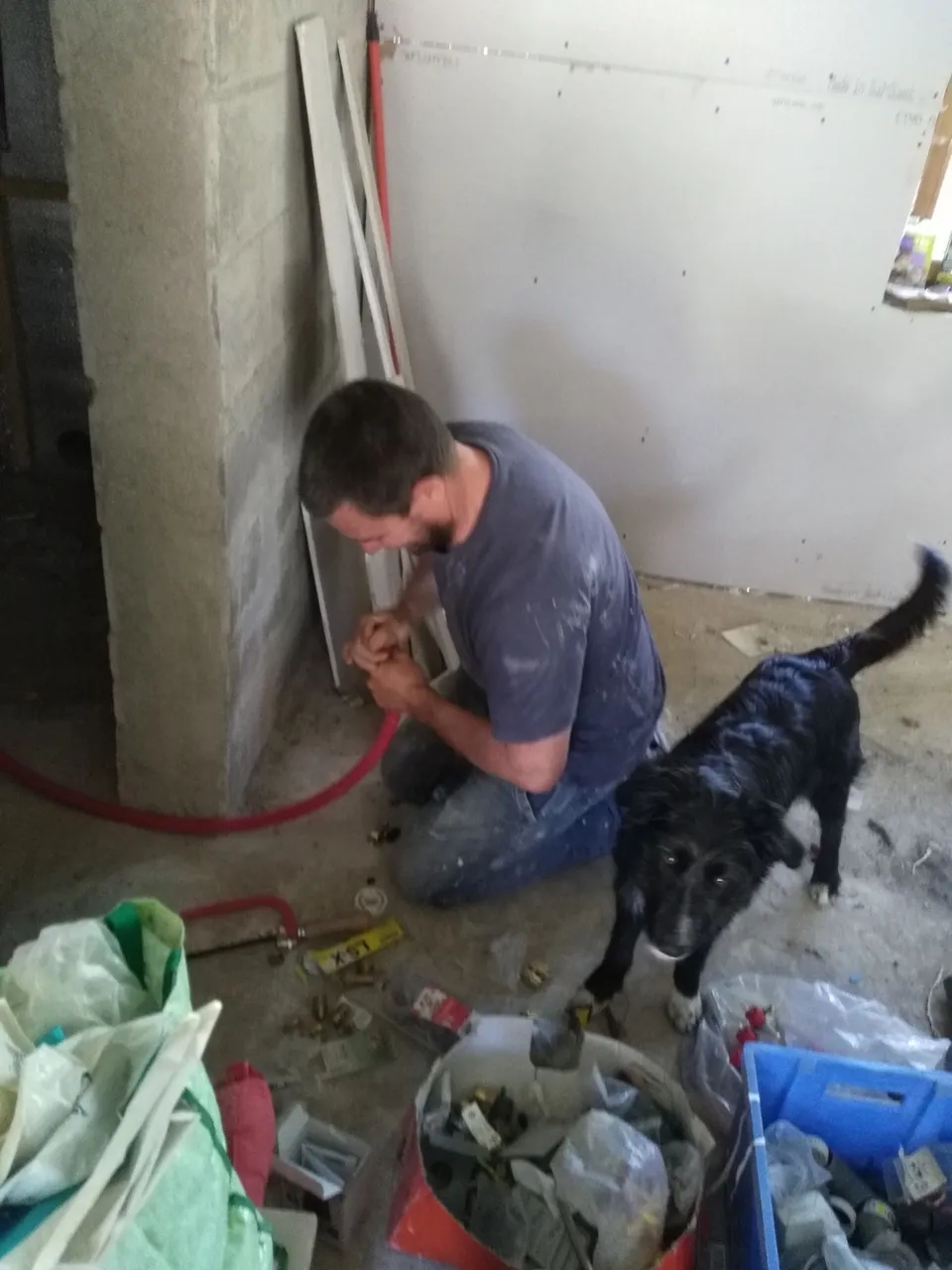 I feel the plumber has a new job at hand in an uncompleted building. The black dog is probably his dog that loves to go around with him acting like a supervisor. It's a busy day for them both , if only the furry supervisor doesn't get himself a new job.