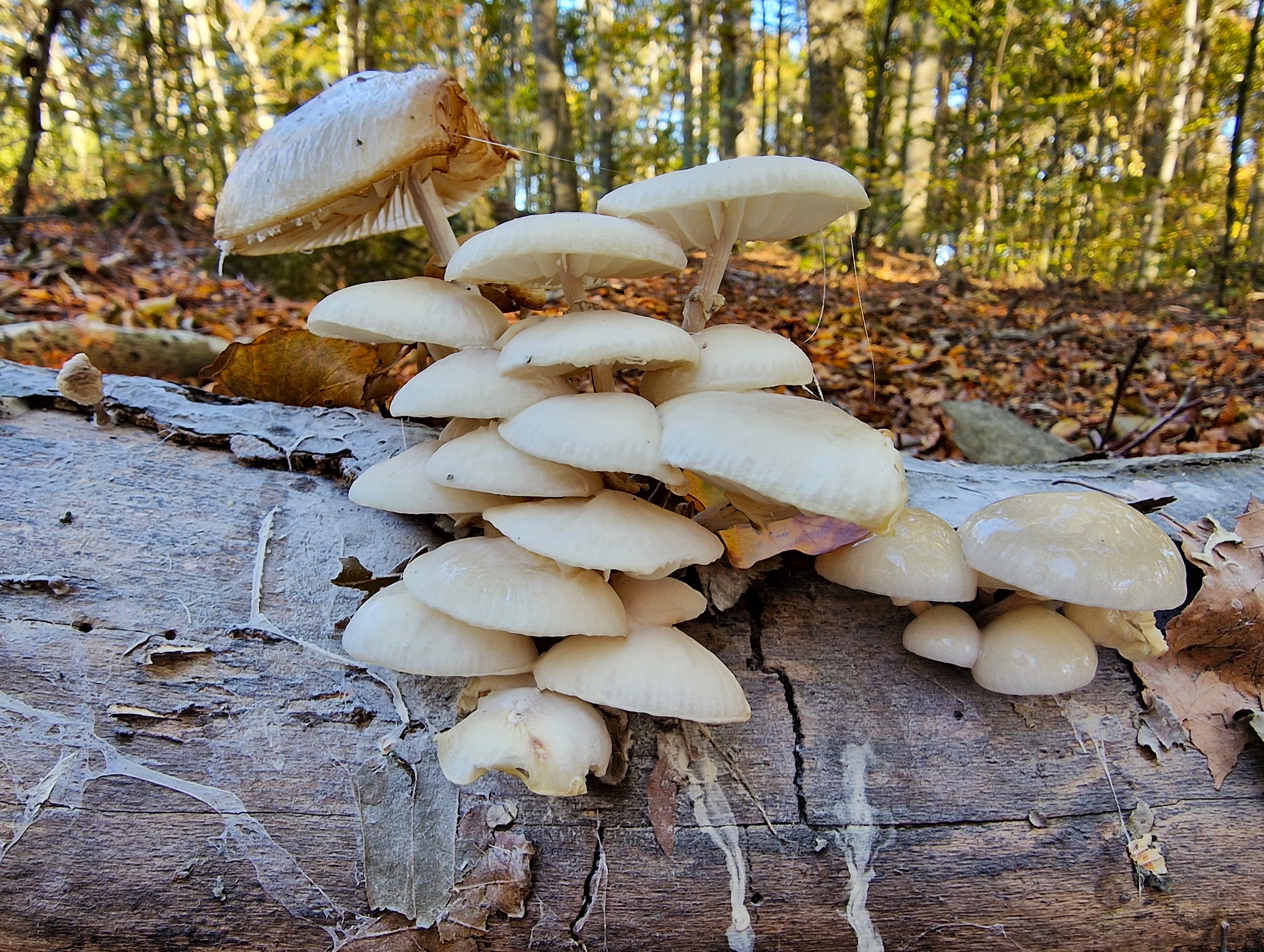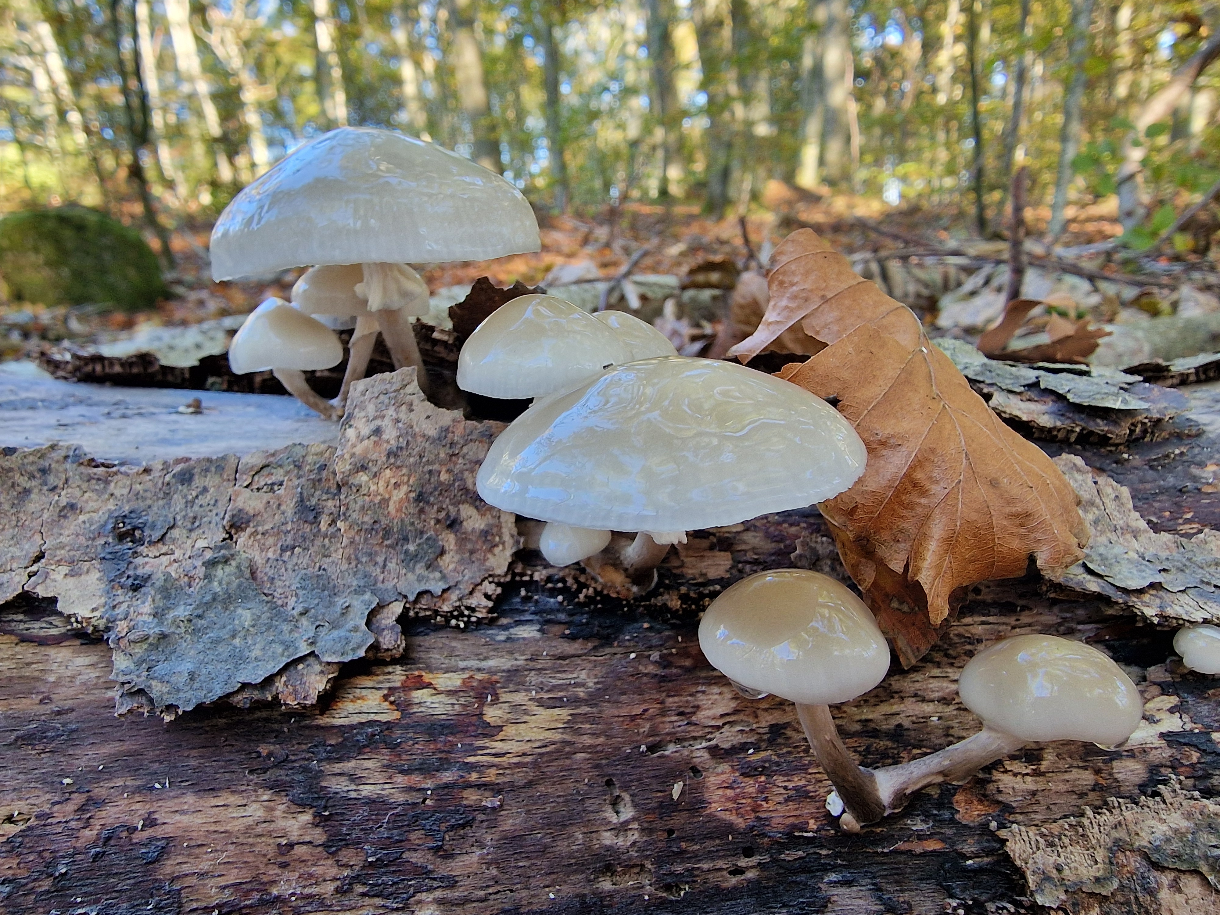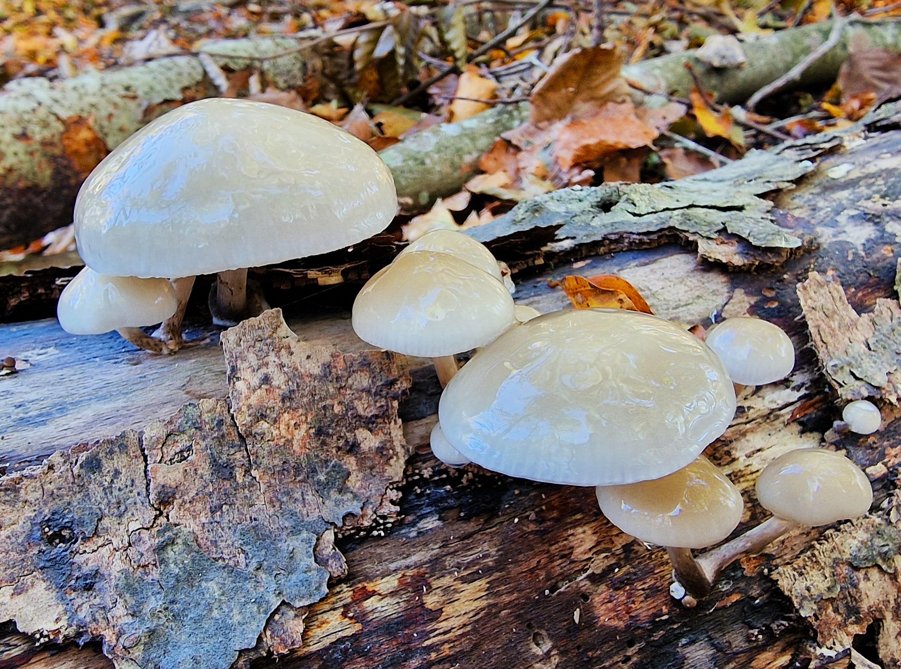 Porcelain fungus Oudemansiella mucida or Mucidula mucida is a fairly common autumn mushroom in northern Europe, specifically on rotting beech trees but if you are not in a beech forest you may be very lucky to find them on oak logs or stumps