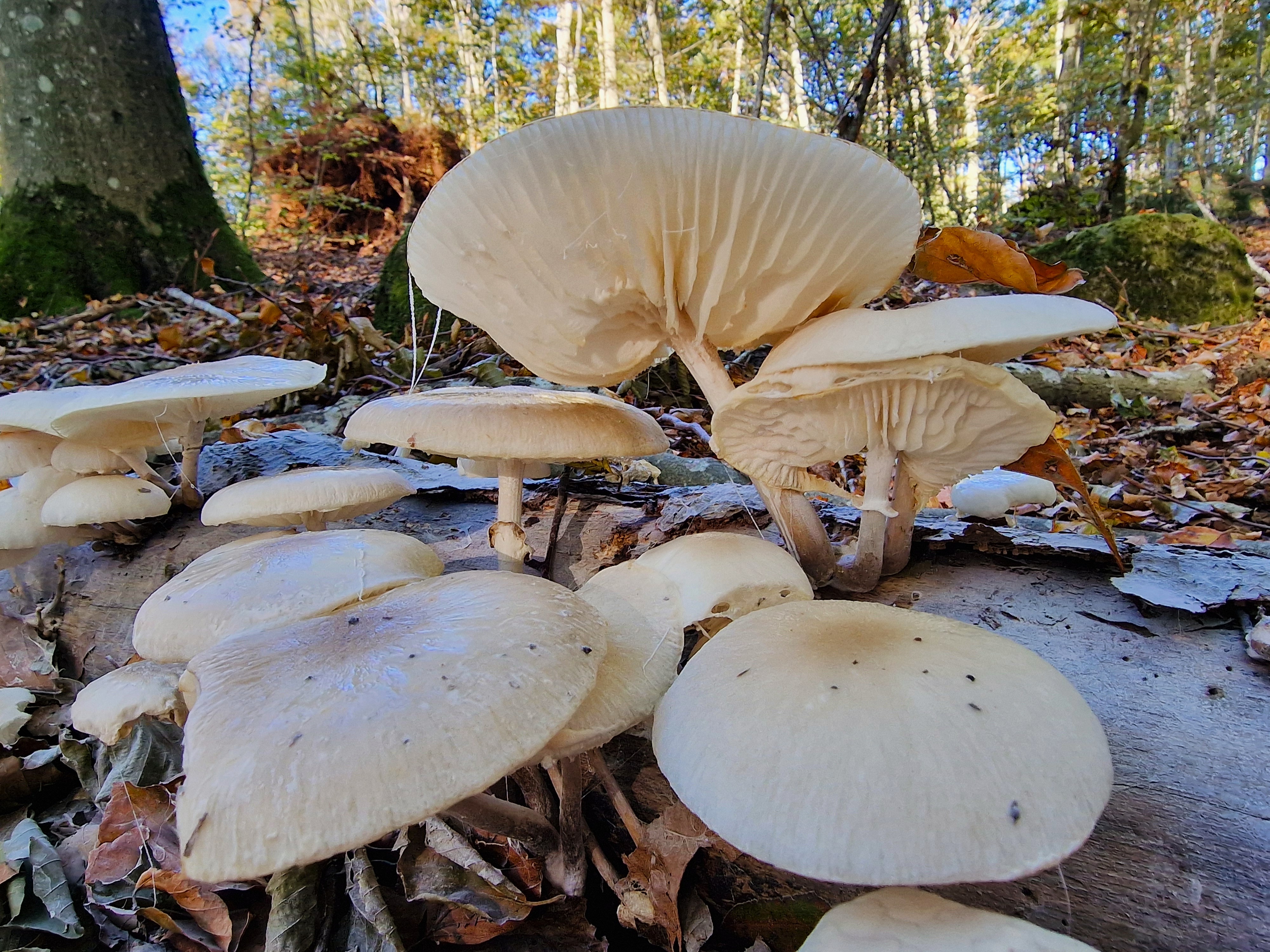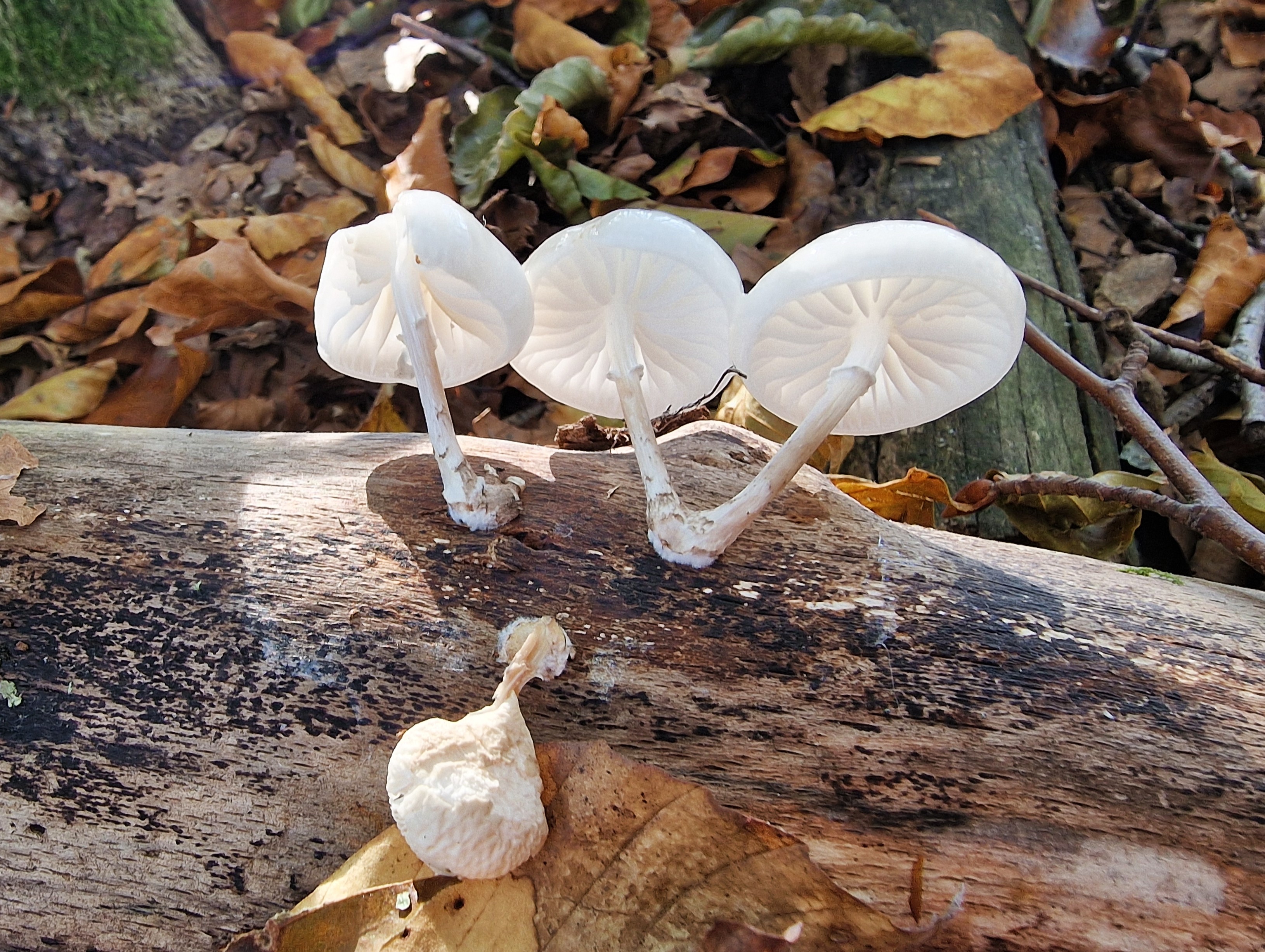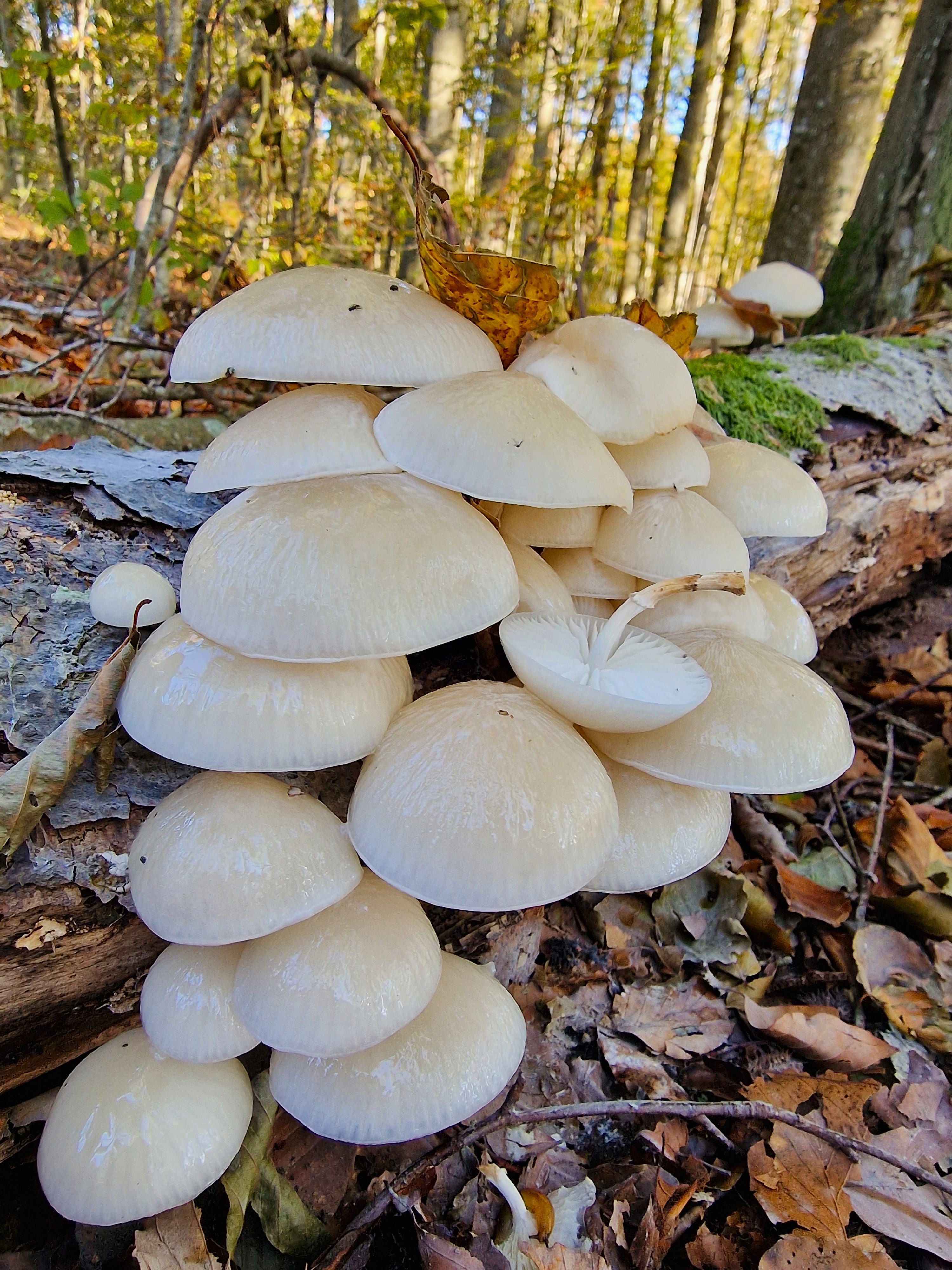 Porcelain fungus Oudemansiella mucida or Mucidula mucida is a fairly common autumn mushroom in northern Europe, specifically on rotting beech trees but if you are not in a beech forest you may be very lucky to find them on oak logs or stumps