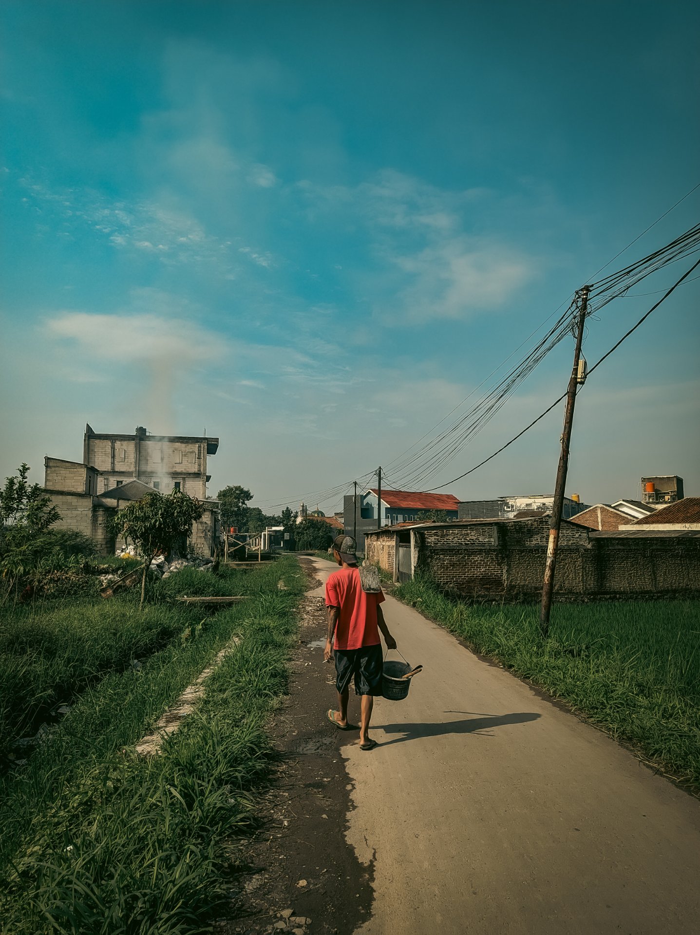 Last Tuesday, I paid a visit to my younger sibling who lives in the Rancamanyar area. Along the way, I saw a man walking down the road while carrying a hoe and several other farming tools. He had probably just finished working in the fields.