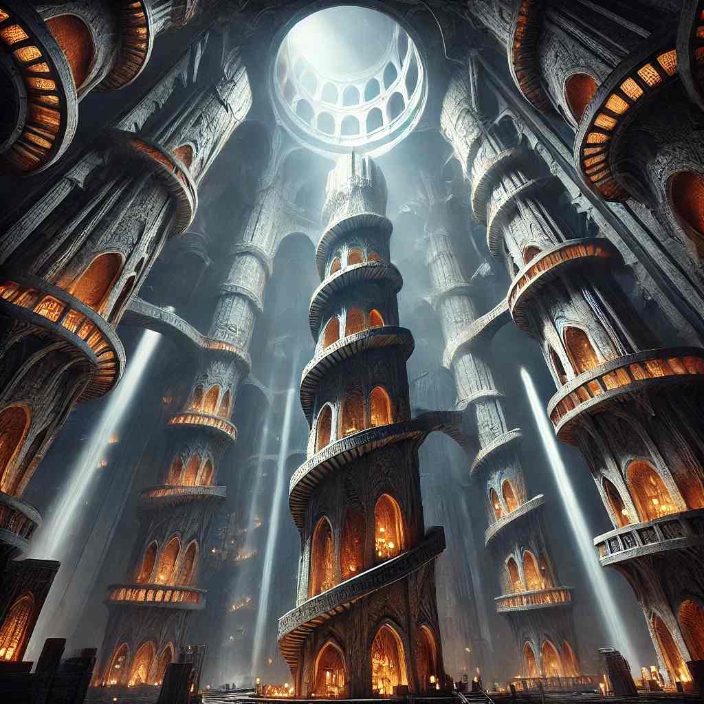 Stairs spiraled around the giant columns like stone serpents that wound past and through tiered galleries carved into the pillar faces. Each tier blazed in the warm light of crystals, glowing alcoves, shelves of manuscripts, tomes and tablets.