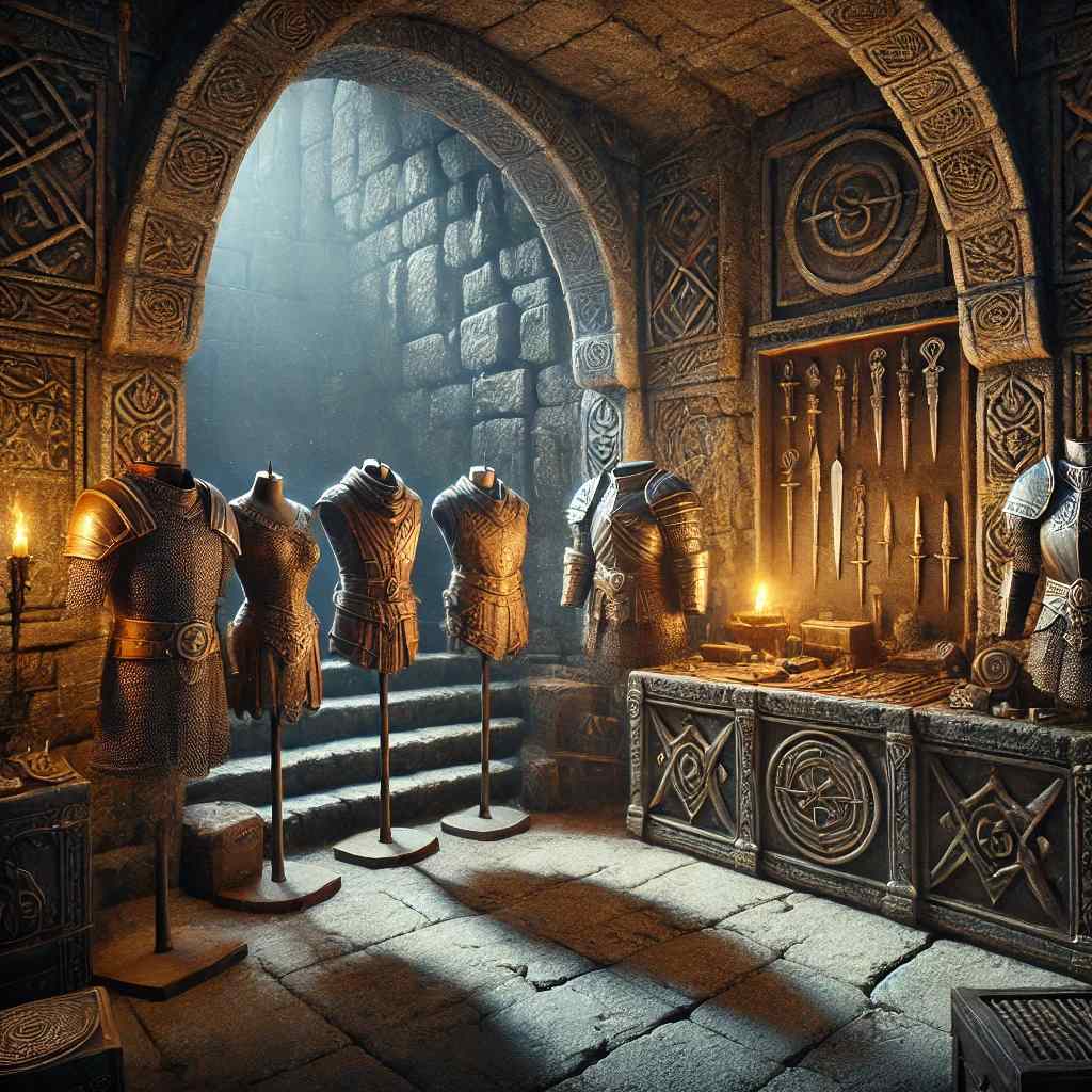 Tagoth grunted as if spotting something of interest and wandered off deeper into the shop, his curiosity drawn to an old cabinet nestled in a shadowed alcove that looked important. Dravis watched him for a second before his eyes wandered off to a low shelf tucked behind the counter, covered in dust. Half-buried in crumpled leather, a few odd items sat quietly.