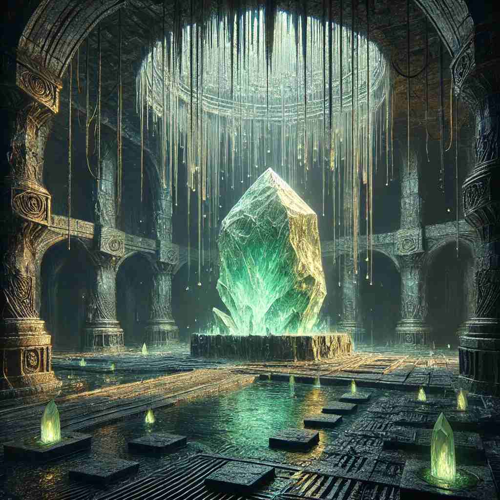 In the center of the chamber, resting on a great basalt dias, lay the heart. A crystal nearly as large as a dwelling, fractured, its cracks glowing silver, wounded by Elven magic, beat faintly. Still alive, but just barely.
