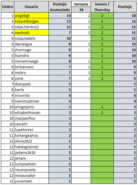 El que comentó primero el martes pasado fue @roswelborges y el que comento primero el jueves fue @necho41 por lo que ganan 1 HSBI cada uno y como en la tabla el primero es @jorgebgt gana 1 HSBI.