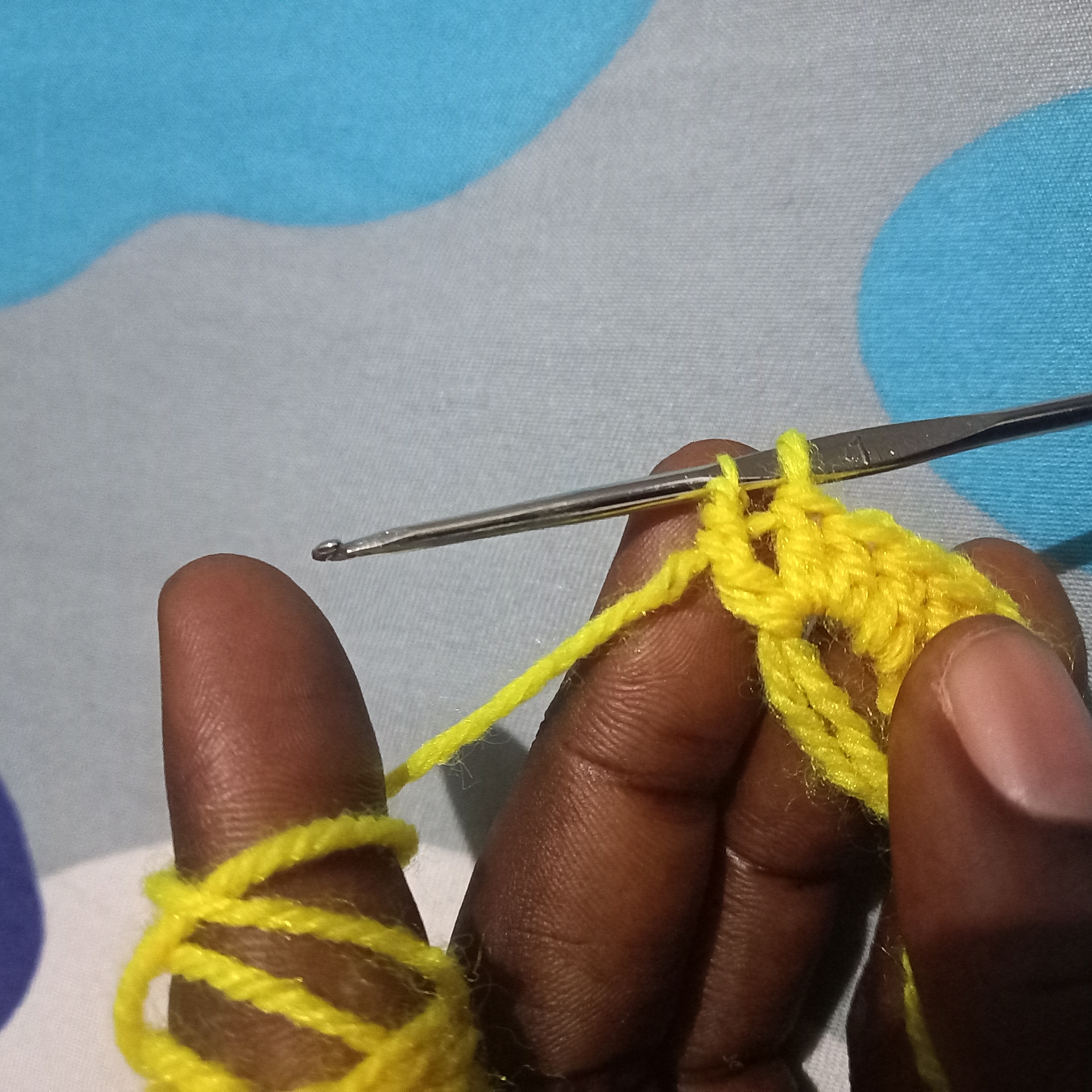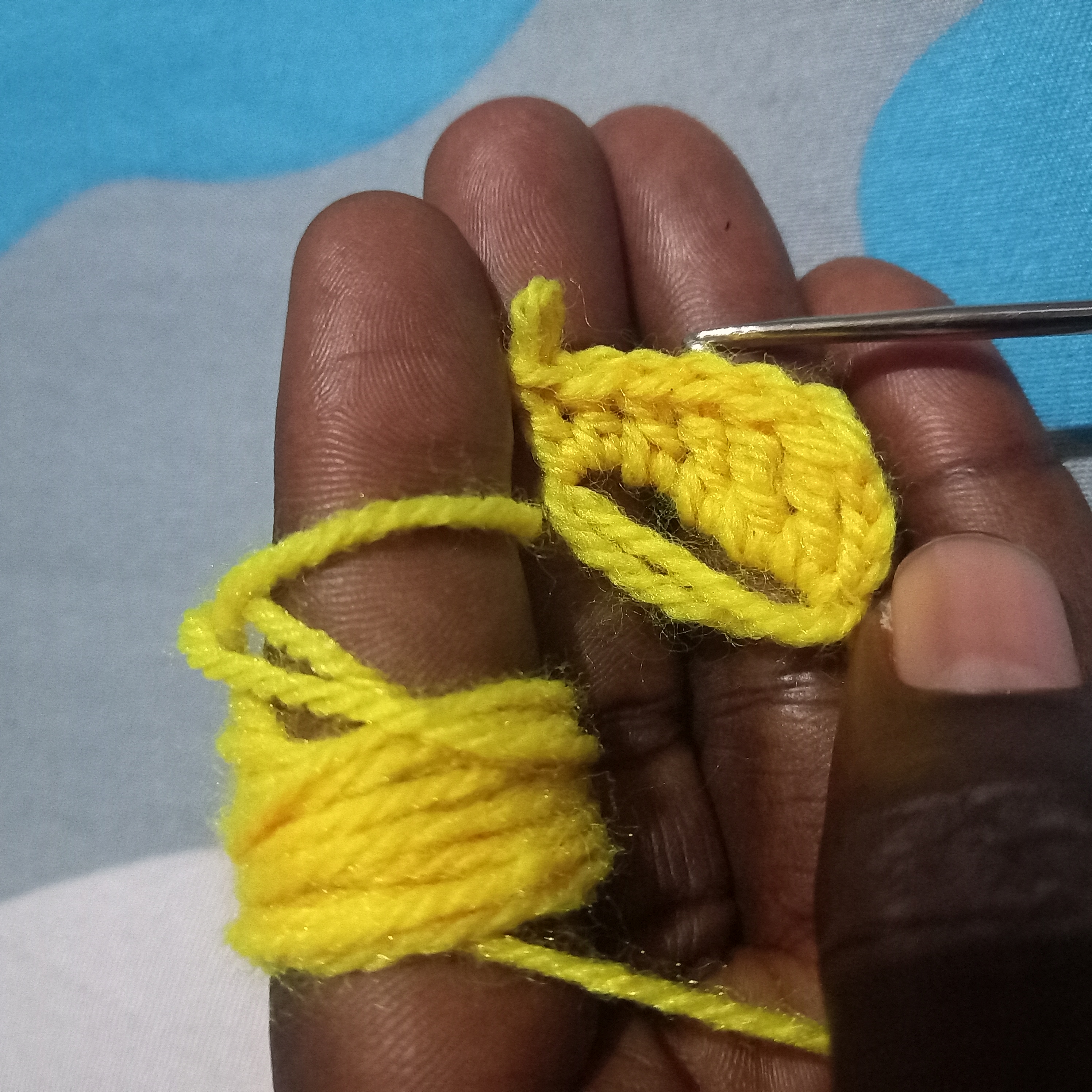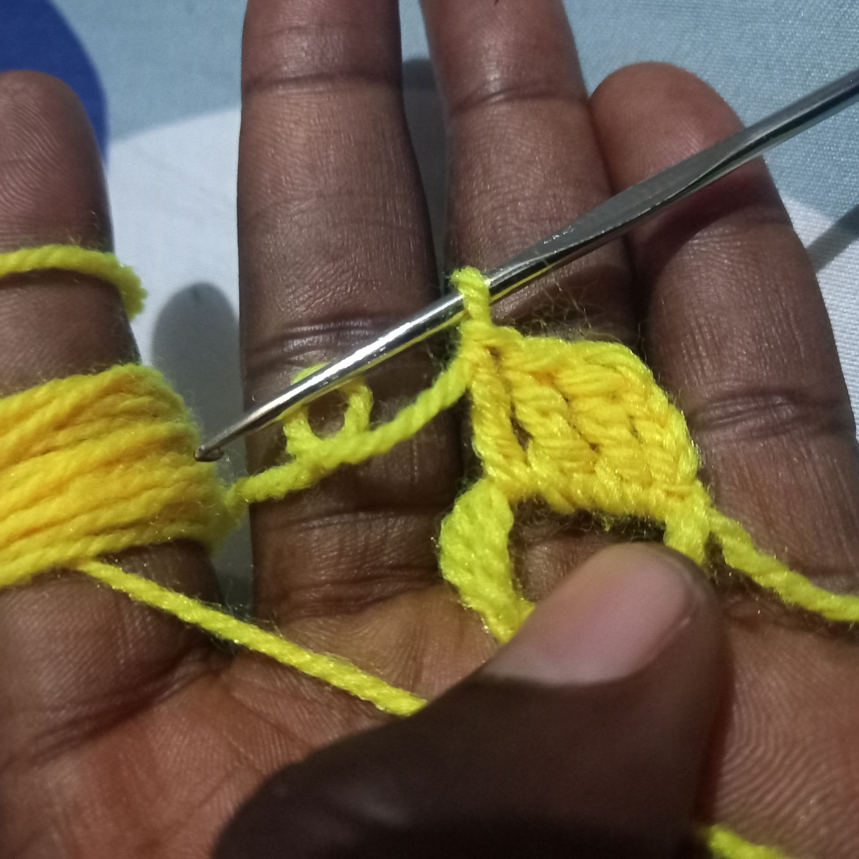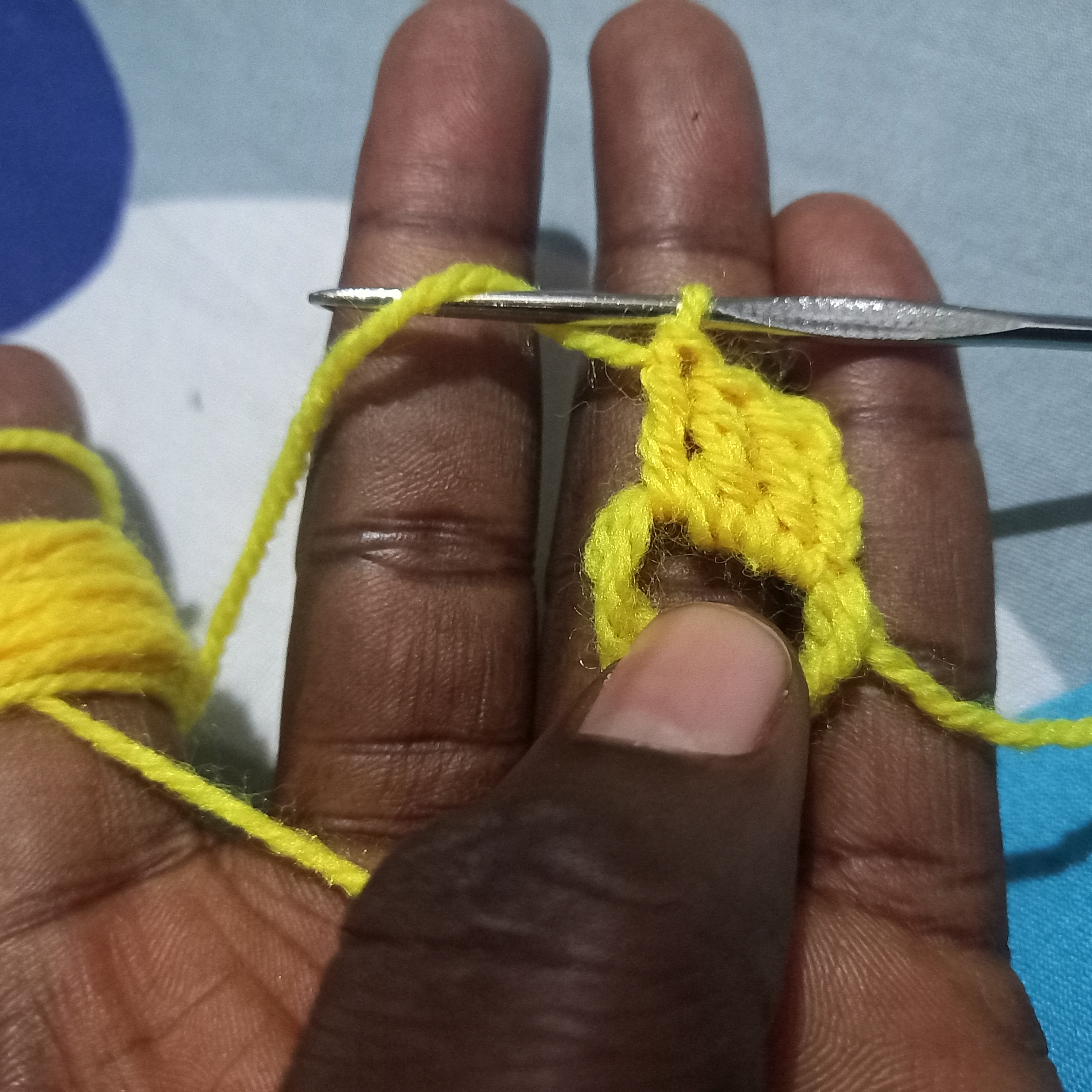 As you All can see I have make three triple double crochet inside with the yellow wool and one three chain