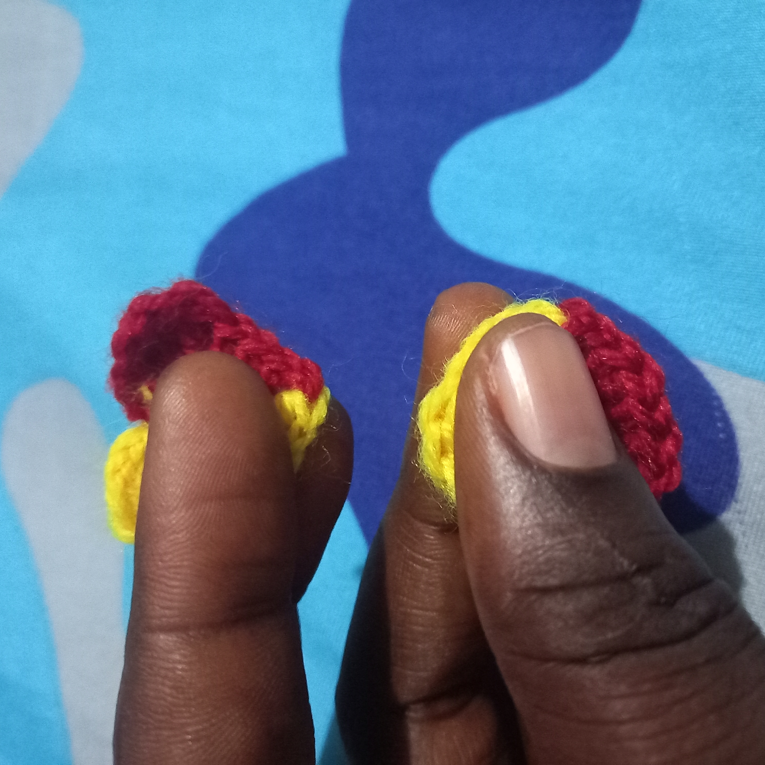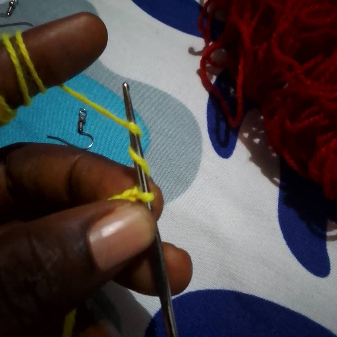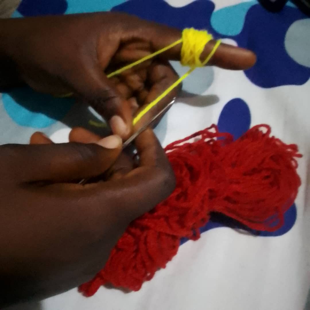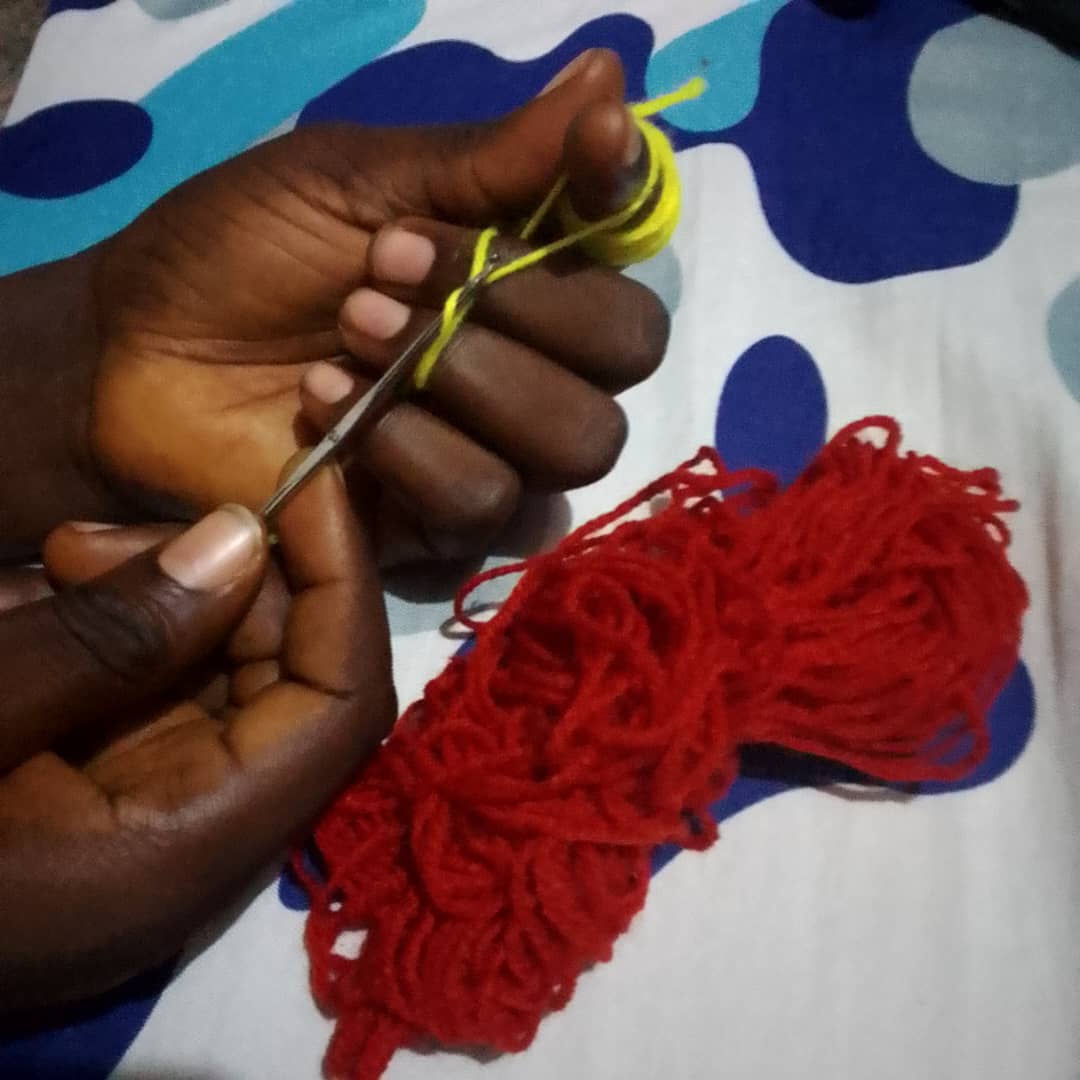 Then I will also interchange the process to starting the red wool as well because I want it to be yellow on bother side but in a box maner. And also red on both side.