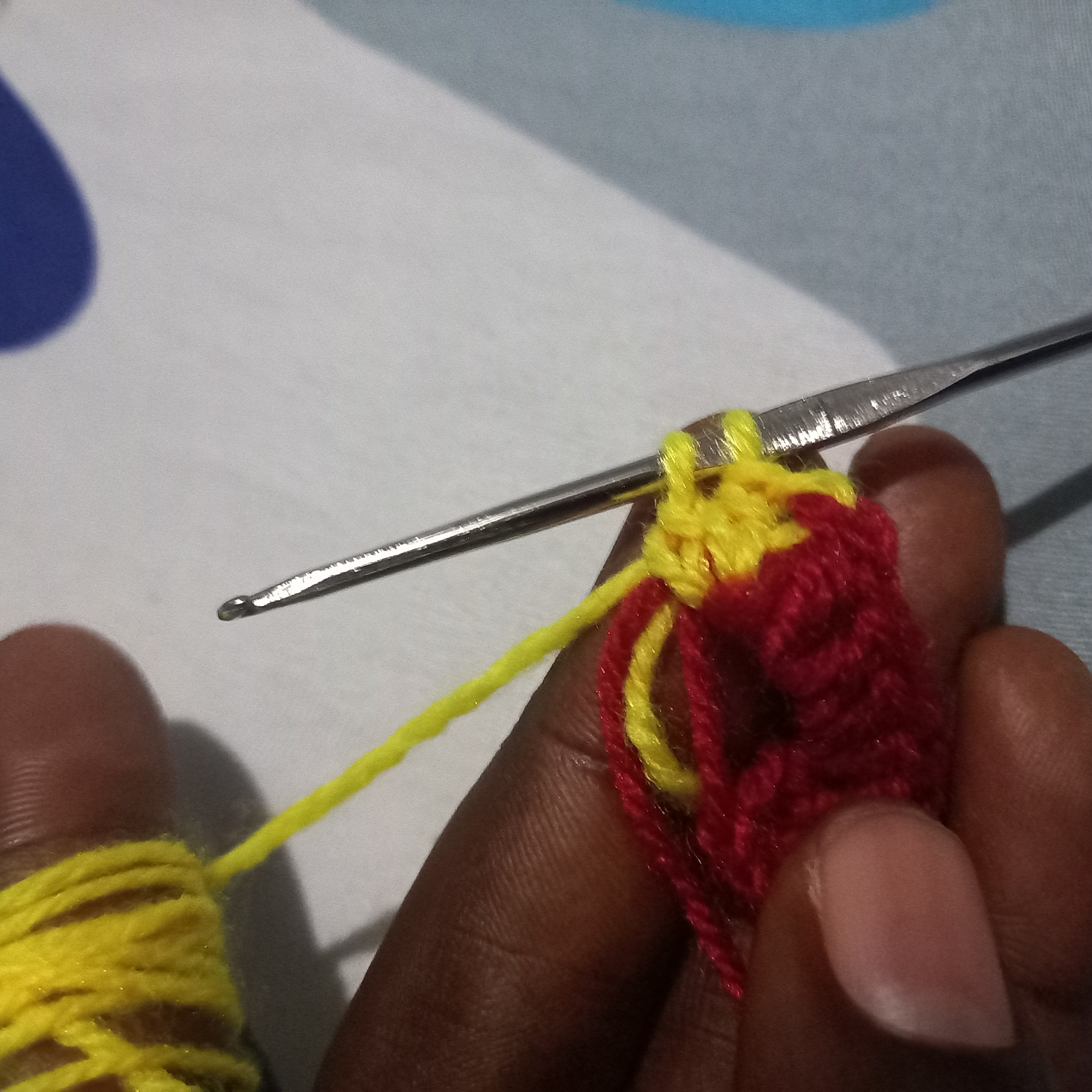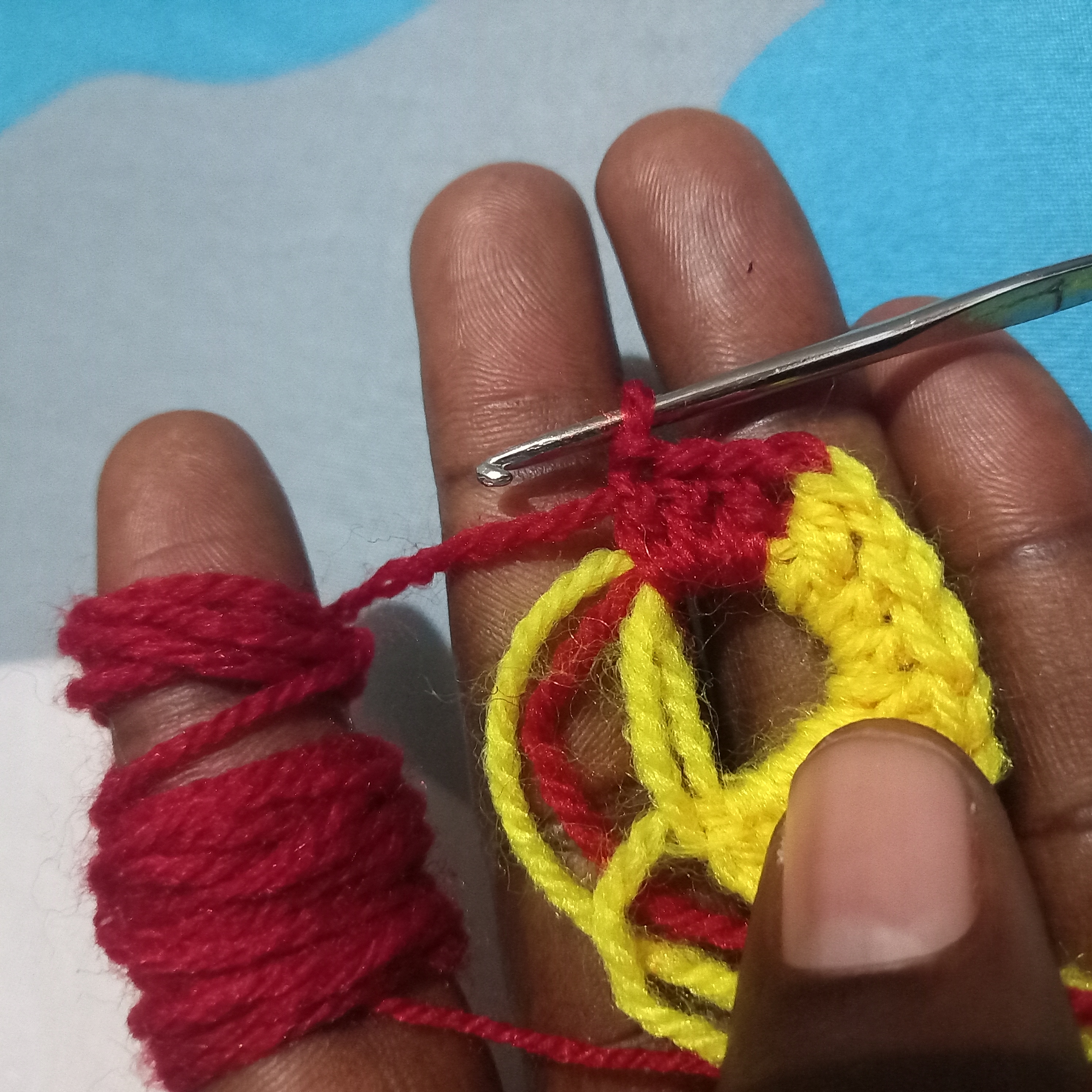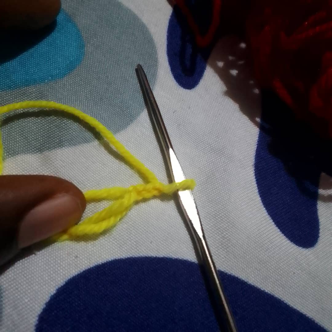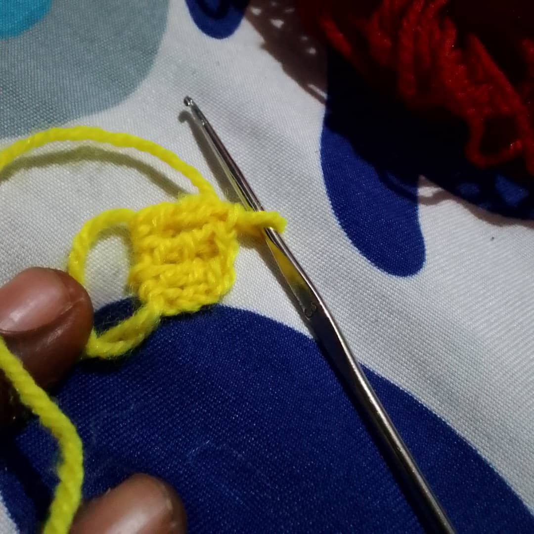 From there I will make another triple double crochet but this will be use to change the colours of the love. I will used the yellow wool to go through the first and second crochet and then in the last one I will use the red wool to complete it and that will automatically change the colour to red wool.