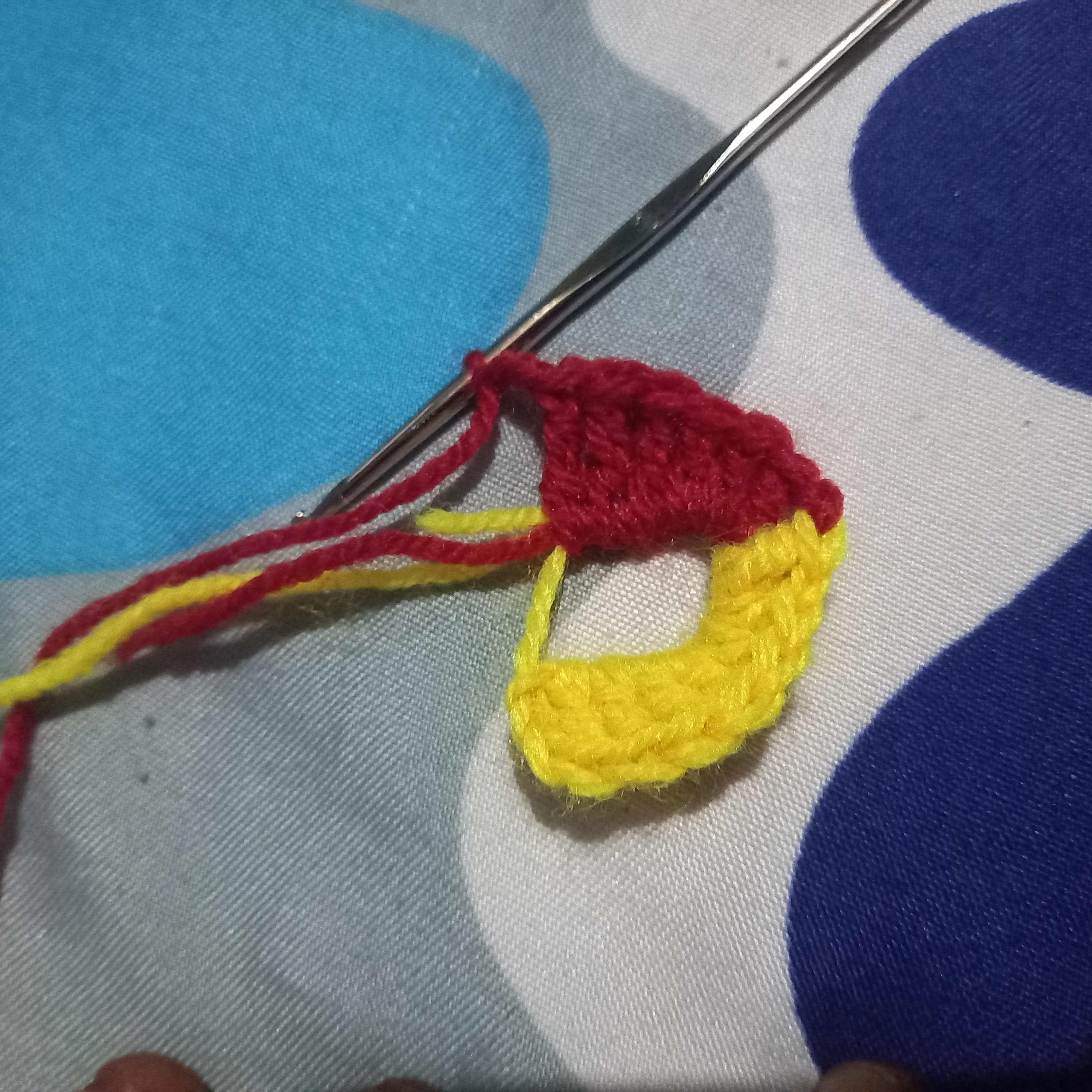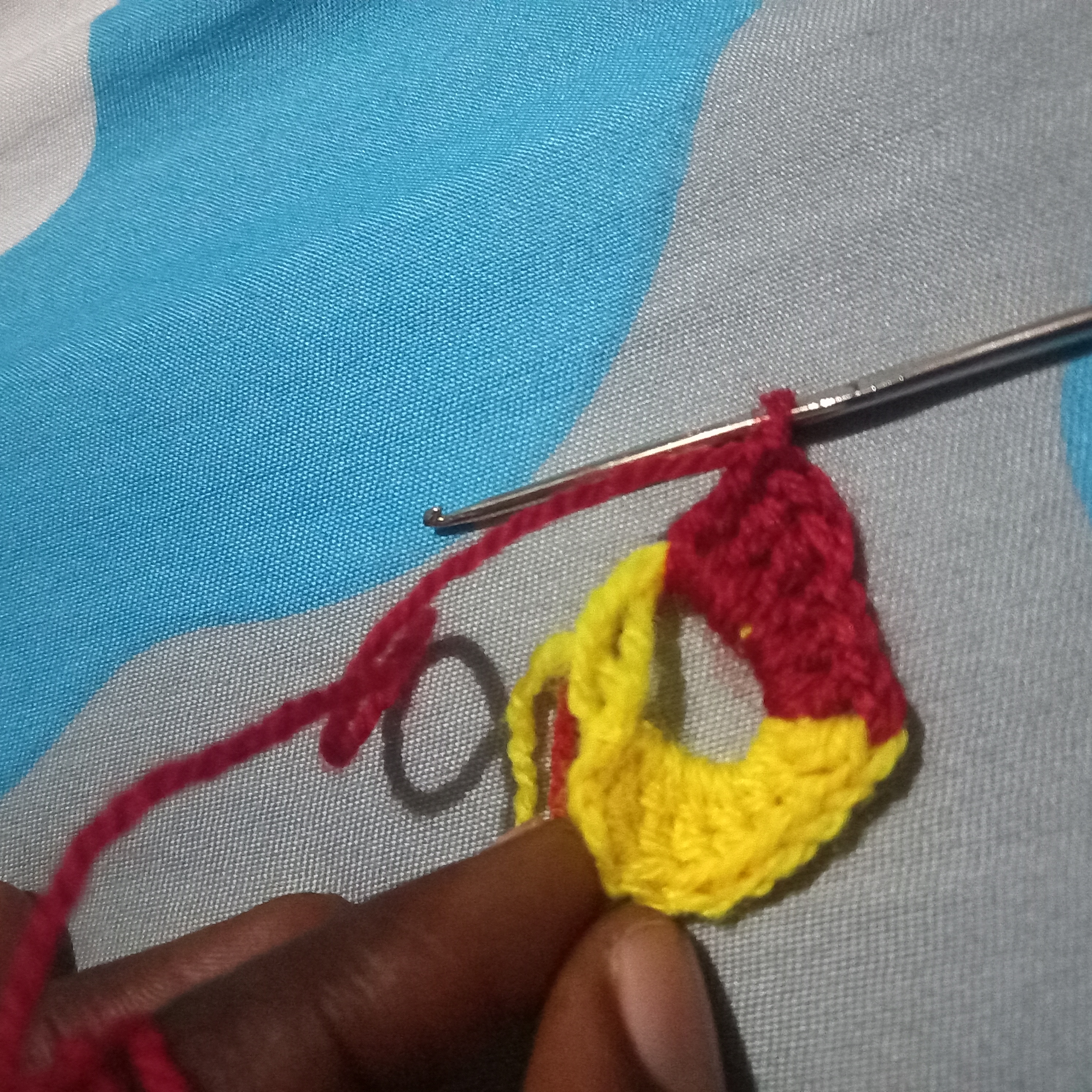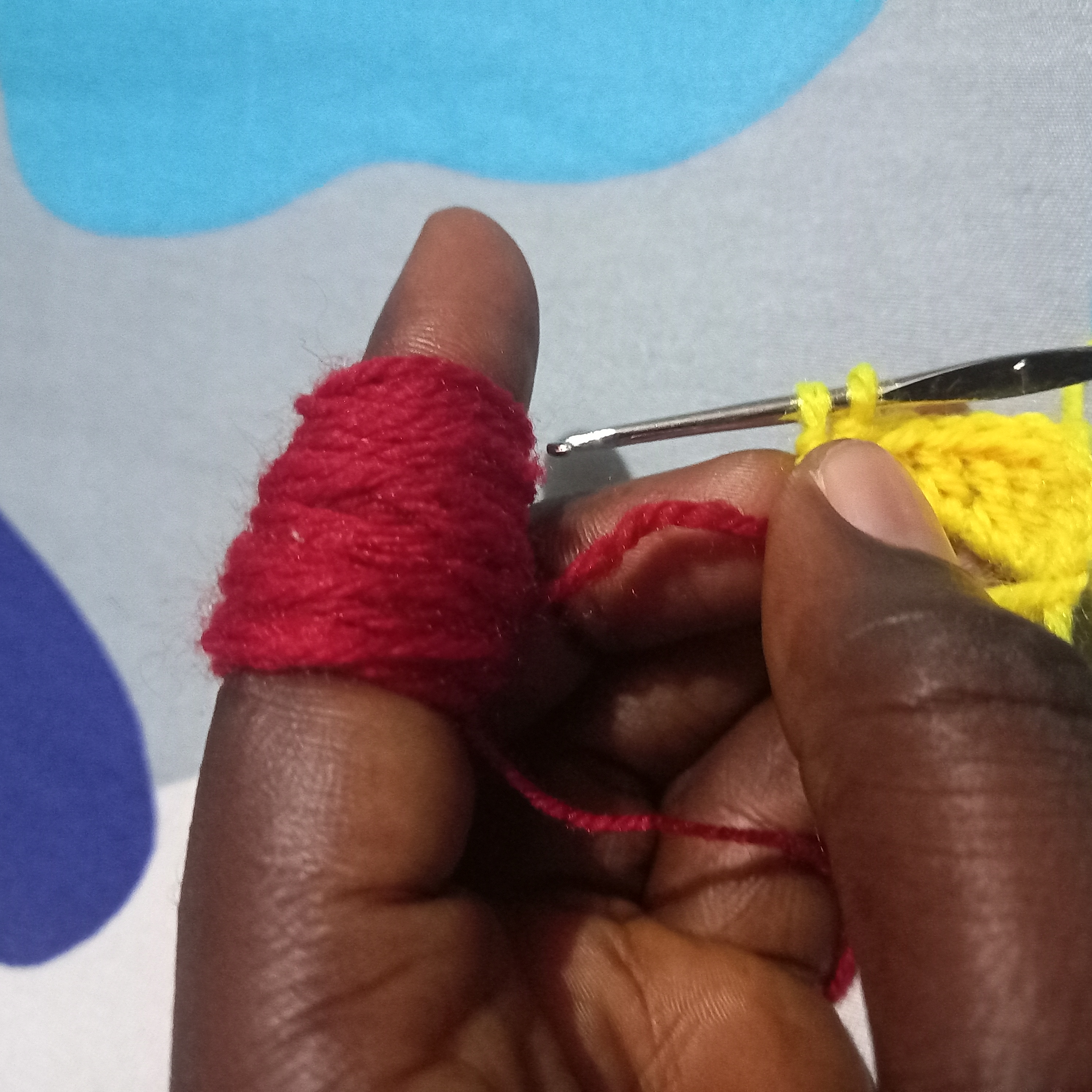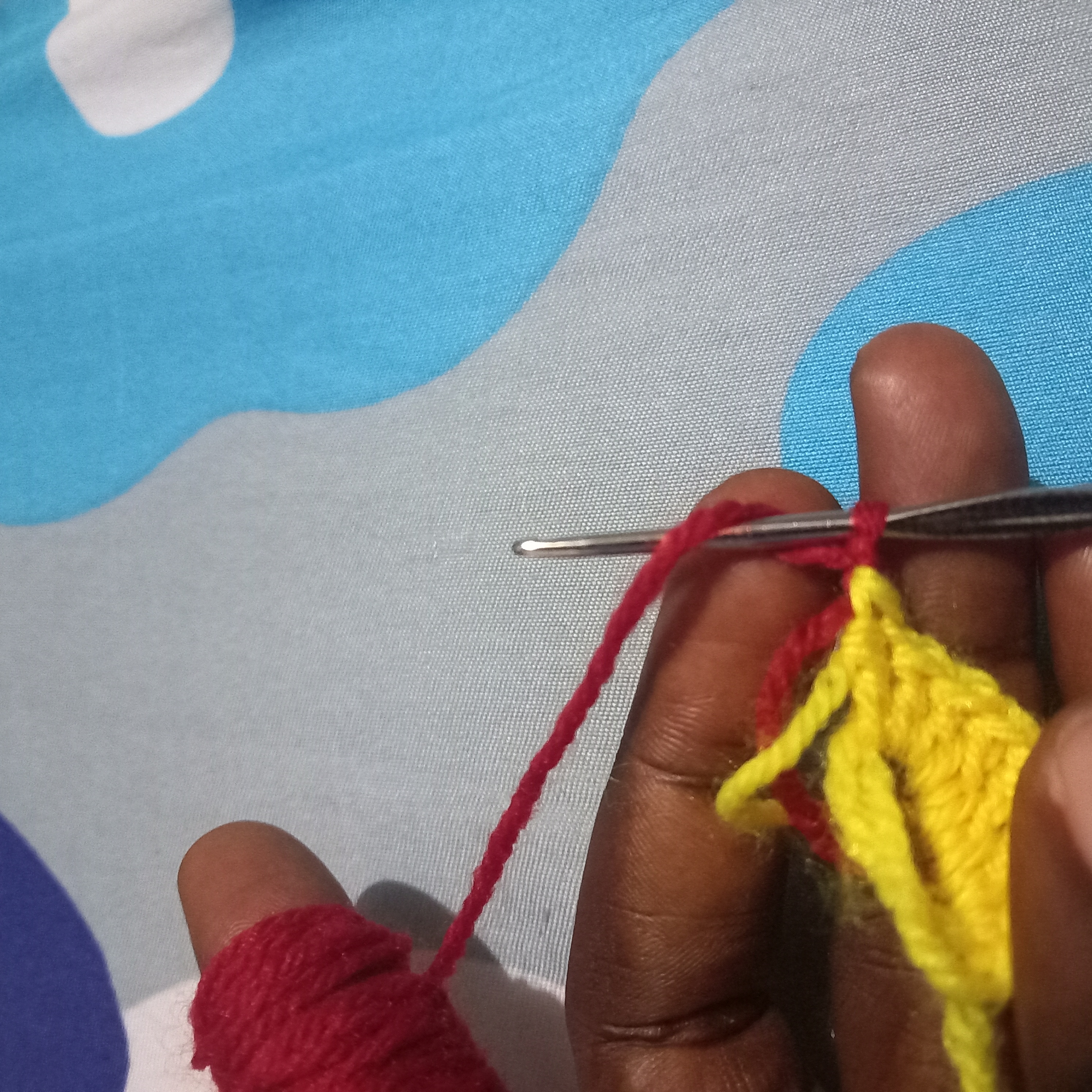 From there I will make another triple double crochet but this will be use to change the colours of the love. I will used the yellow wool to go through the first and second crochet and then in the last one I will use the red wool to complete it and that will automatically change the colour to red wool.
