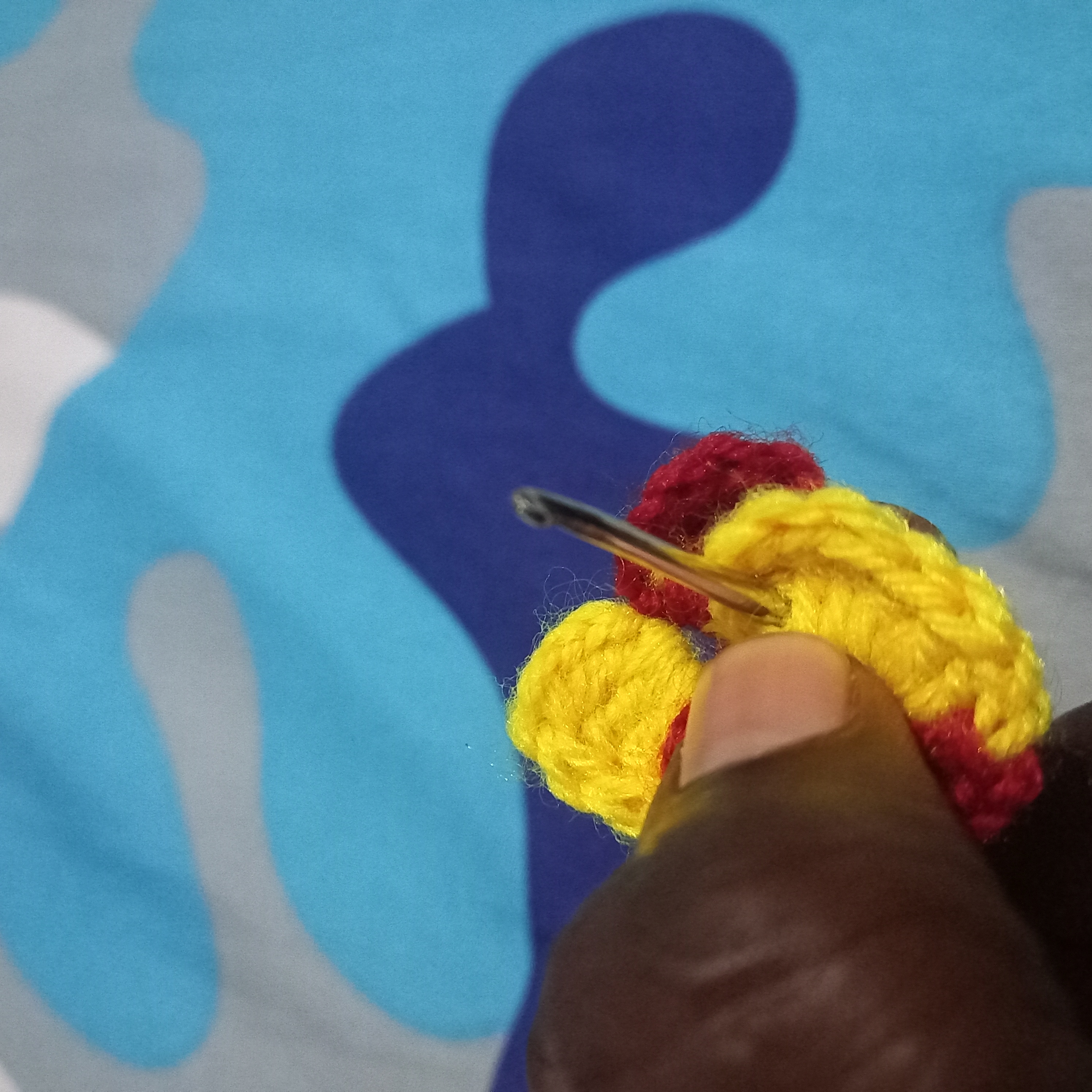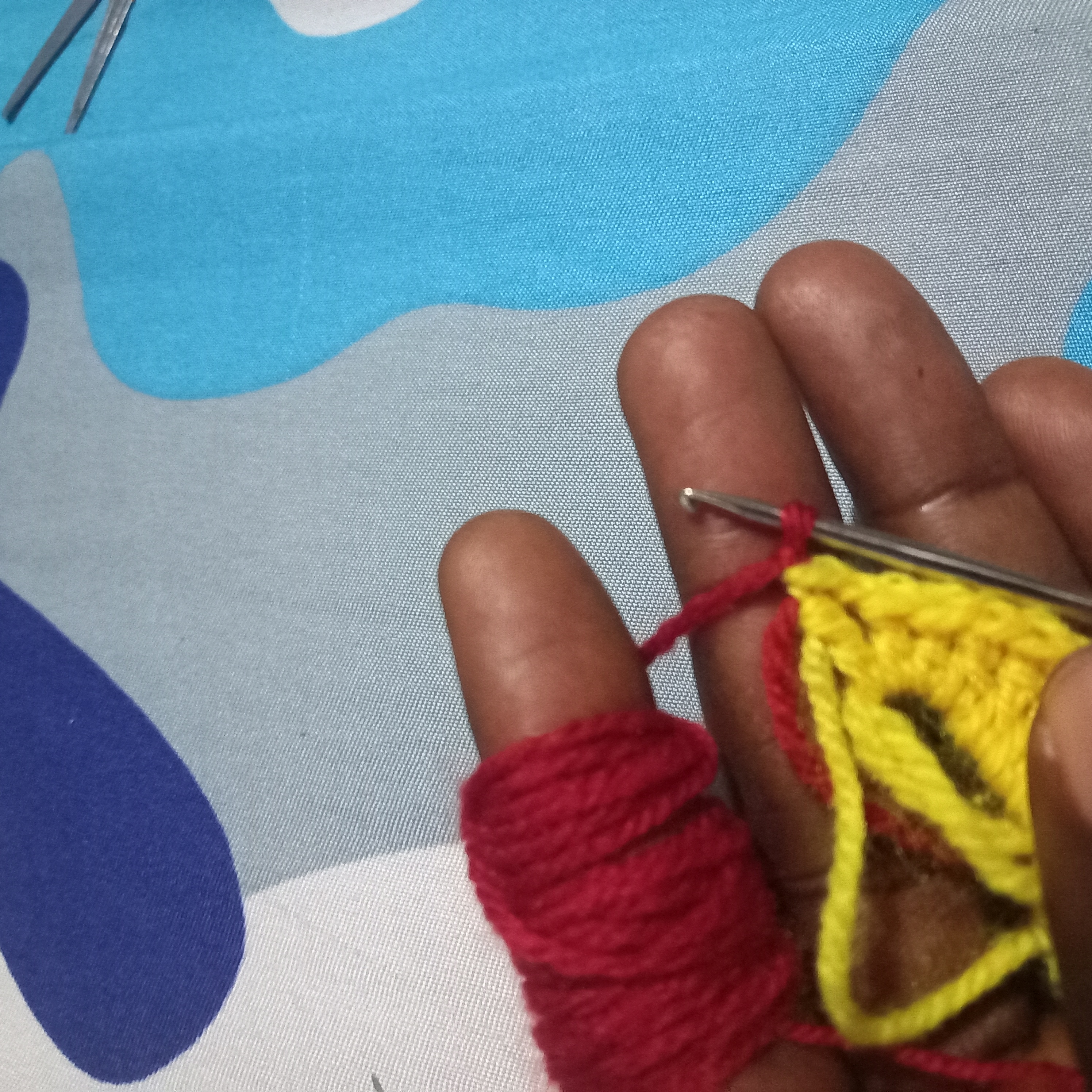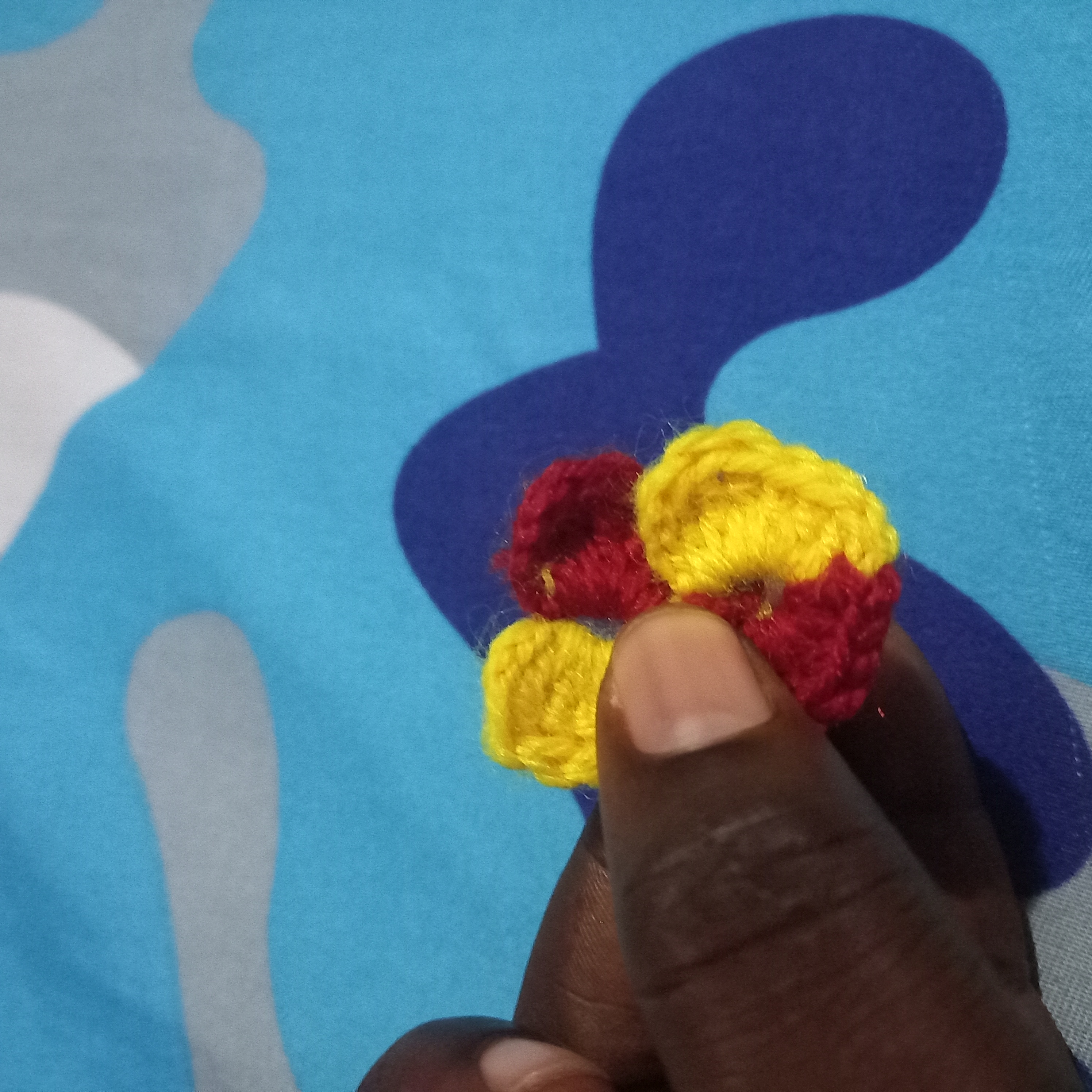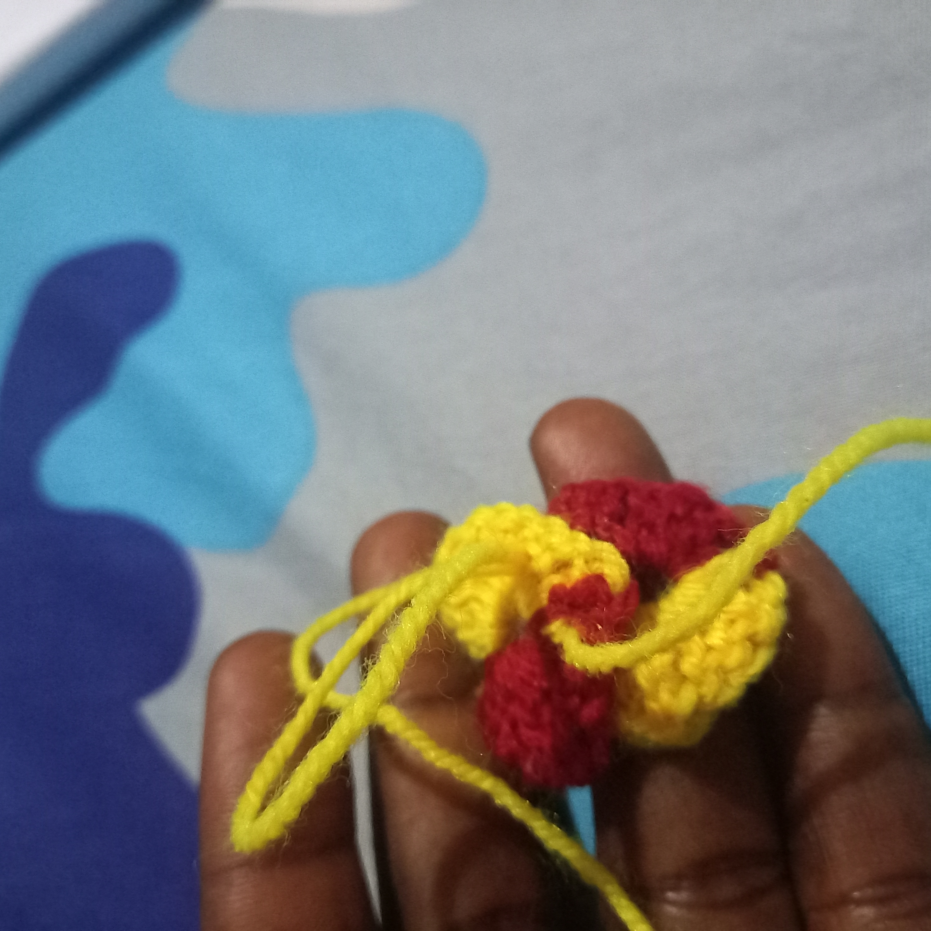 From there I will make another triple double crochet but this will be use to change the colours of the love. I will used the yellow wool to go through the first and second crochet and then in the last one I will use the red wool to complete it and that will automatically change the colour to red wool.