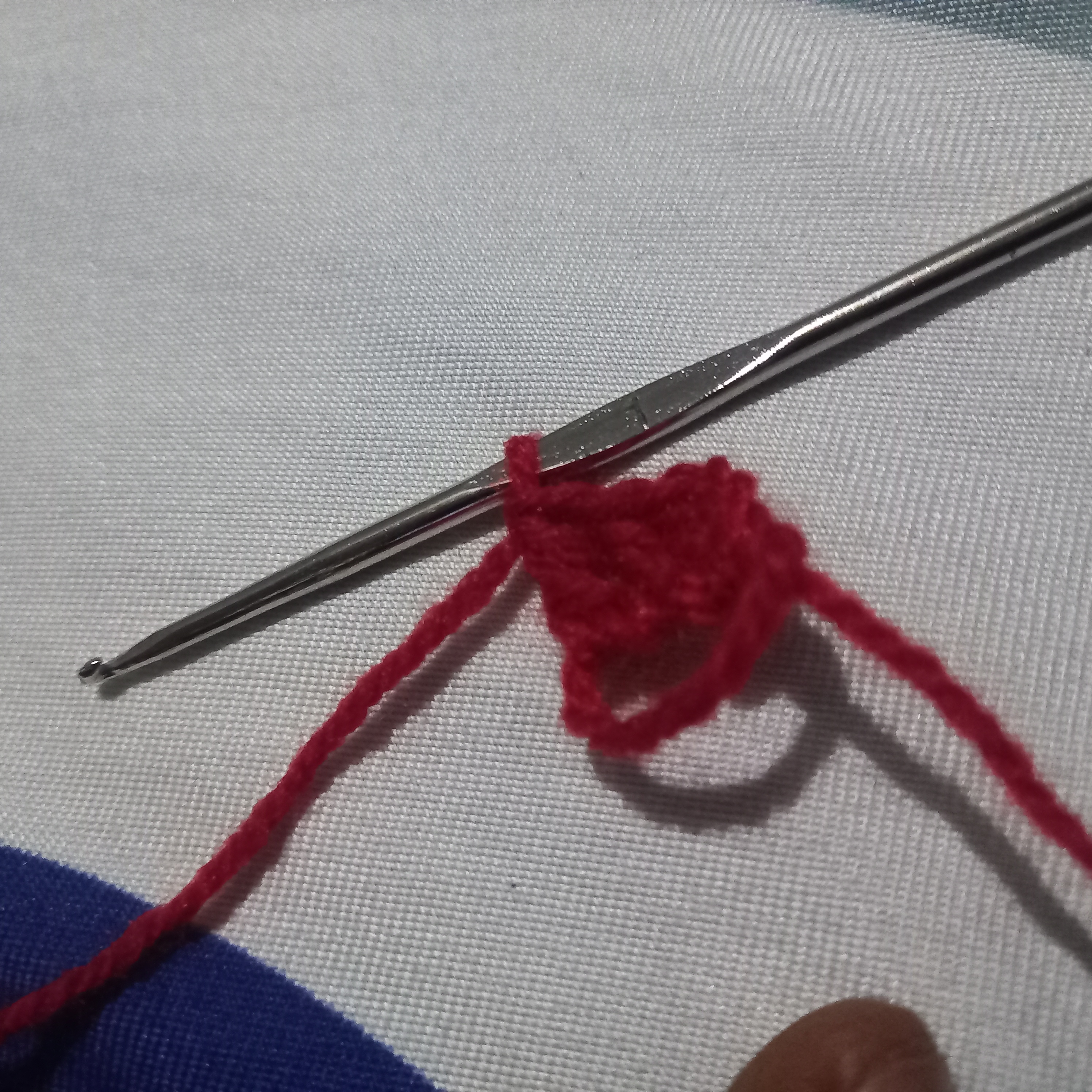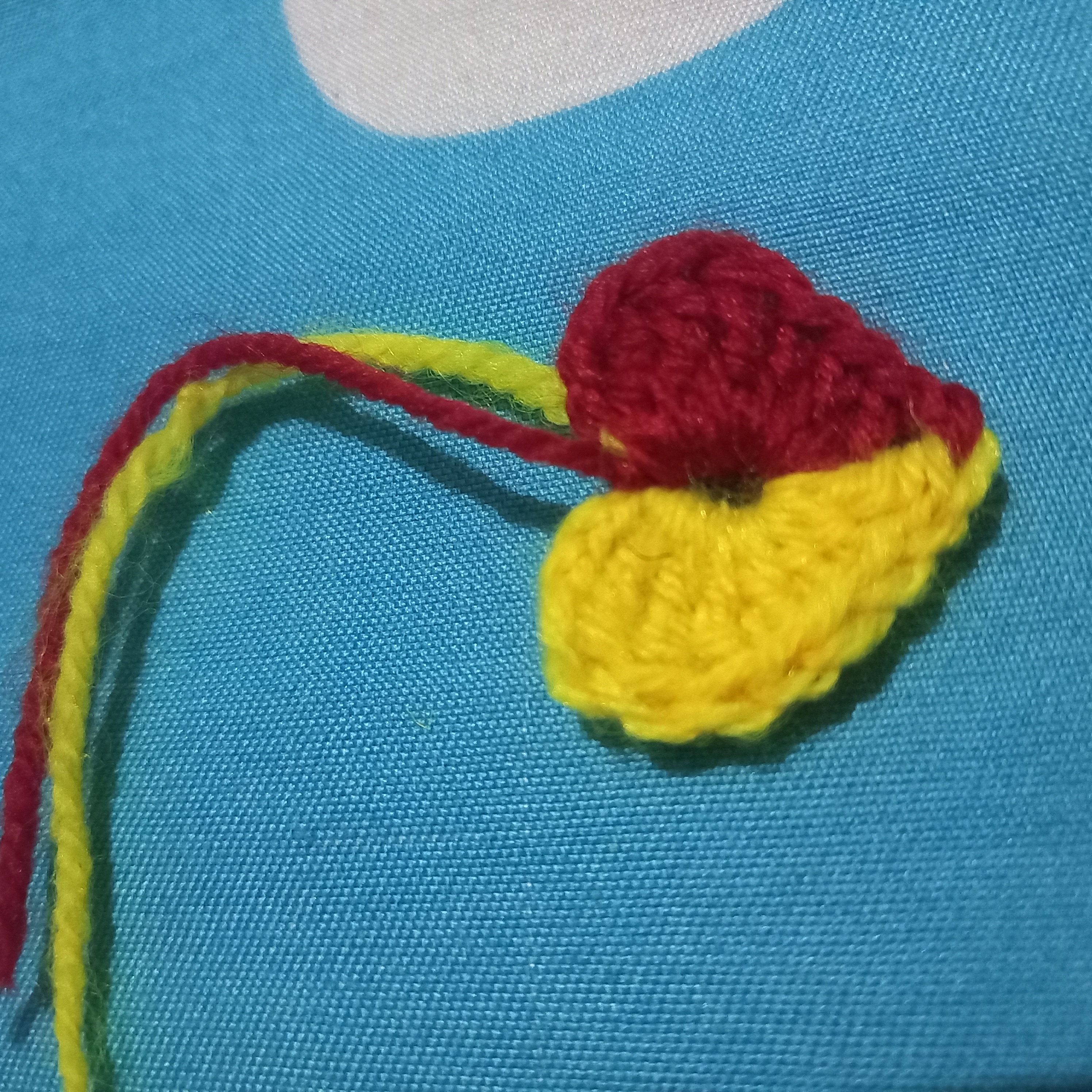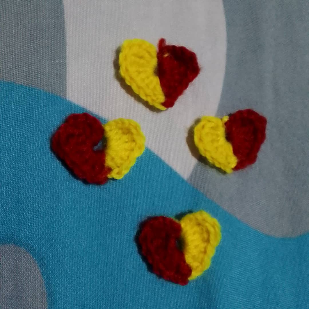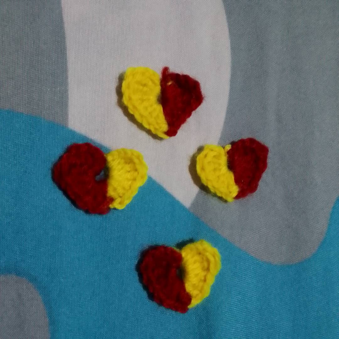 I will do three double crochet with the red wool and then I will also do three triple double crochet and a there single chain after the three double crochet so it could be the same with the yellow wool. And then I will slip stitch it. Try to pull out the yellow wool to make the magic circle a bit invisible to the eyes and creat the middle of the heart.