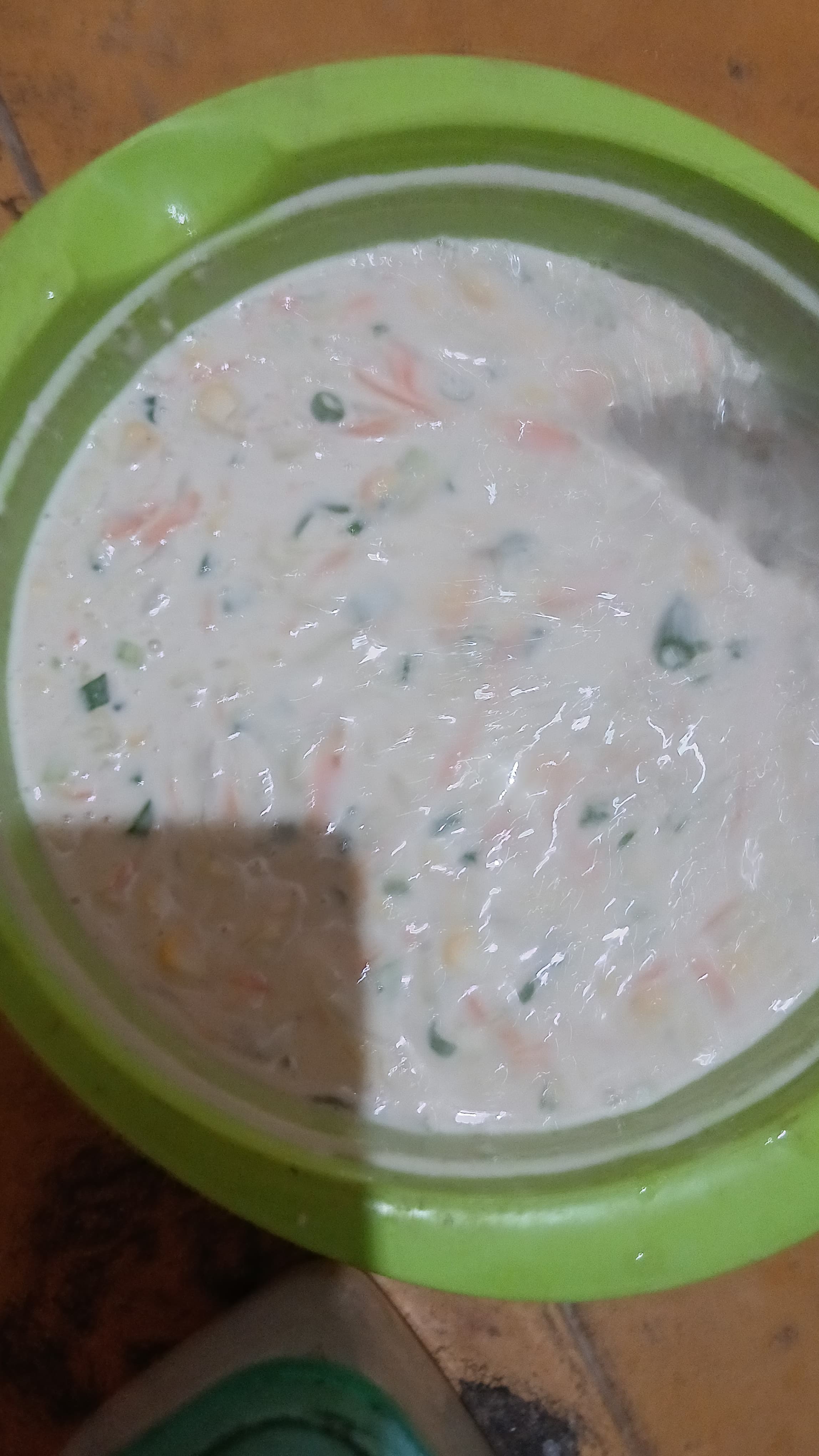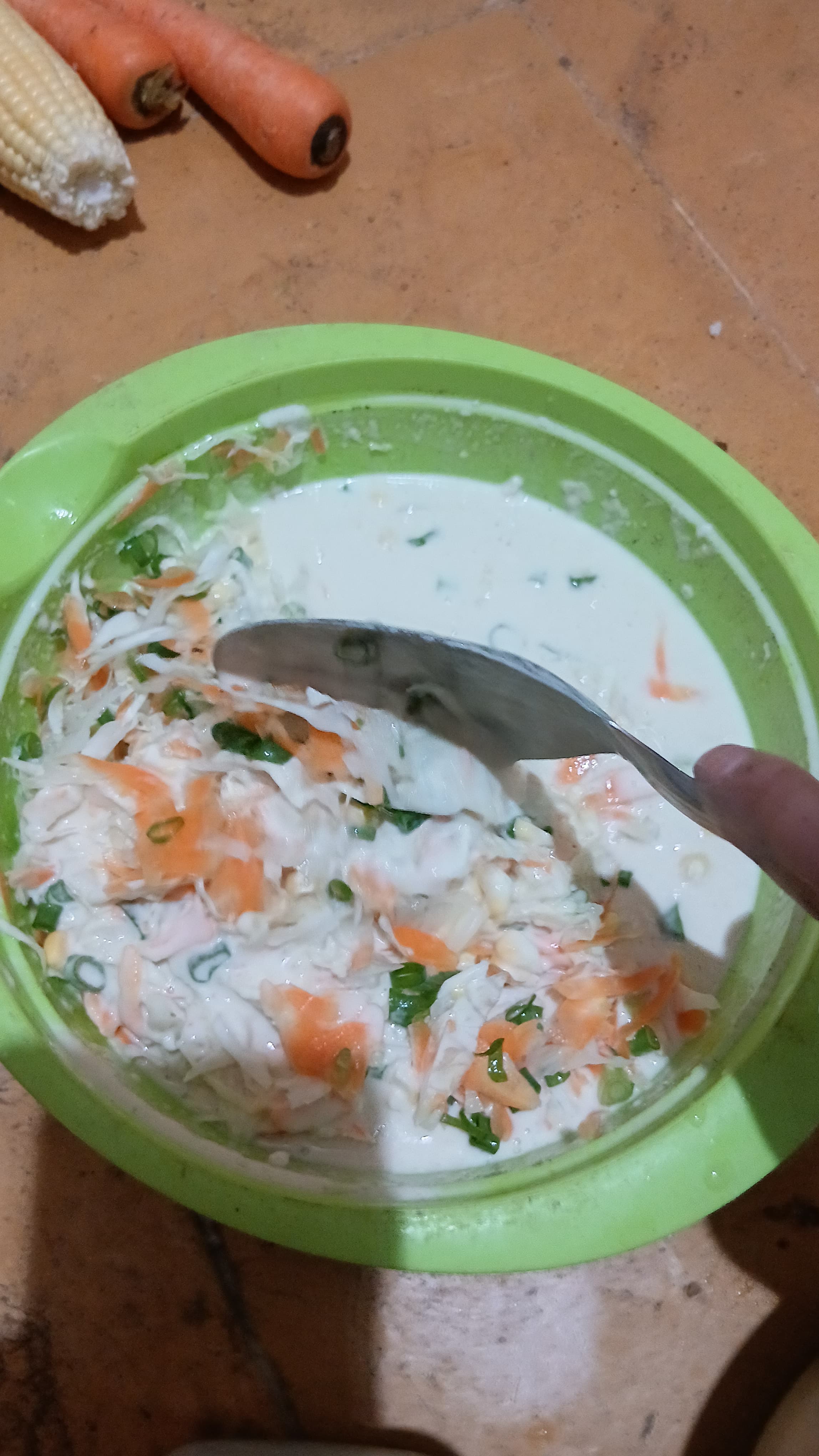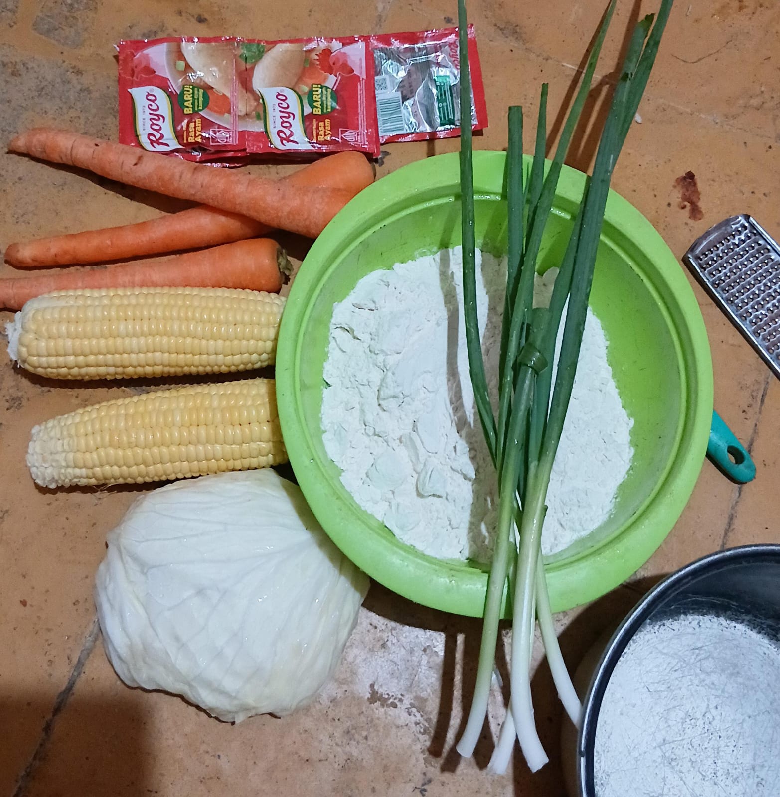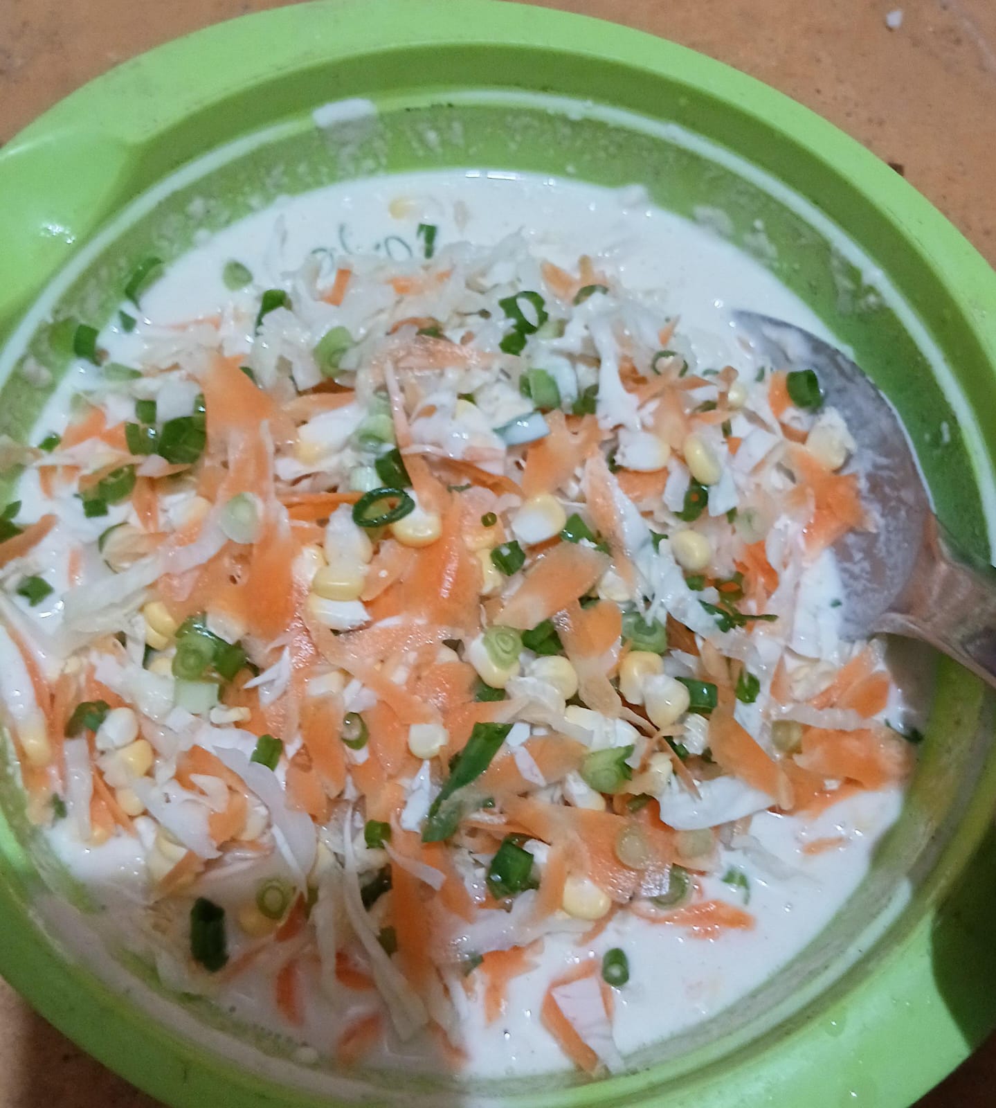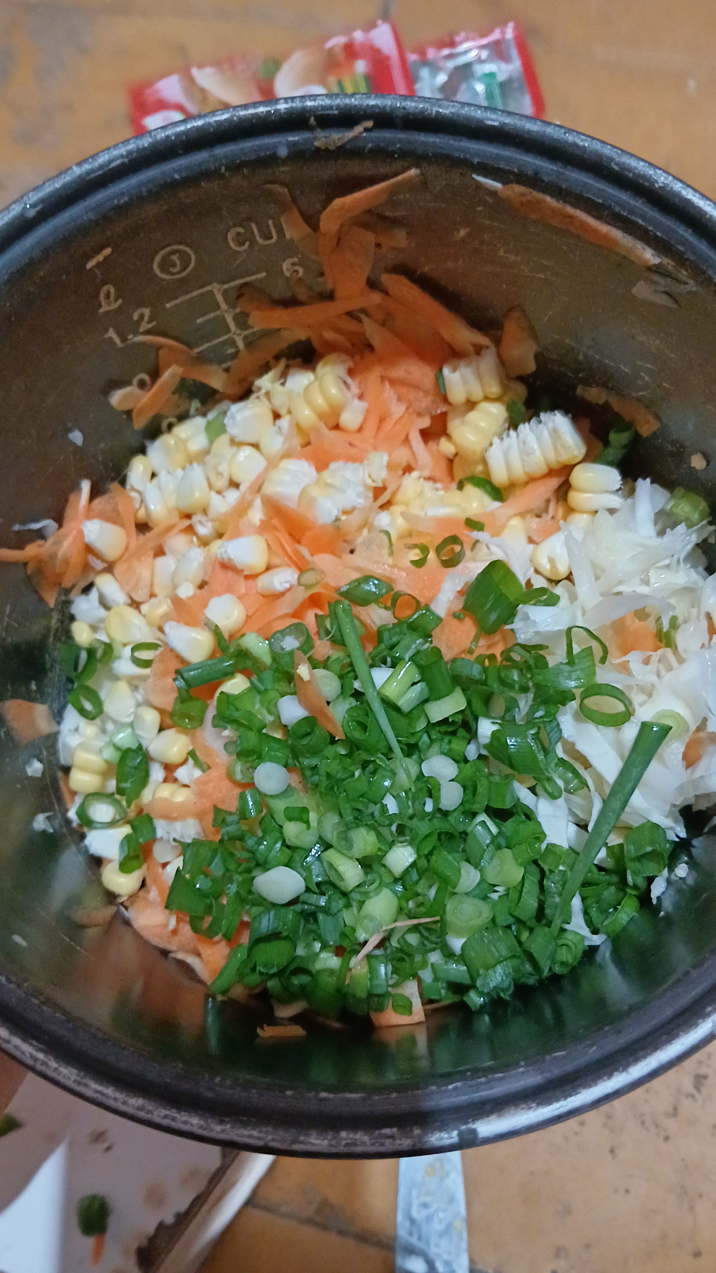 Cut all the ingredients: carrots, cabbage, corn, and spring onions into small pieces. For more details, see the photo below: