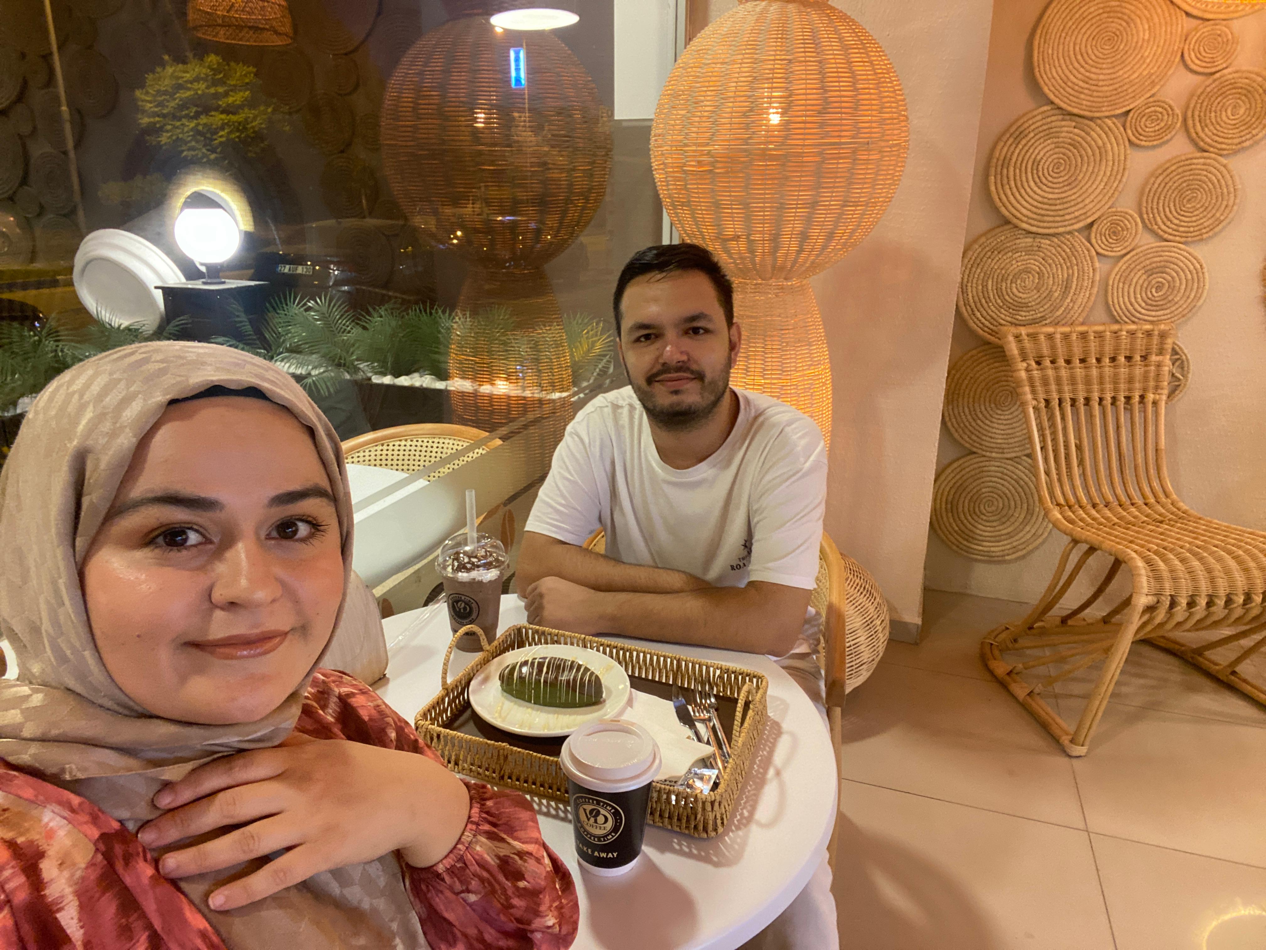 Birlikte bir selfie, yine hem Hive hem de sevdiklerimize göndermek için. Burada birkaç saat oturduk ve sohbet ettik. Kafenin ambiyansı ve müzikleri de çok iyiydi. Ses çok yüksek değildi, o tarz yerleri sevmiyorum. Ben biriyle oturup kahve içerken sohbet etmeyi seviyorum, son ses müzik dinlemeyi değil. Buraya birkaç defa daha geleceğimize eminim. Farklı tatlılar ve farklı kahveler deneyeceğim. Milkshake çok güzeldi, eşim de çok beğendi. Bazen klasik şeyleri içmek ve risk almamak en iyisi oluyor. En azından ilk sefer için. Bir seferinde bir kafeye gitmiştim ve orada farklı bir şey denediğimde karnım çok ağrımıştı. Belki içtiğim şey bana dokunmuştu belki de kafenin kahvesi güzel değildi bunu asla bilemedim. Bu yüzden ilk gidişimde her zaman klasik denemeye karar verdim.