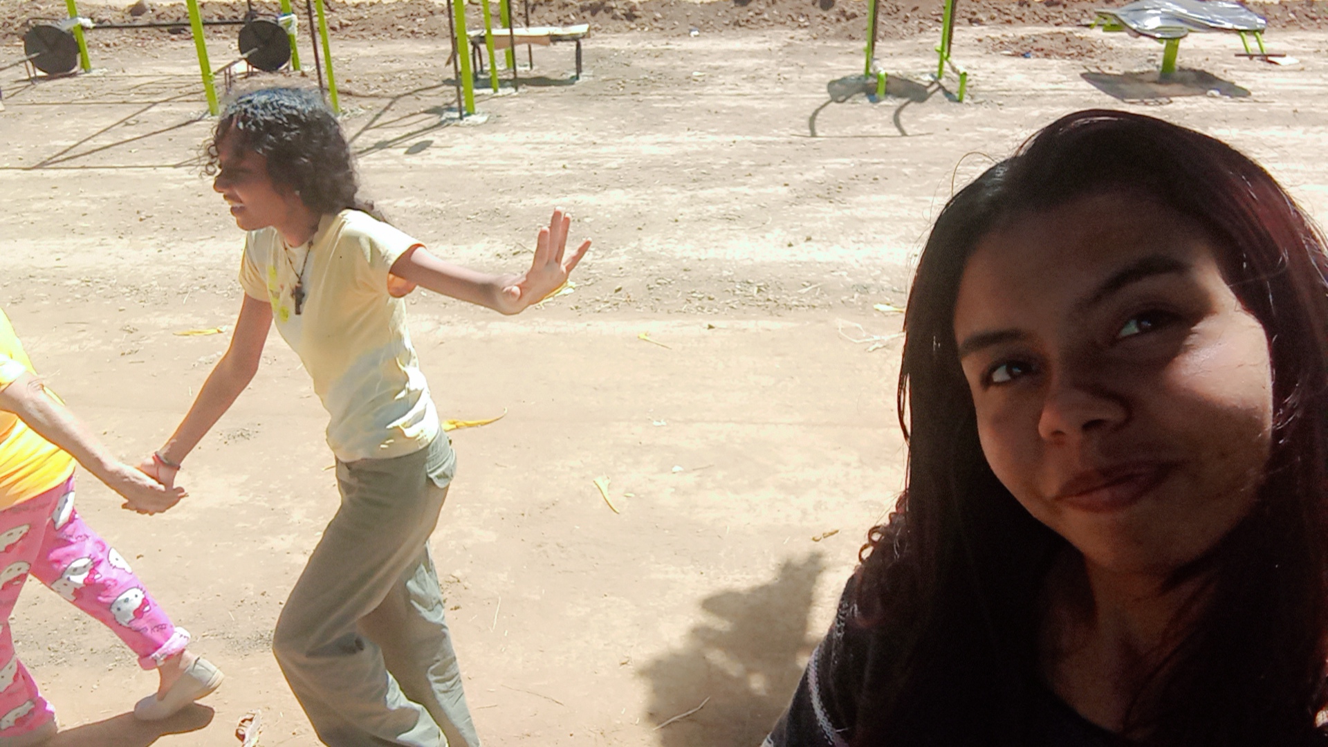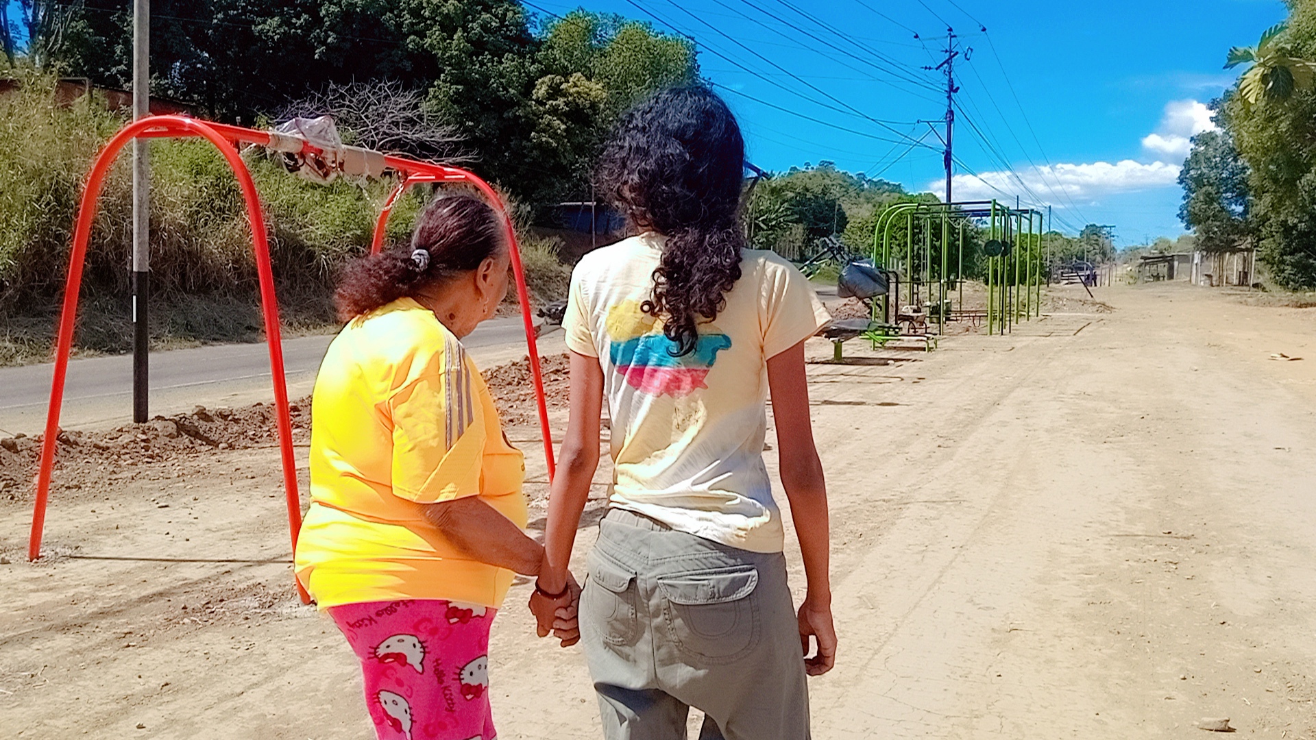 So, well, today we took advantage of the opportunity to move our legs a bit more than usual. We saw some trees and flowers, and we laughed for a while with my grandmother as we chatted. My mom even joined us later for the short walk and some games, so it was quite enjoyable, even though the sun was very strong. But we made up for it with the fish soup and the fact that my uncles had caught a guabina (a type of fish) at a nearby waterfall. Now we just have to wait for the space to officially open so we can try out the various exercise equipment and see how it is, since we also saw some abdominal machines that I think would be fun to use.