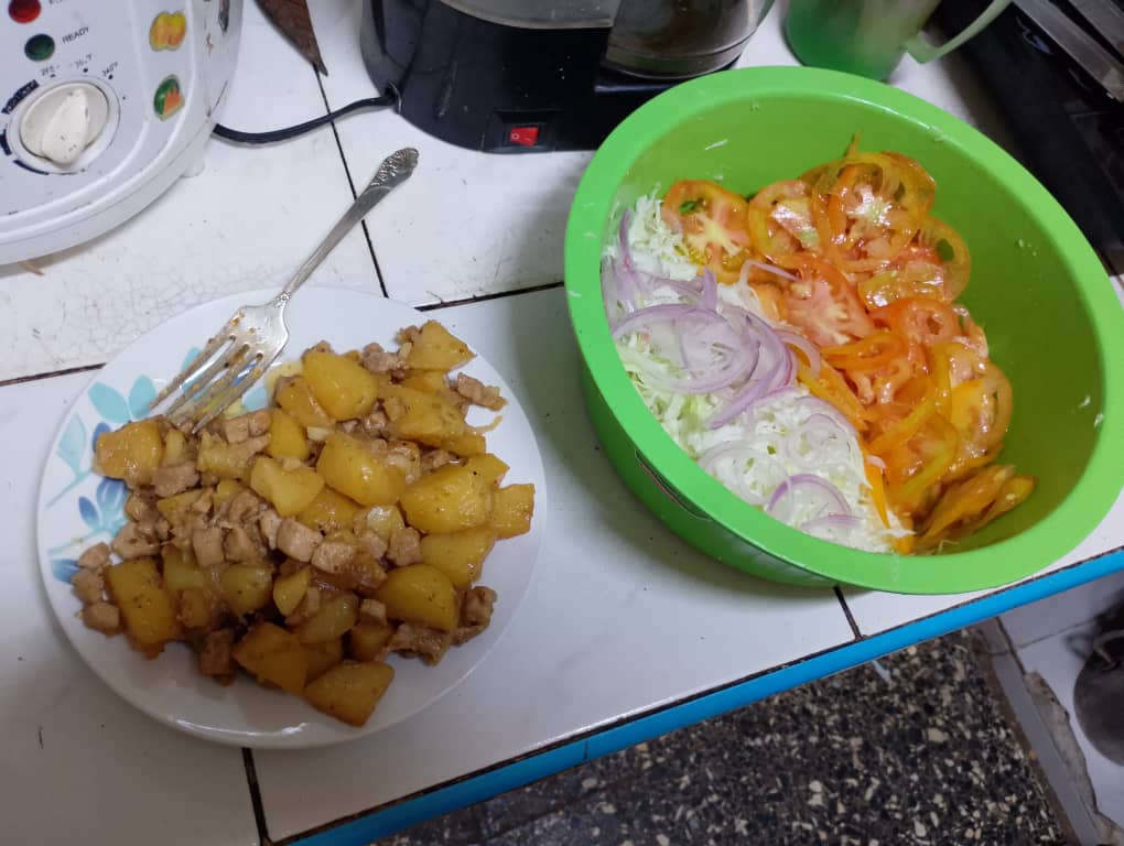 At home, I whipped up a super healthy plate: 🥗 Fresh tomato, cabbage, and onion salad (crispy and fresh, just like abuela used to make). 🍗 Chicken with potatoes on the side, because protein is life!