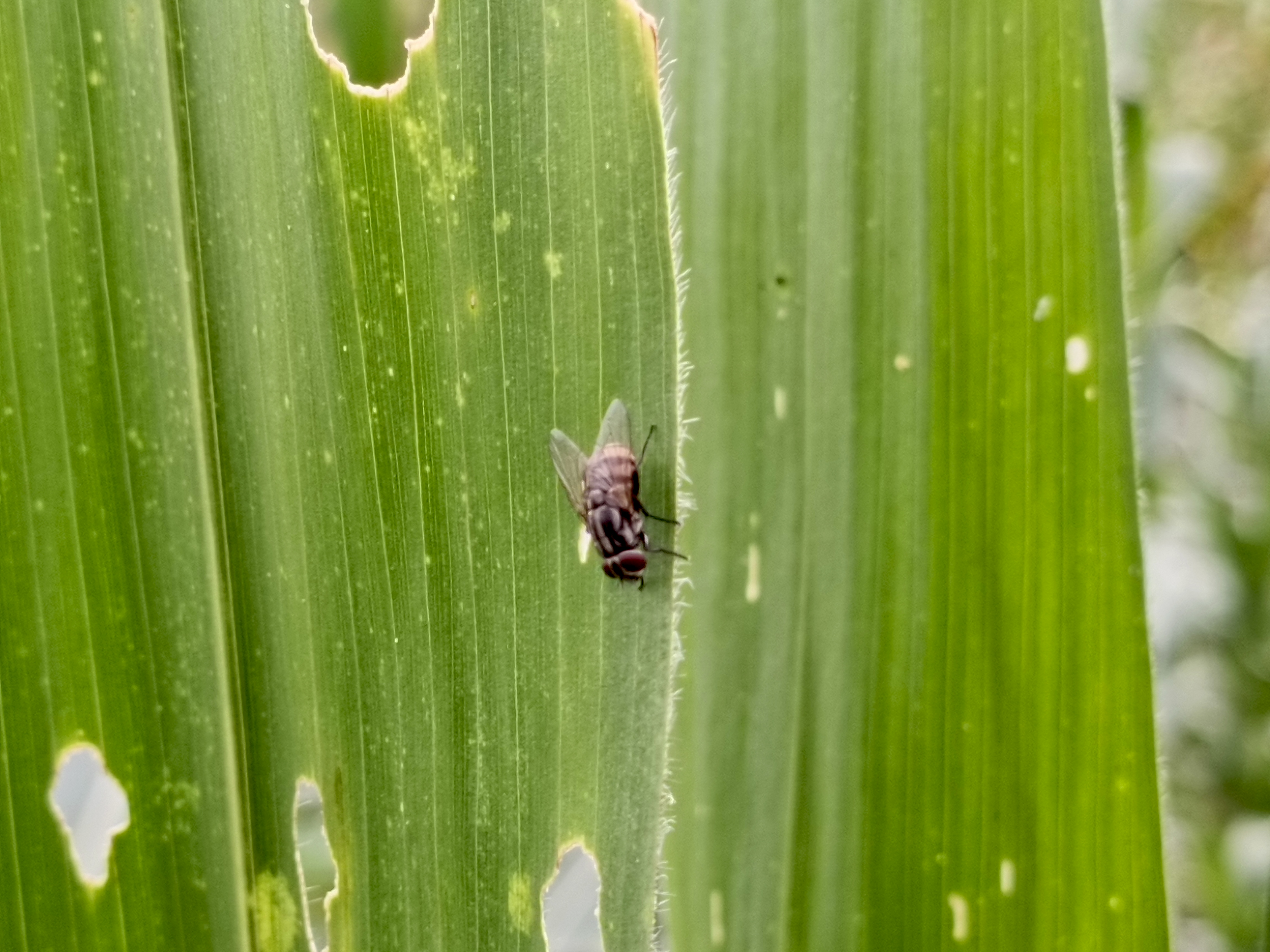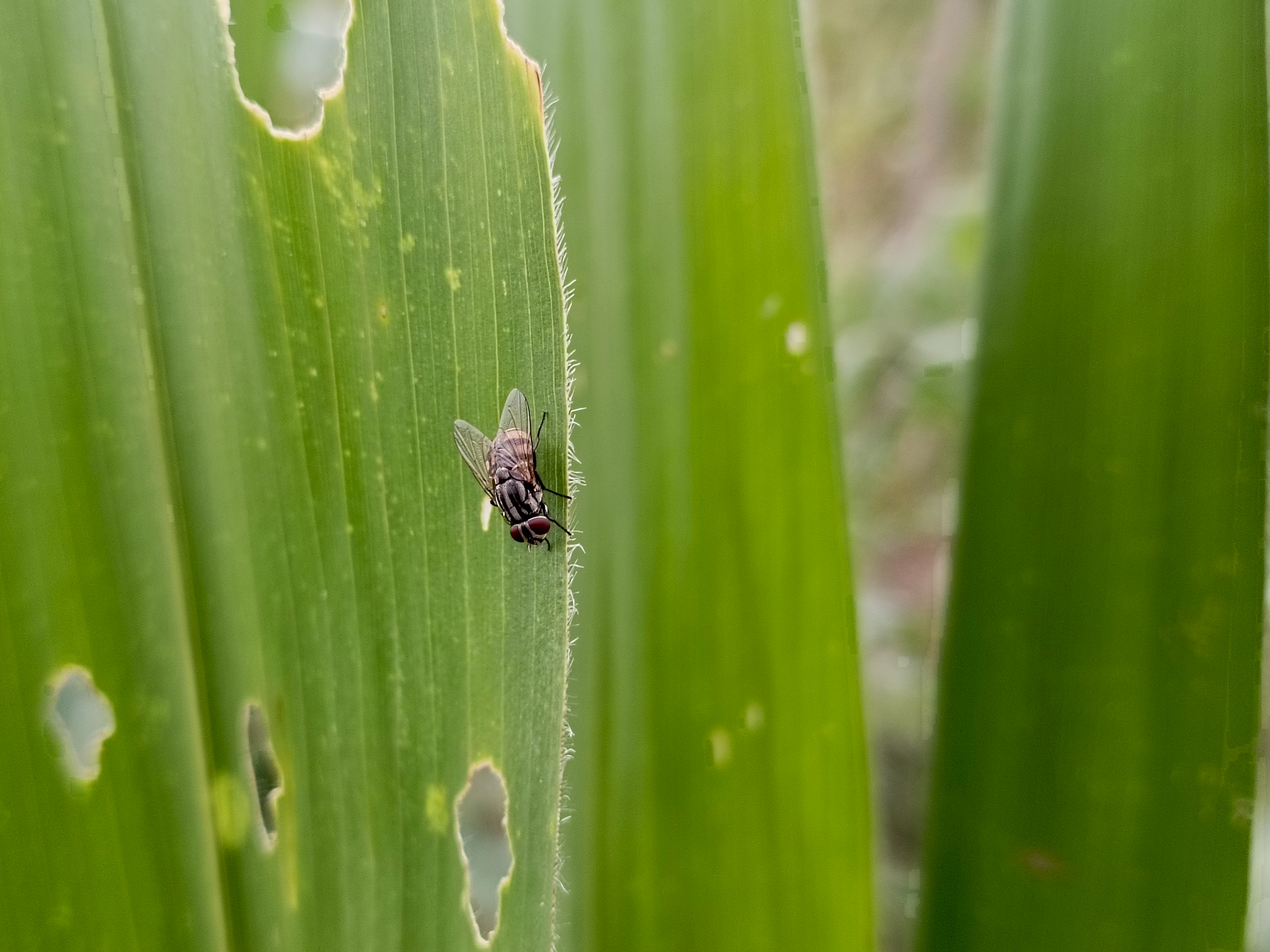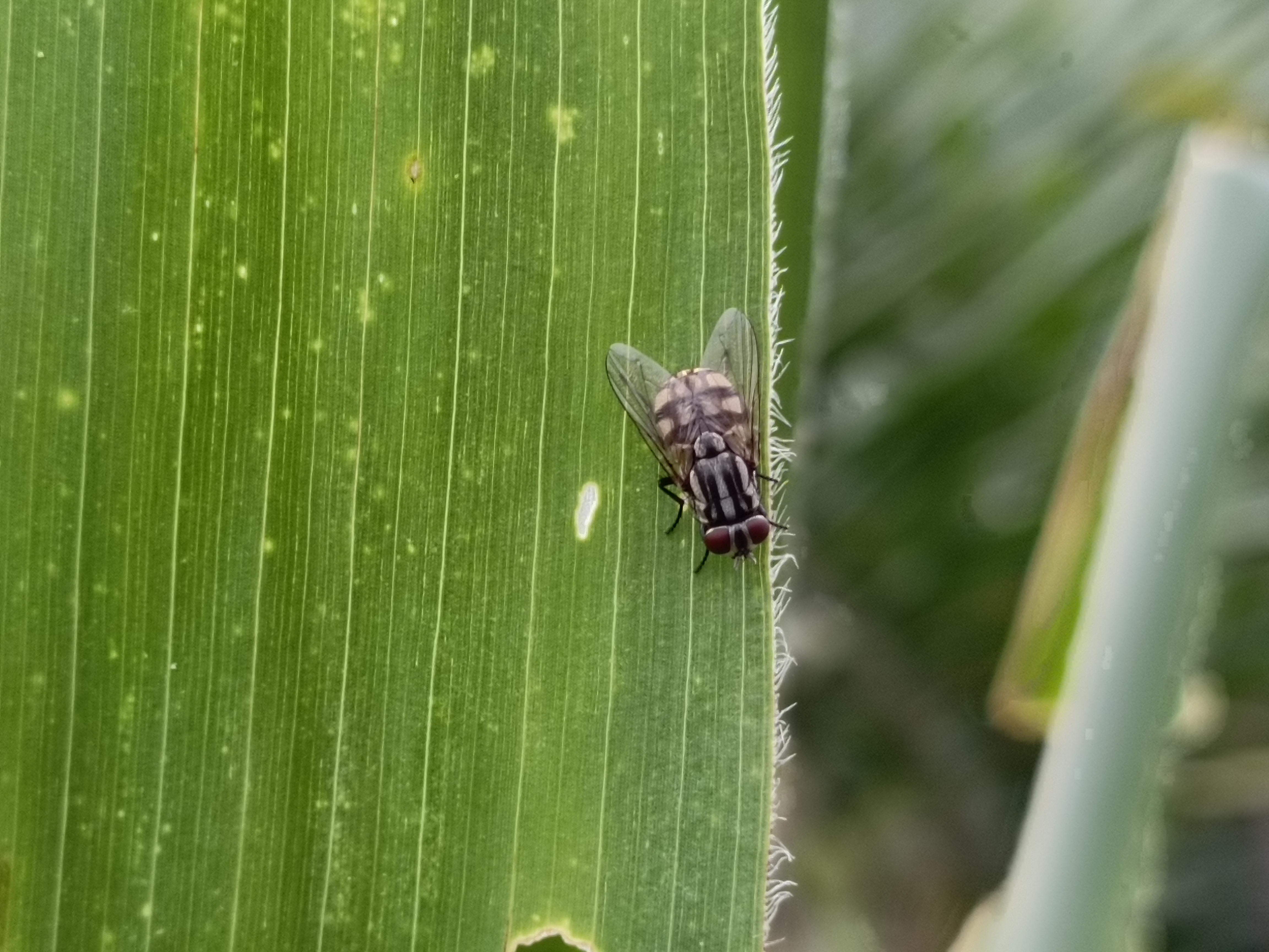 So, I took this picture of a fly in a corn field. I saw many insects flying on the leaves, and one of them was a fly. That's why I took this picture of a fly. This fly didn't fly away and landed in place, allowing me to capture some of the images we see now.