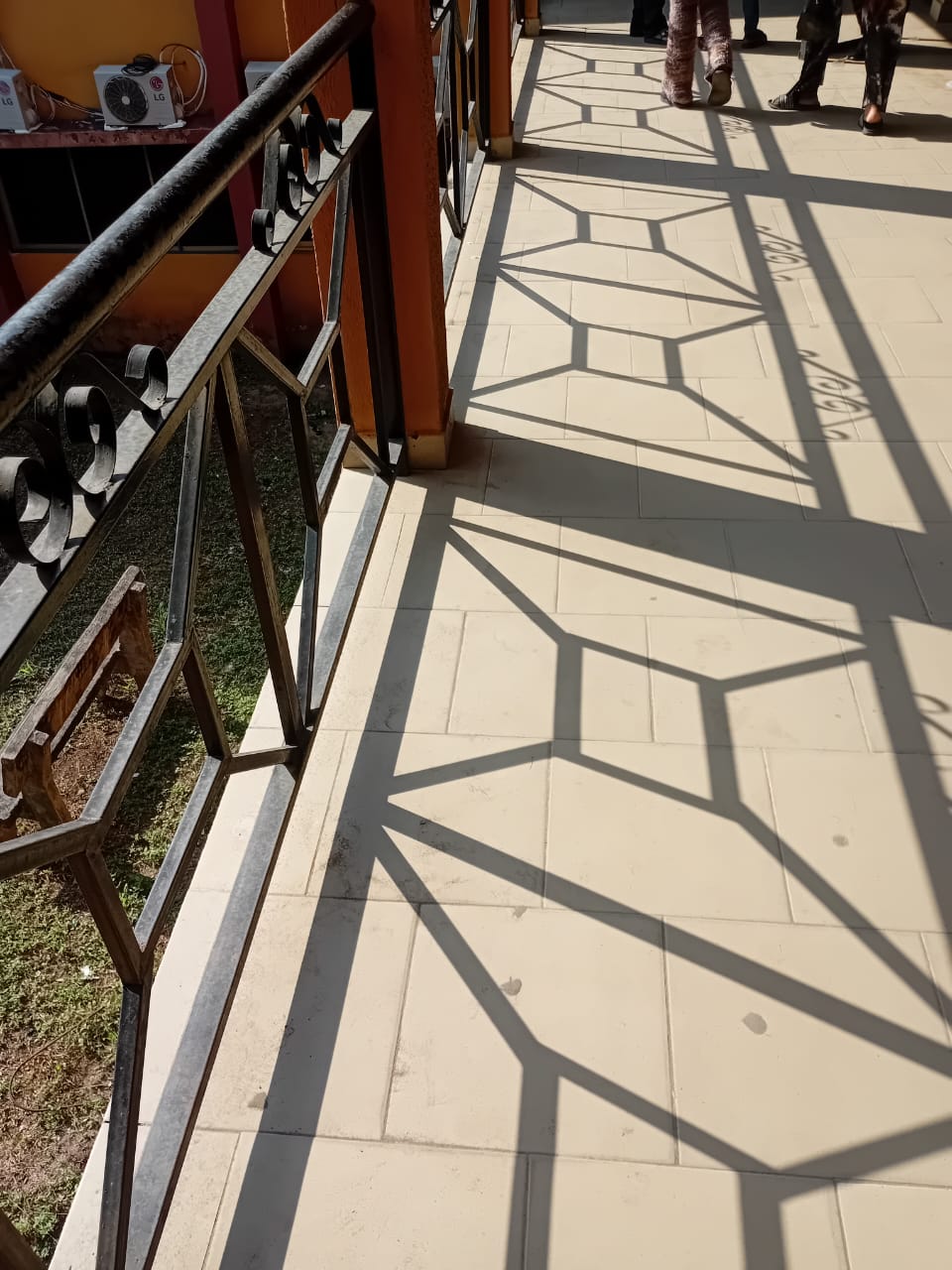 Before I could trek from my house to school, it was already 7:40am. The lecturer has already closed up the class door. So, I had to stay outside with my coursemates who also came late. While sitting, I noticed that the sun shone so well that the rails shadows reflected so well on the floor.