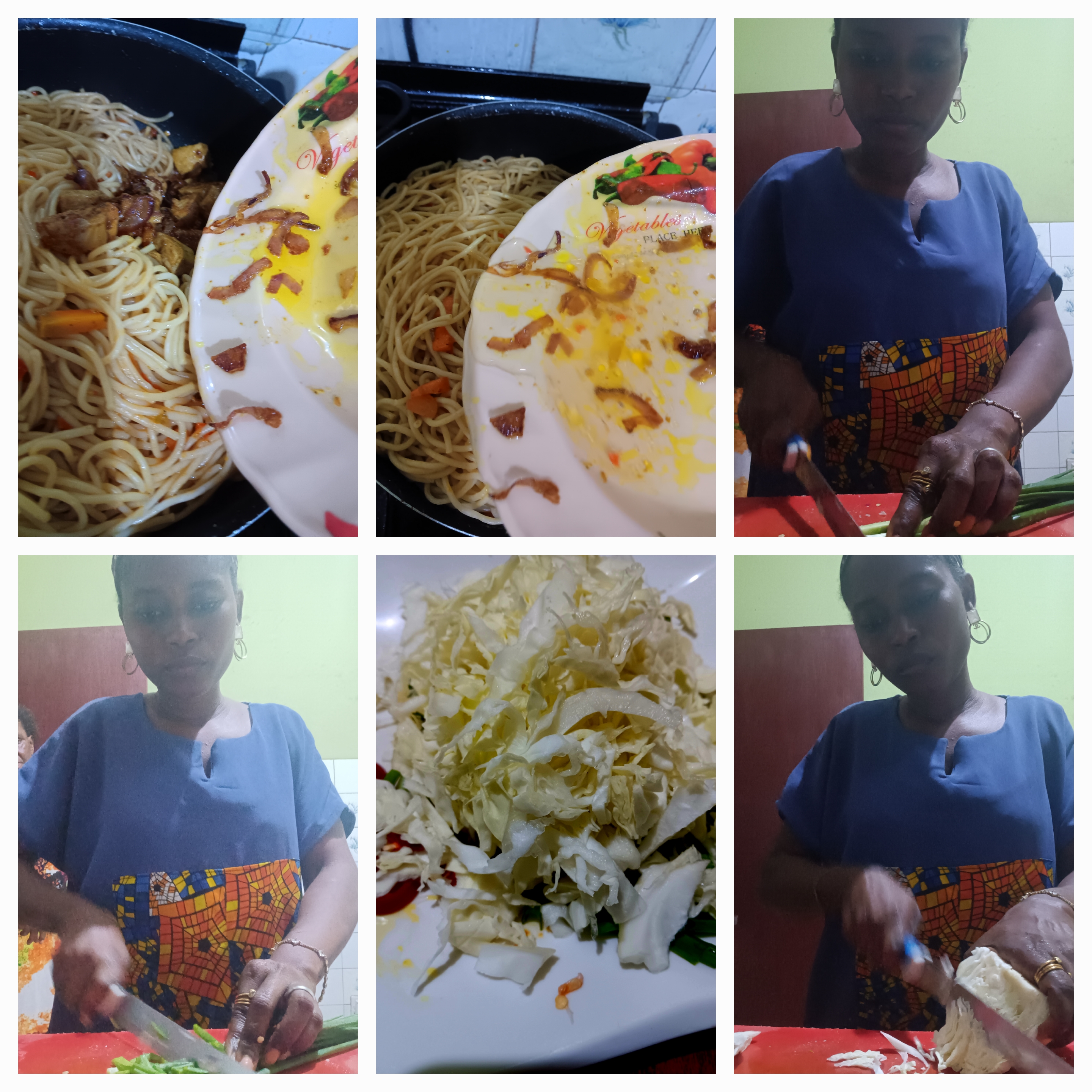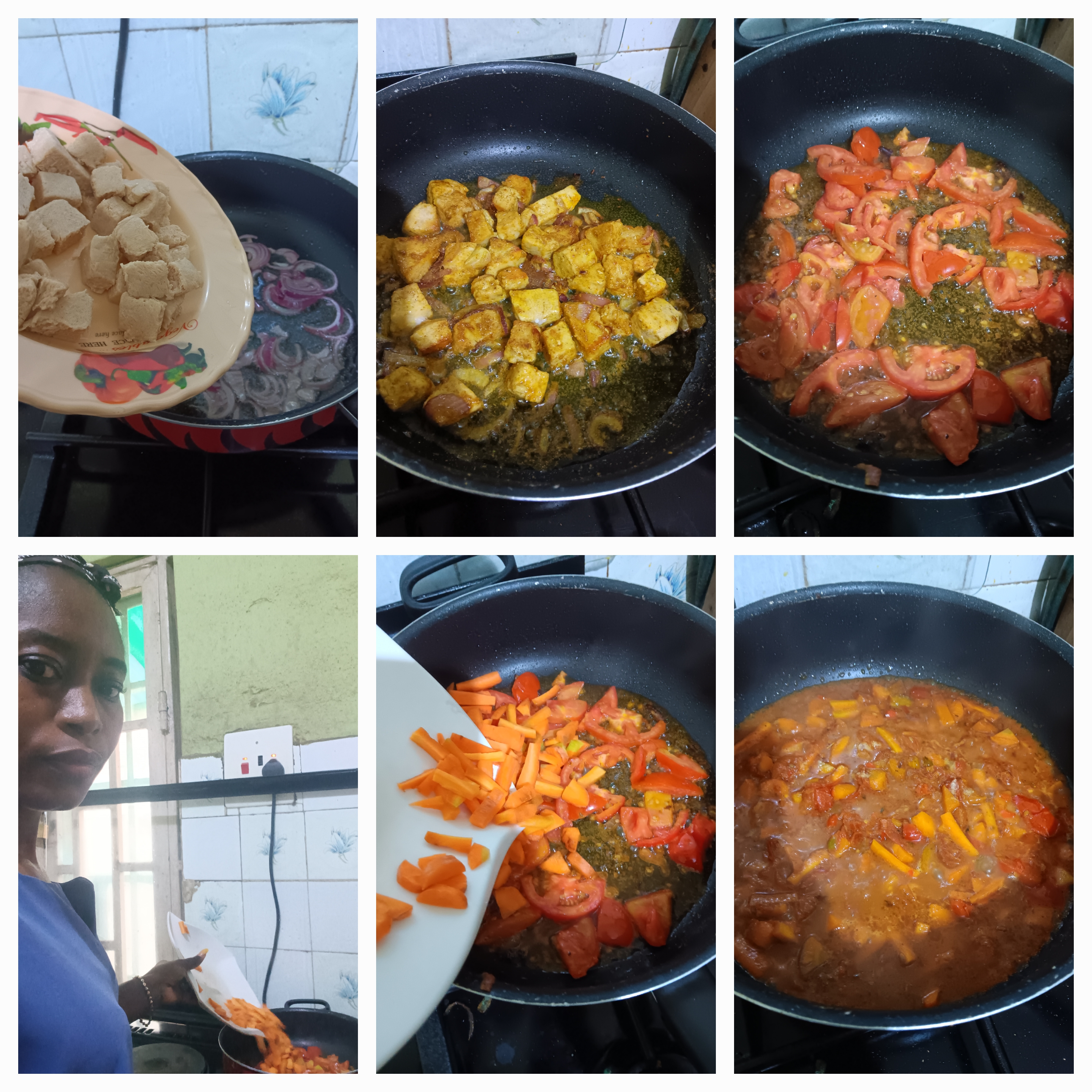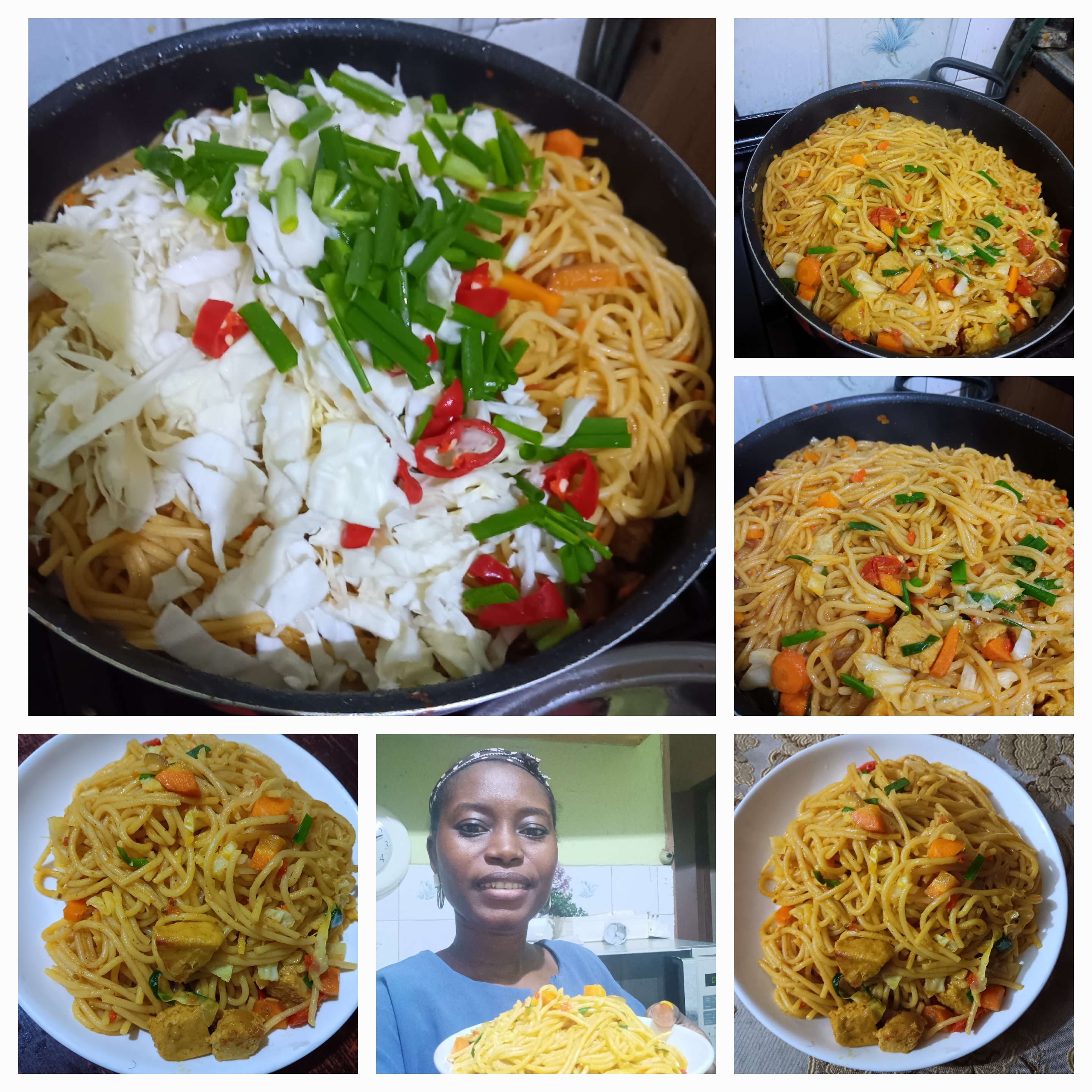 After removing the chicken burgers, in the same pan, add the tomatoes and carrots, peppers and seasoning cubes and all spices. Fry well and add the precooked pasta. Stir very well and add allow to cook on a low heat for 3 minutes.