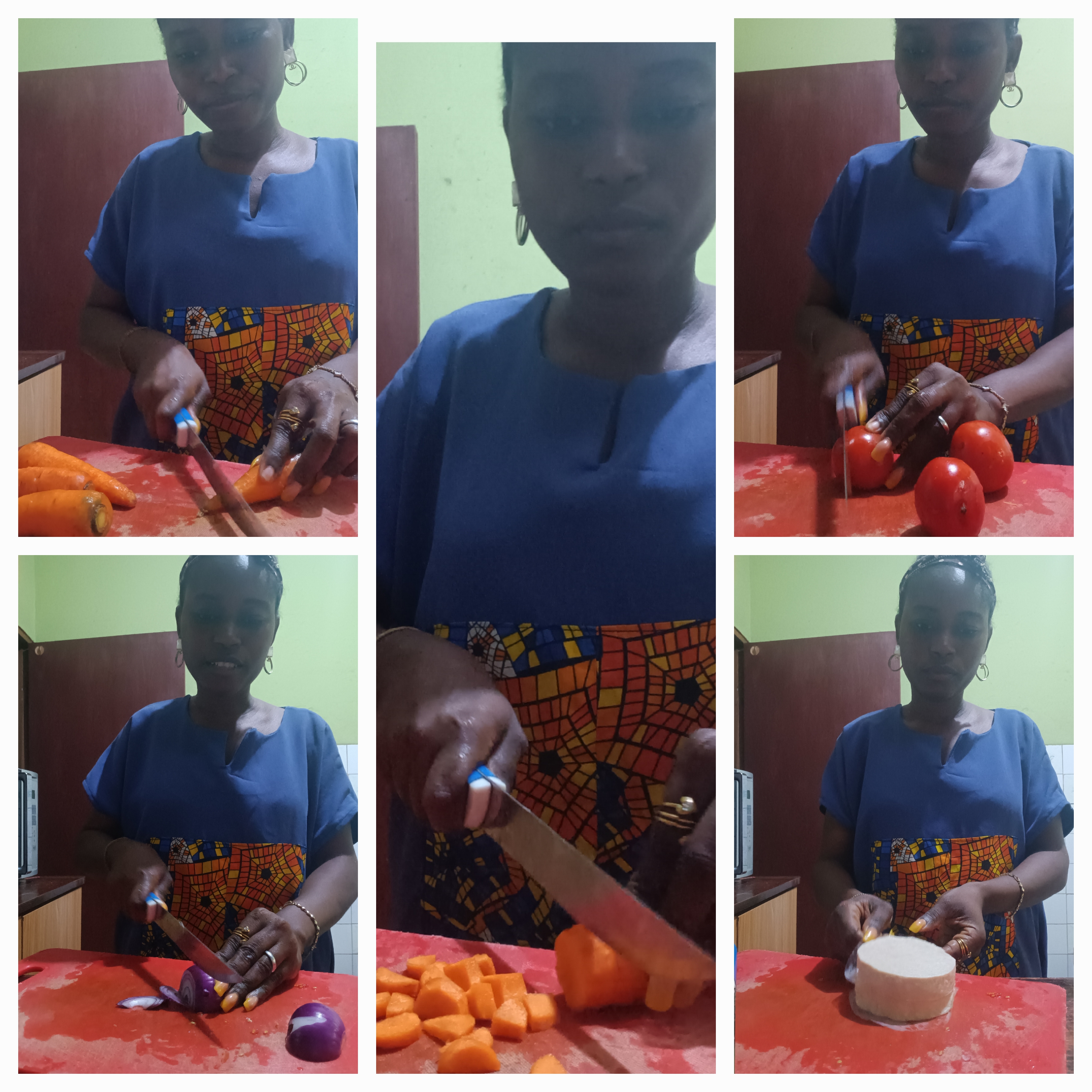 Chop carrots into cubes. Slice tomatoes, onions, and peppers. Take out chicken burgers from the freezer and separe. Remove the lylon seel from the middle and chop into cube biteable sizes.