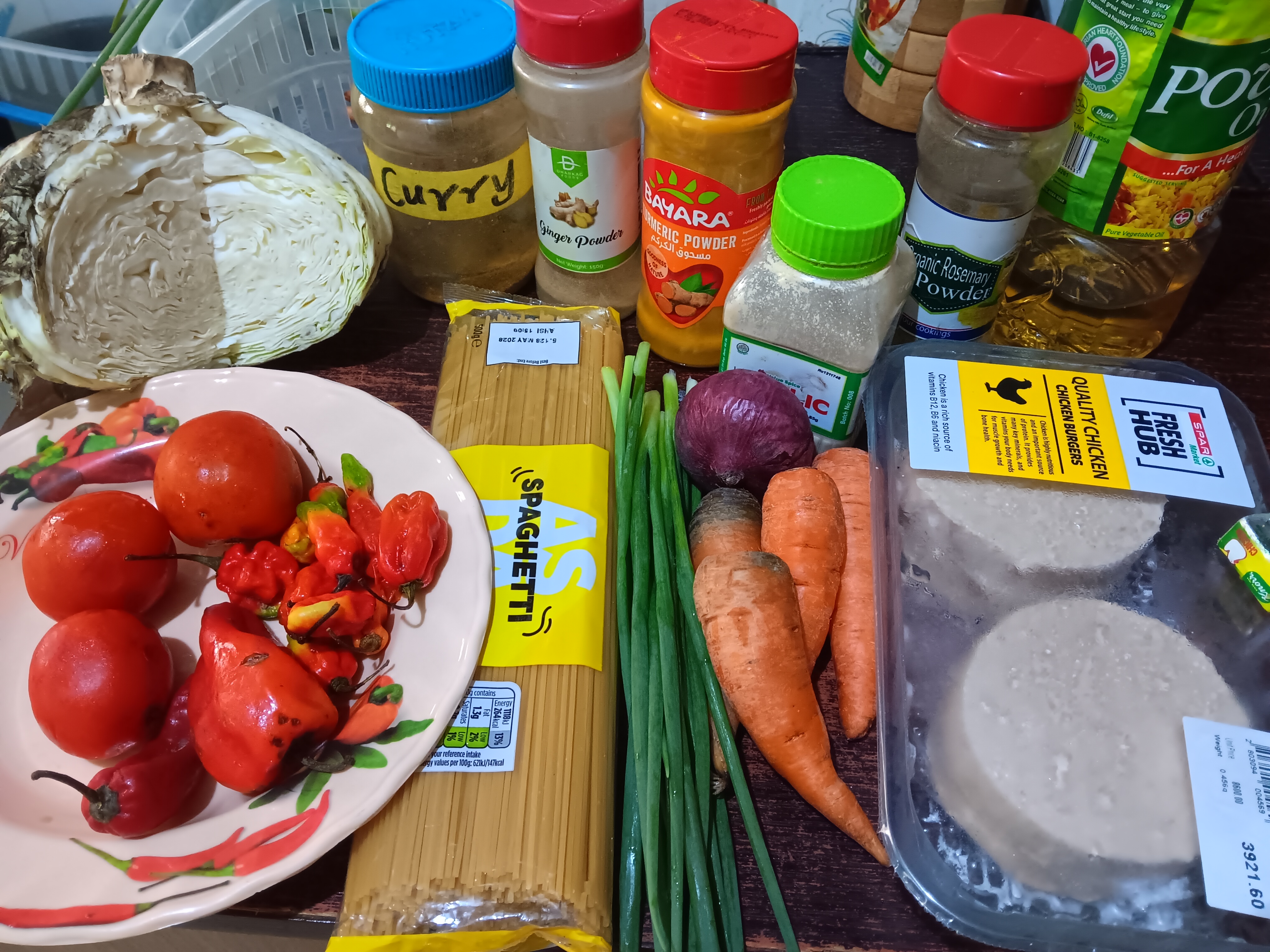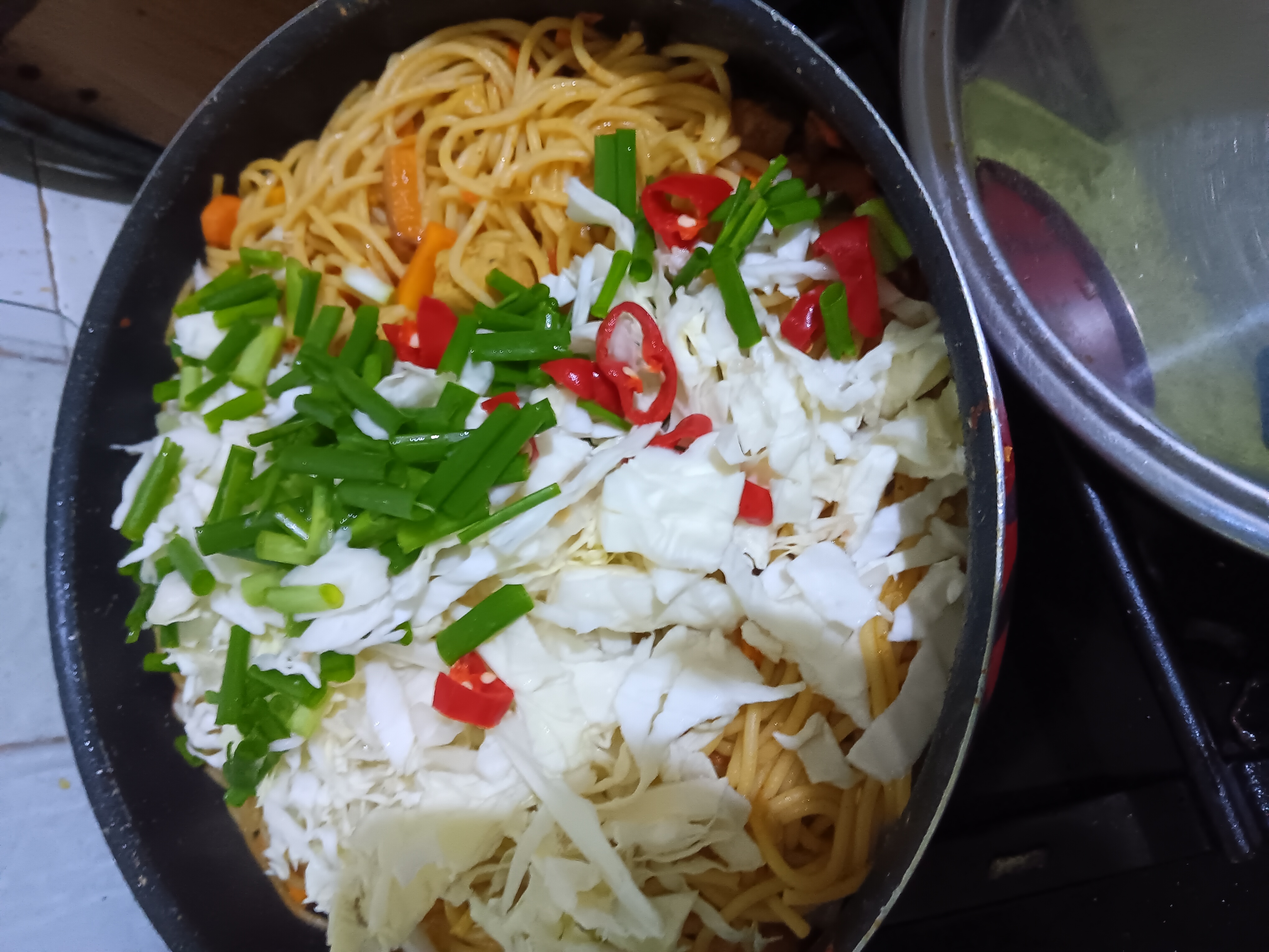 Add the chicken burgers. Slice the cabbage and spring onions, add them into the pasta, and stir. Taste and adjust spices where necessary. Cover and after cooking for 1 minute on a low heat, the dish is ready to be enjoyed.