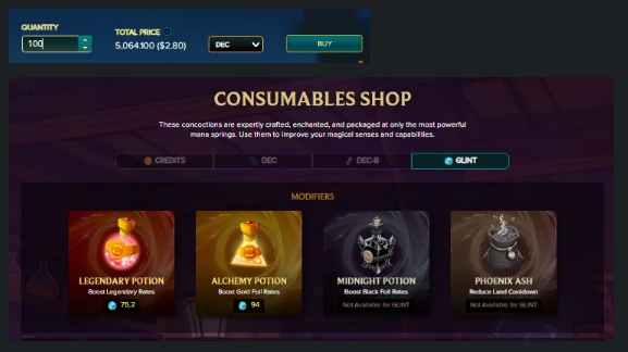 Before opening the packs, I spent some DEC and glints to buy potions. These raises my chances of getting epic, legendary, gold foils and the much sought after black foils. These potions are worth it.