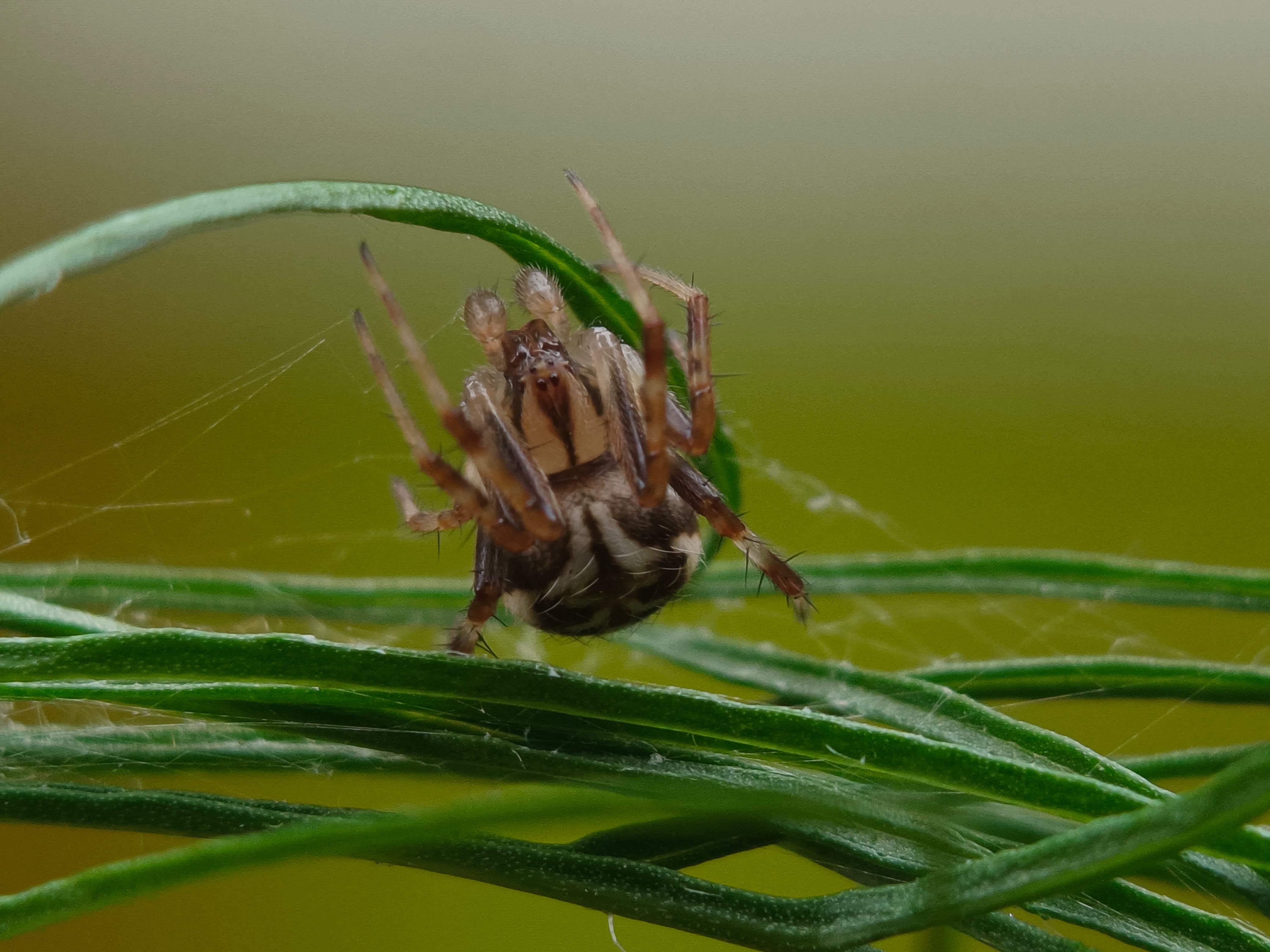 Luckily this spider didn't run away when I tried to take a picture of it, the question is whether this is a jumping spider or a web spider. I found this spider on the leaves and there was no spider web around there, I was very curious about that.