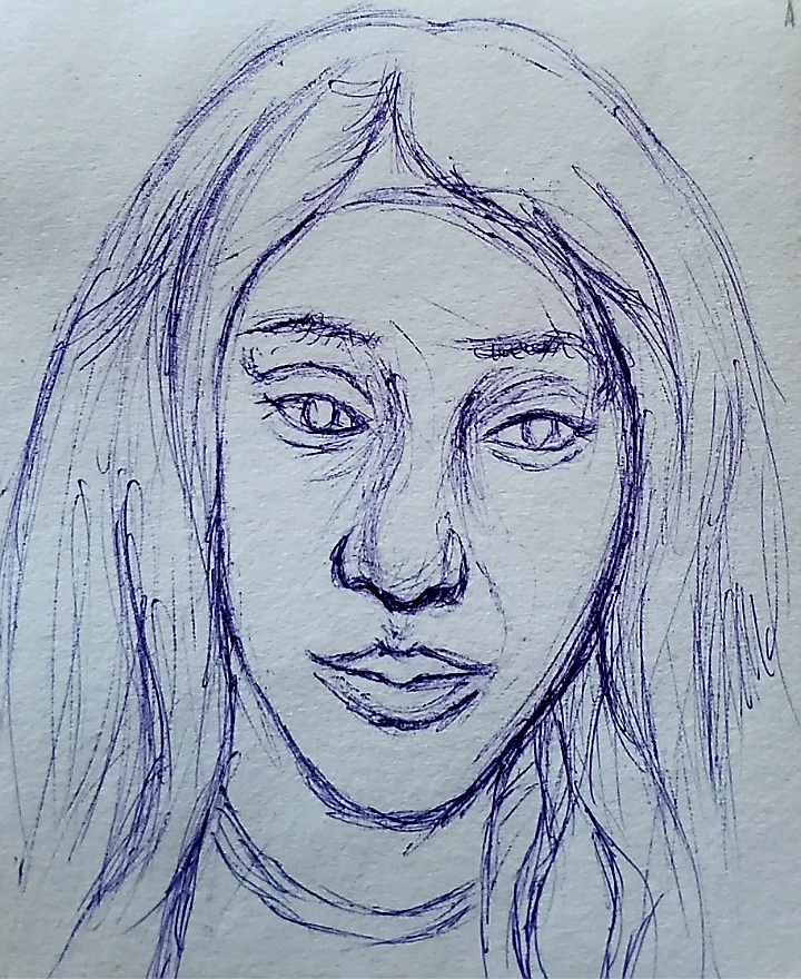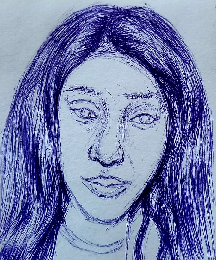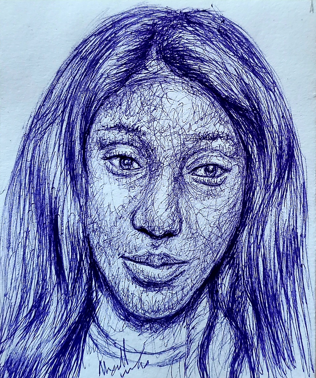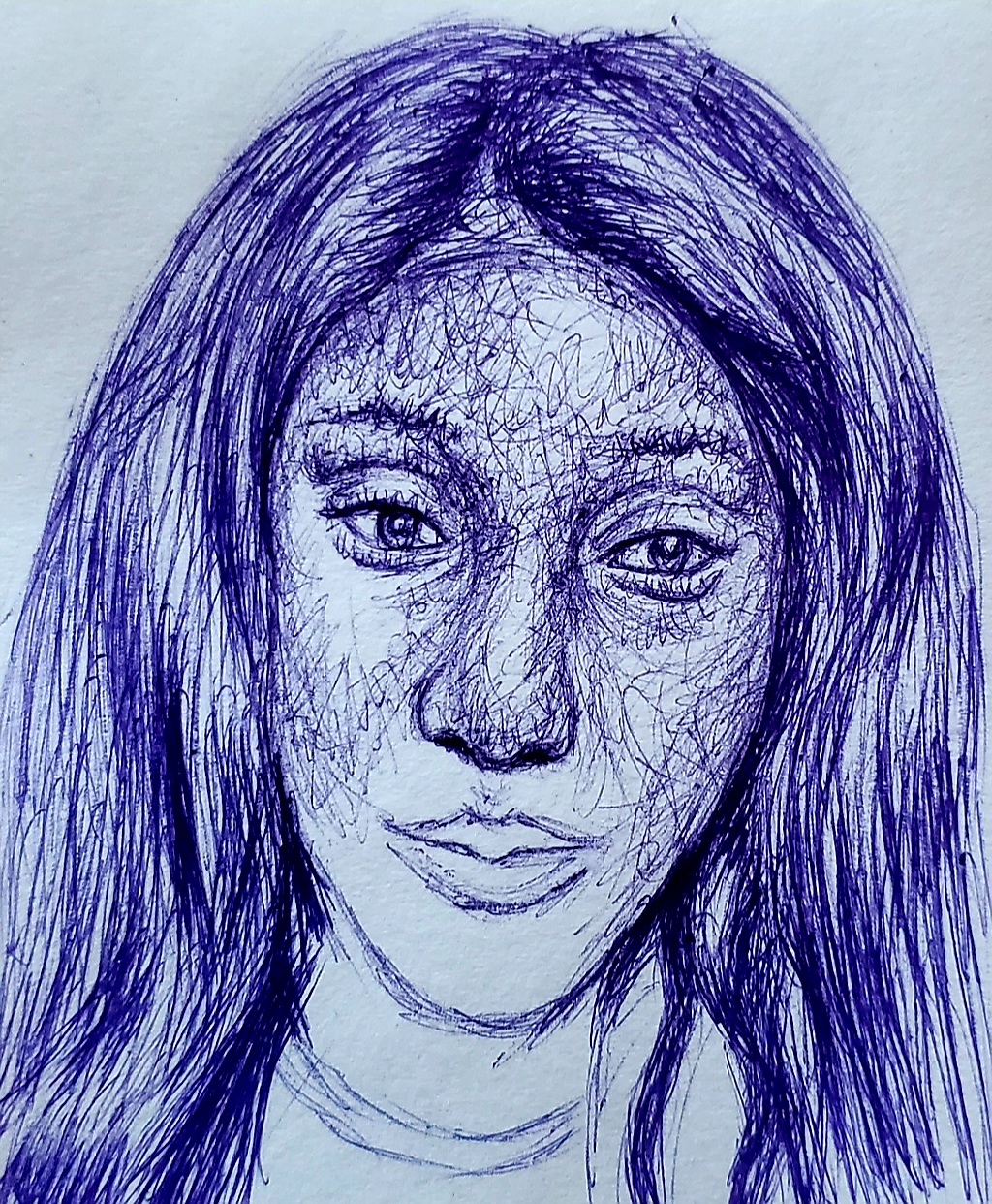 The portrait was done with a blue ballpoint pen on a cardboard paper. I used scribble technique to create this piece.