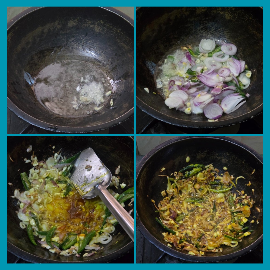 First, I put a lot of soybean oil in the pan and added ginger. After lightly frying, I added the onion and green chili ingredients. Later, I mixed it with the necessary ingredients including turmeric salt. After that, I fried it beautifully and presented it. Let us follow the next step.