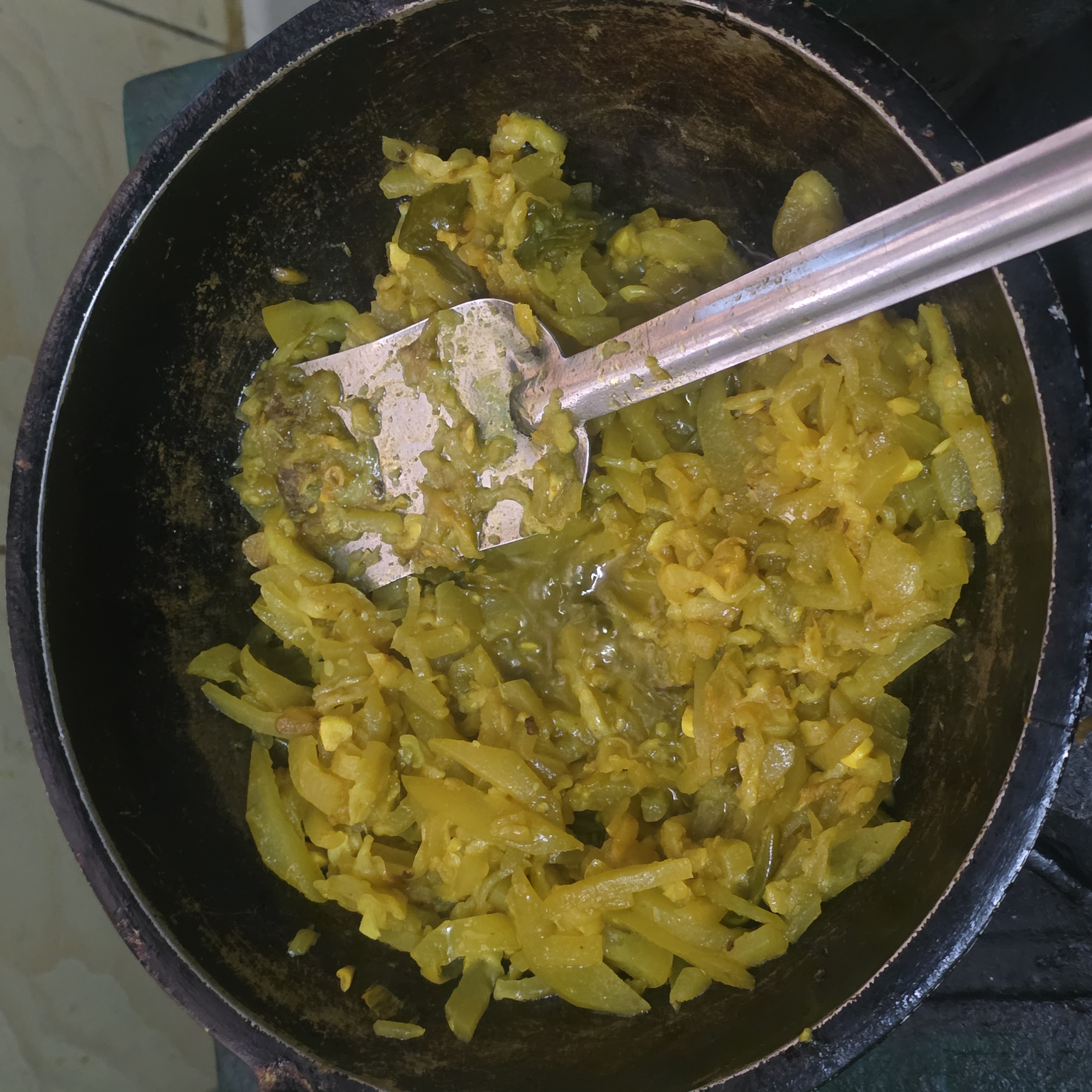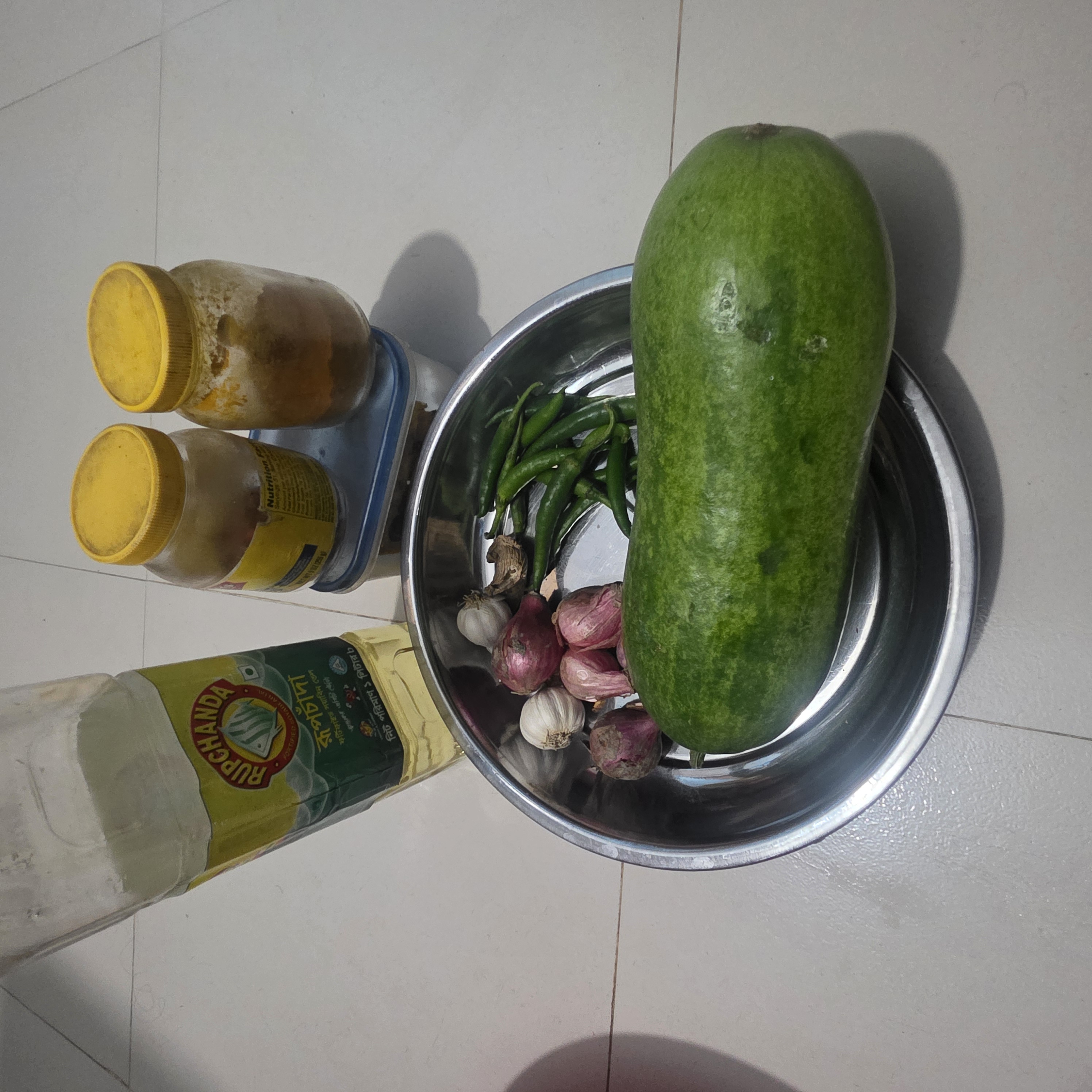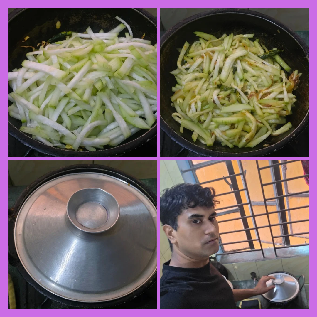 Necessary materials🕳️ Pumpkin 1 kg 🕳️ Green chilli 7/8 peaches 🕳️ Onion 180 grams 🕳️ Soybean oil 80 grams 🕳️ Salt as desired 🕳️ Turmeric as desired 🕳️ Salt as desired 🕳️ Sixty grams of garlic.🕳️ 10 gram ginger