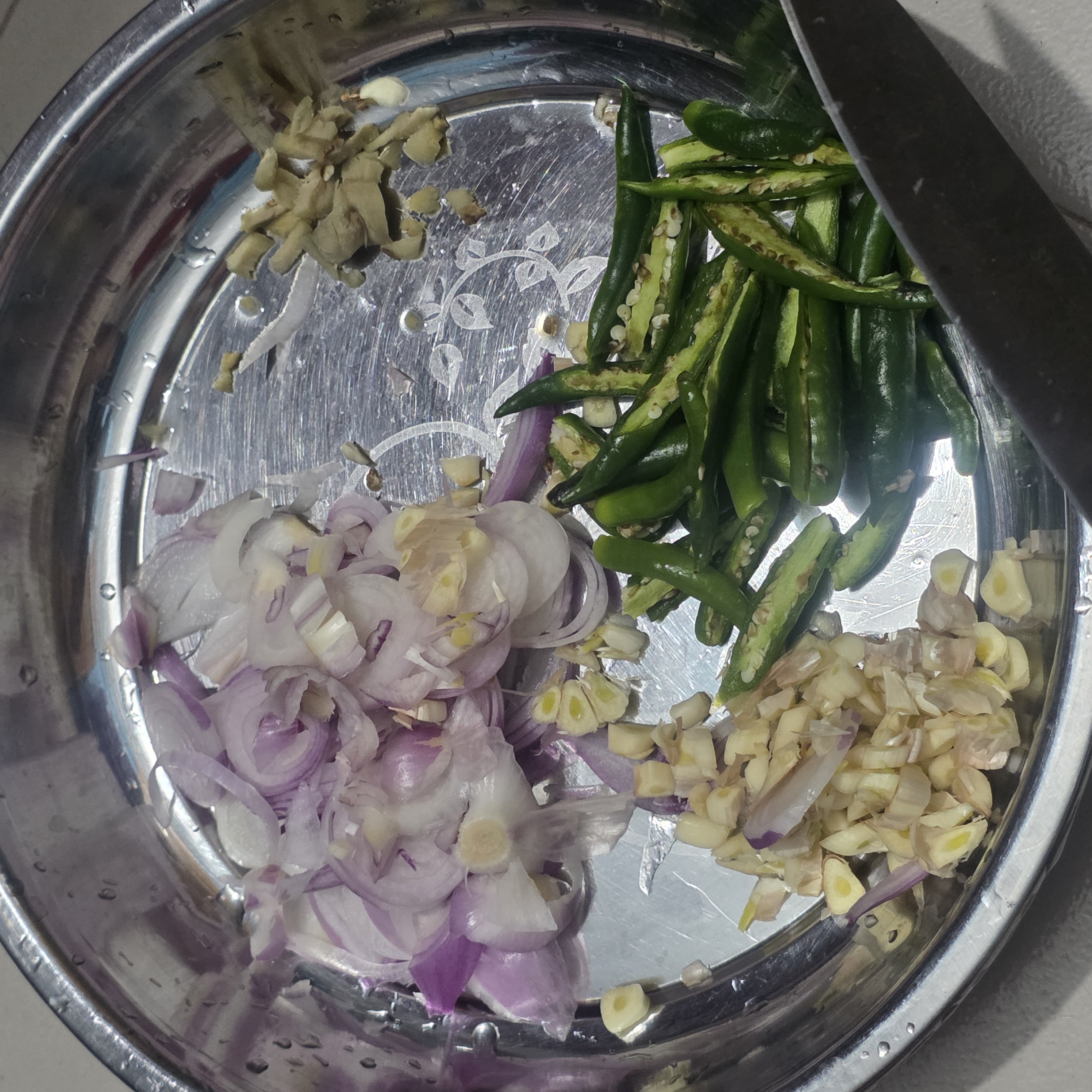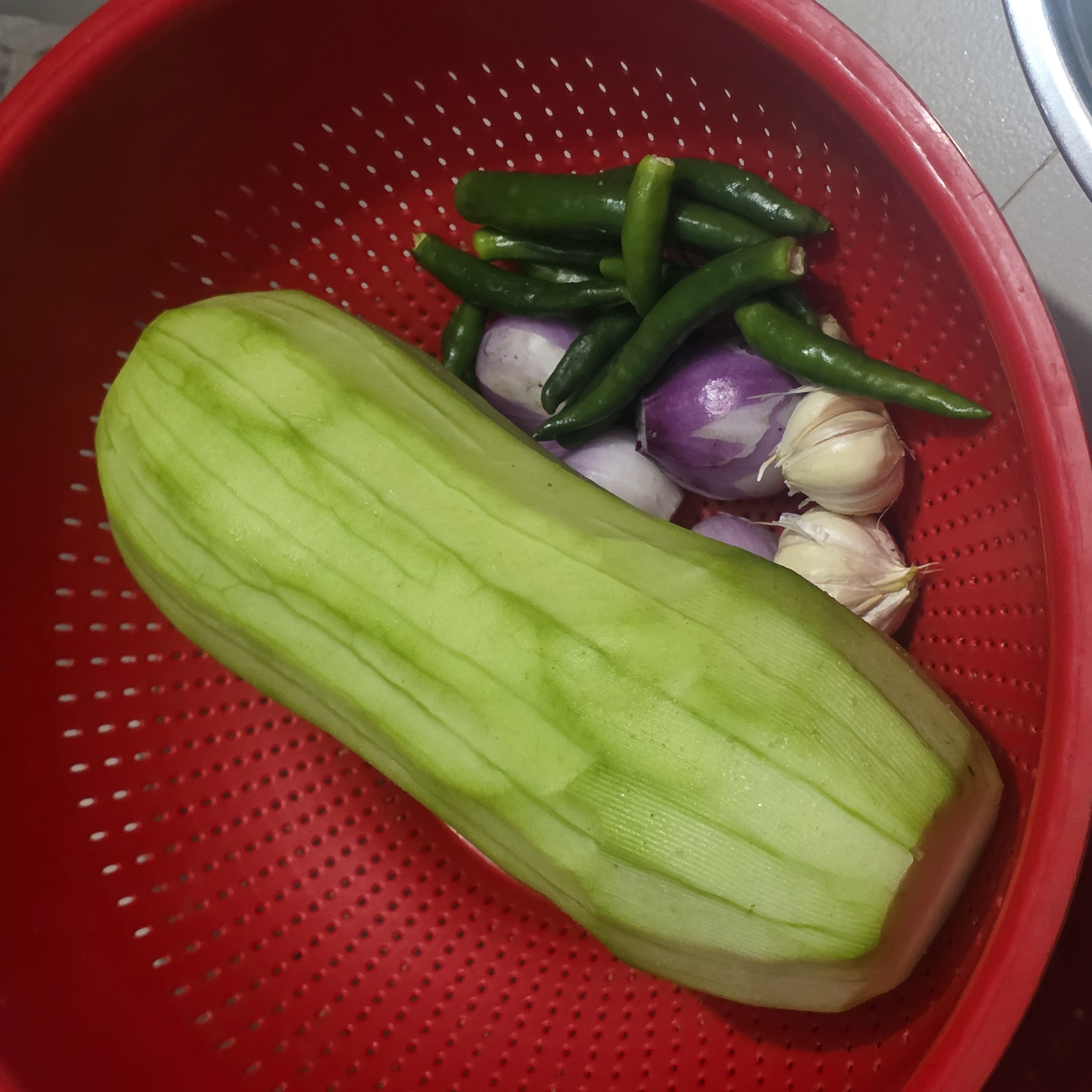 Next, I cleaned and peeled all the ingredients, including onion, green chili, and garlic, and washed all the ingredients with clean water.