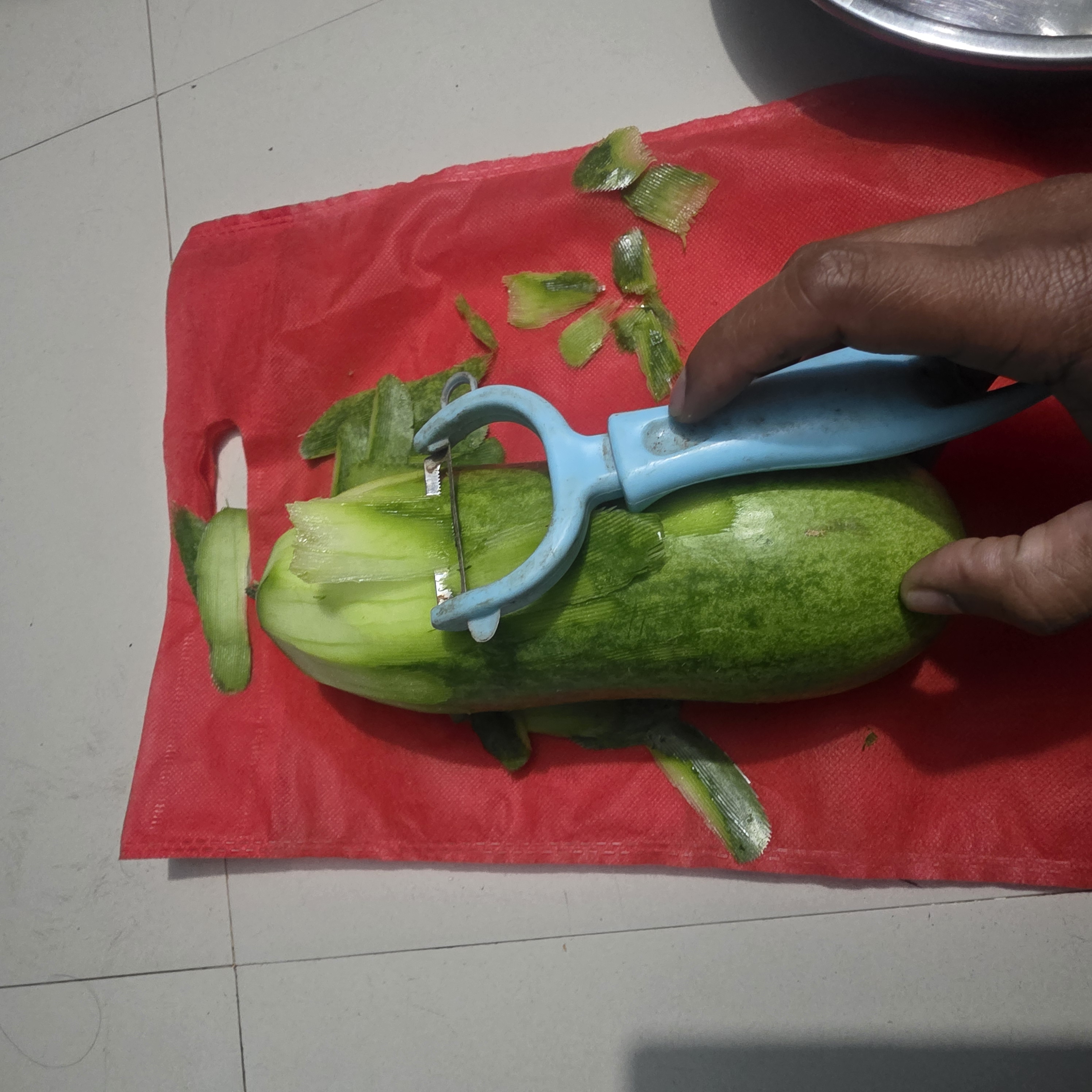 Here, first I took the pumpkin and peeled it well with a peeler. I separated the green skins.