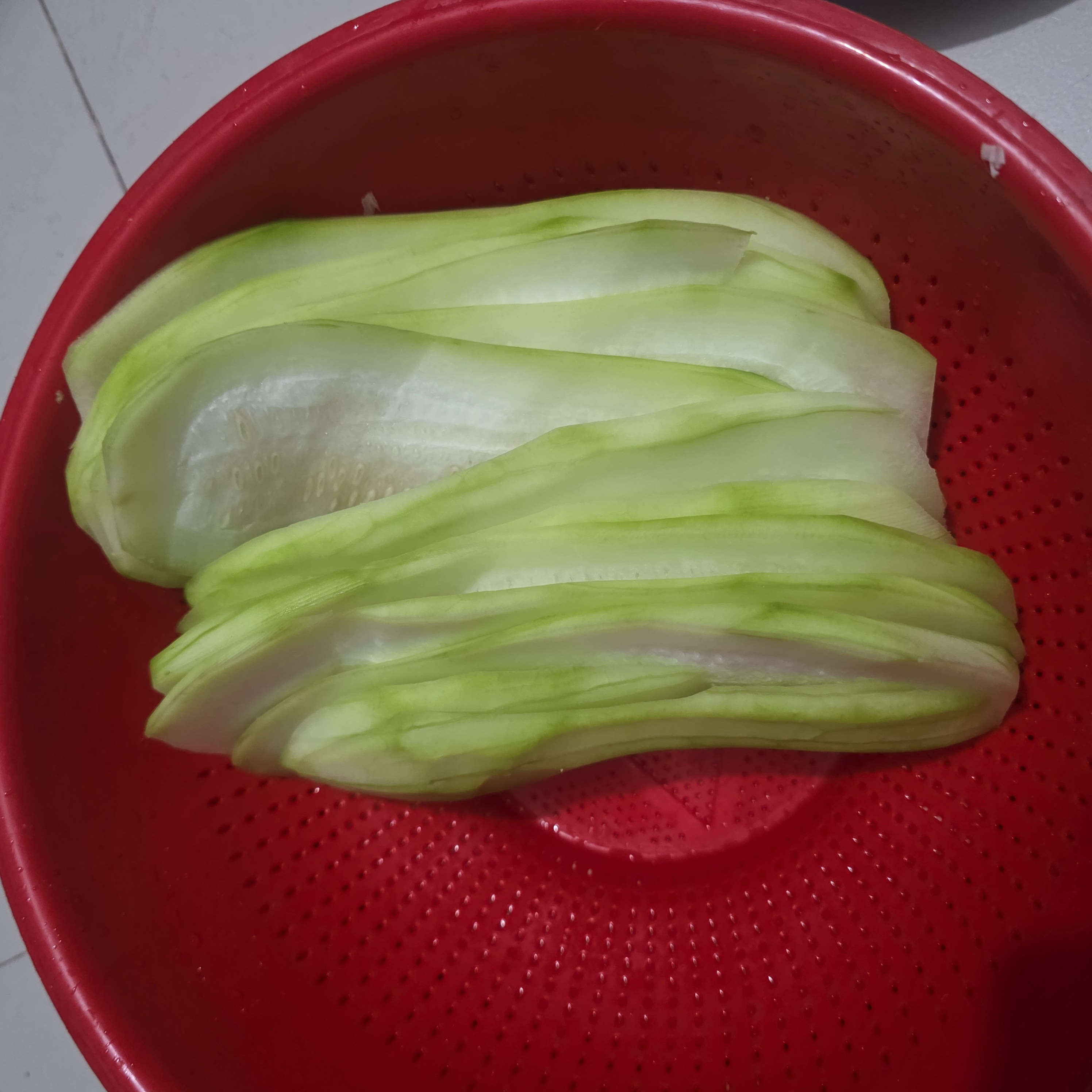 Then I cut the pumpkin into nice, thin, long slices with a knife.