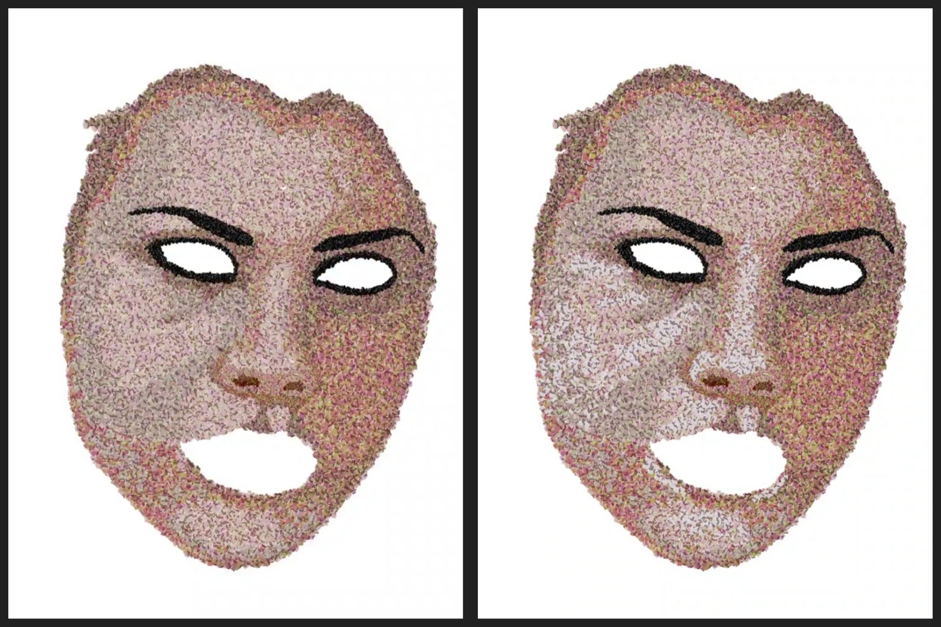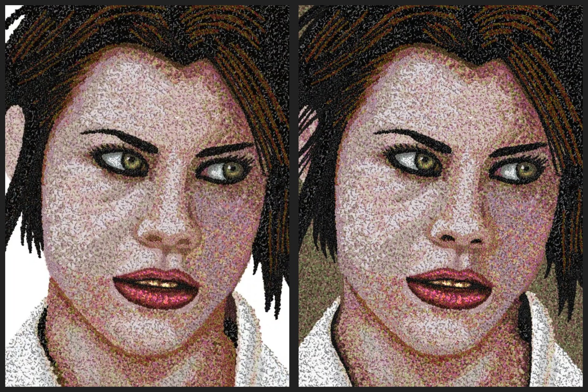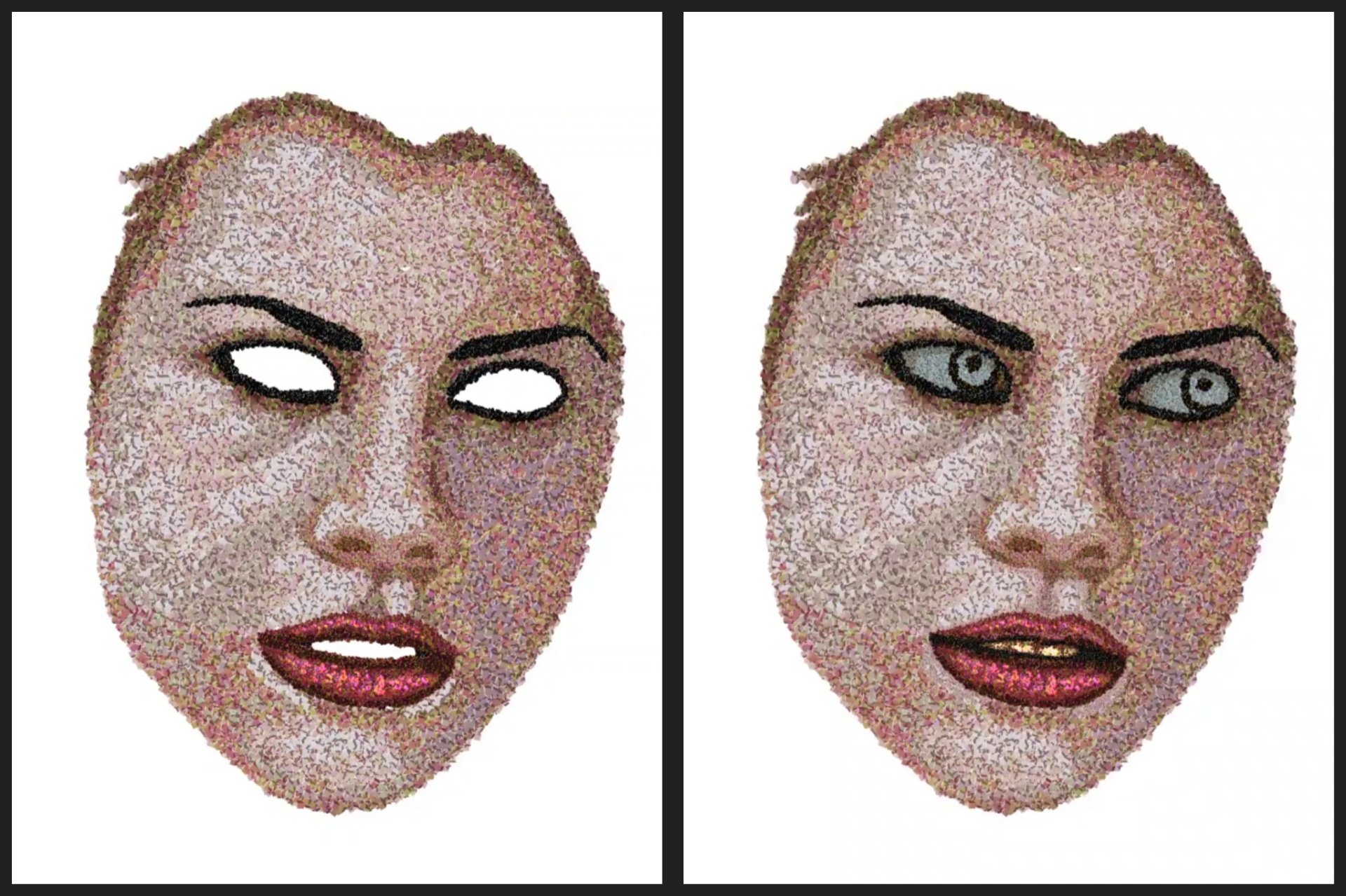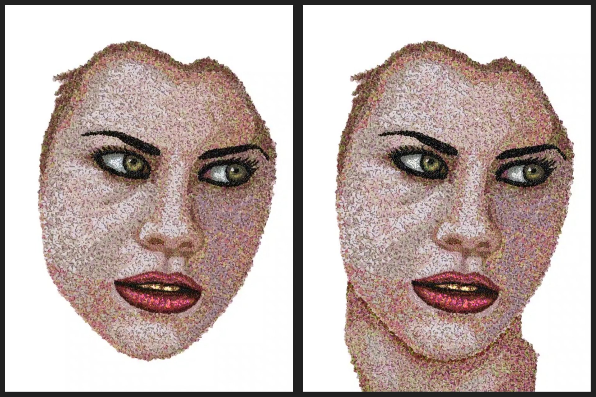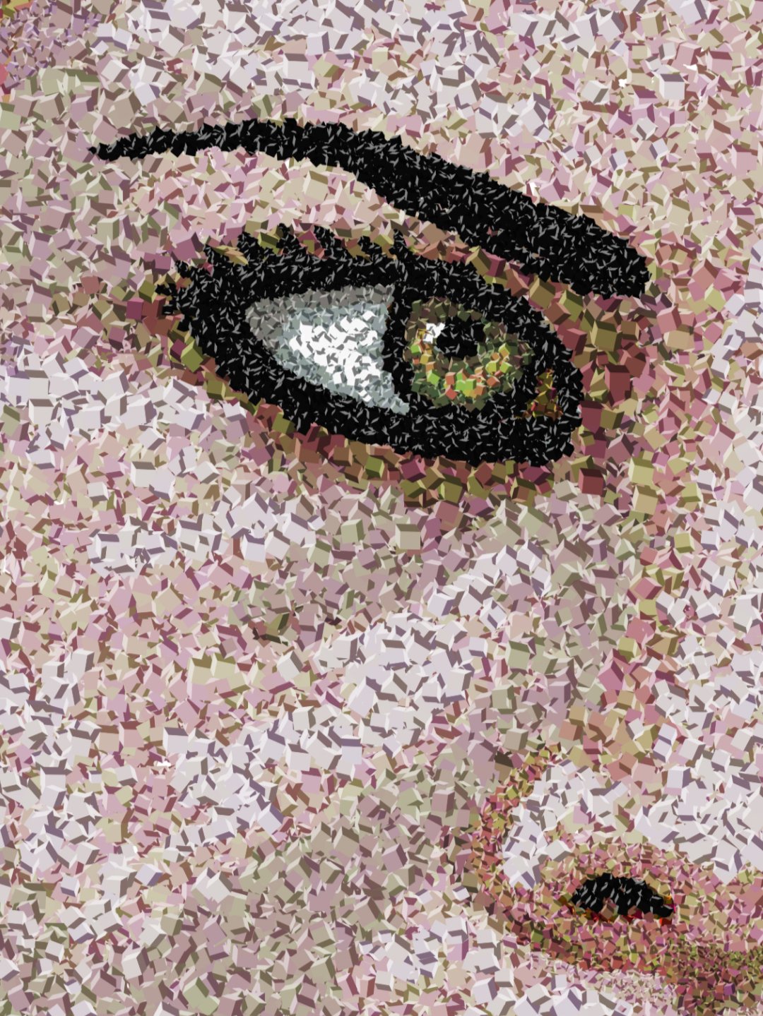 Lo curioso de este retrato es que a simple vista parece algo bastante común, pero si lo acercas lo suficiente puedes notar los cientos de cubos que lo conforman, simulando así técnicas tales como el puntillismo, el divisionismo o tal vez la de un mosaico digital, una muestra clara de arte contemporáneo.
