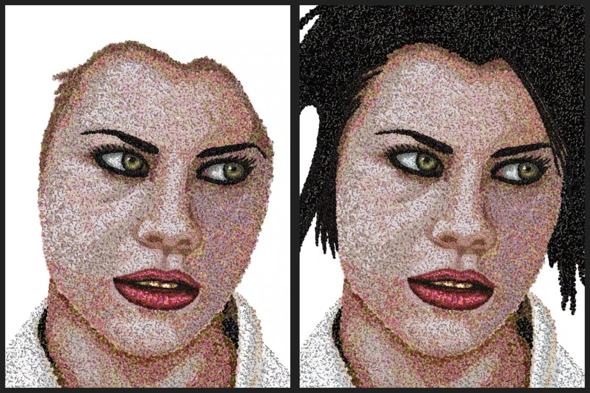 The curious thing about this portrait is that at first glance it seems quite ordinary, but if you look closely enough you can see the hundreds of cubes that make it up, simulating techniques such as pointillism, divisionism, or perhaps a digital mosaic, a clear example of contemporary art.