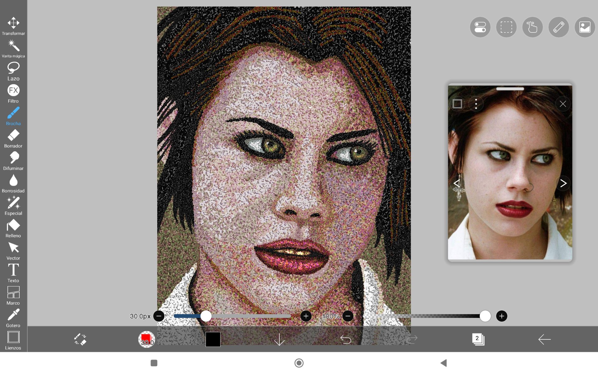 Debo mencionar que en algún momento, tuve que bajarle al grosor del pincel, en casos tales como los ojos, que es una zona bastante pequeña y en parte del cabello, también para definír un poco los bordes del rostro.