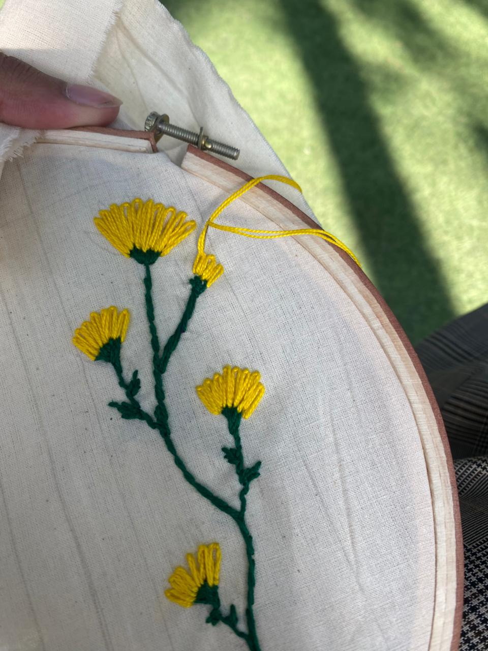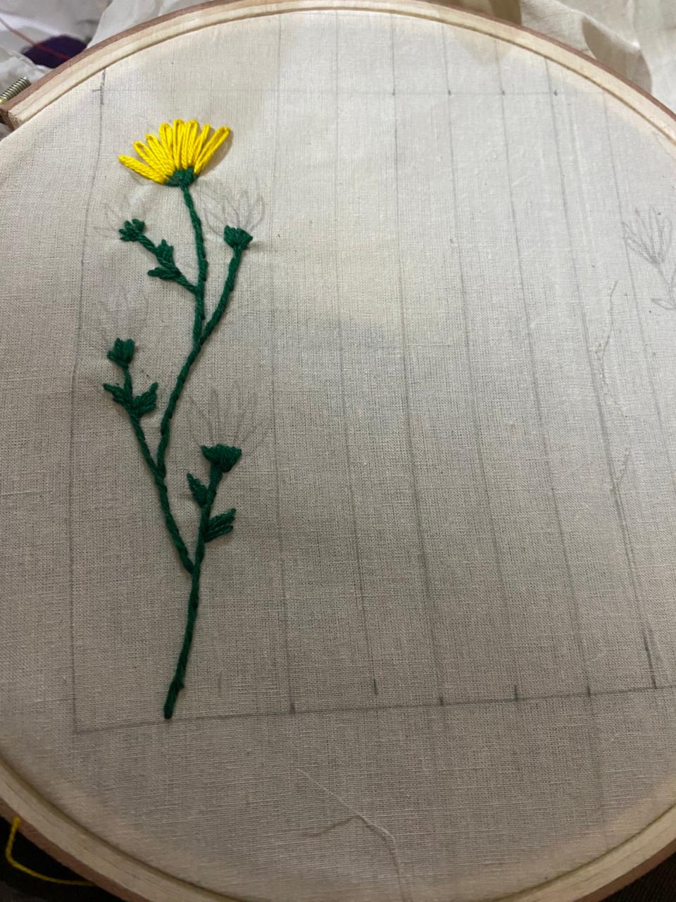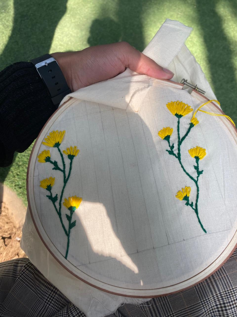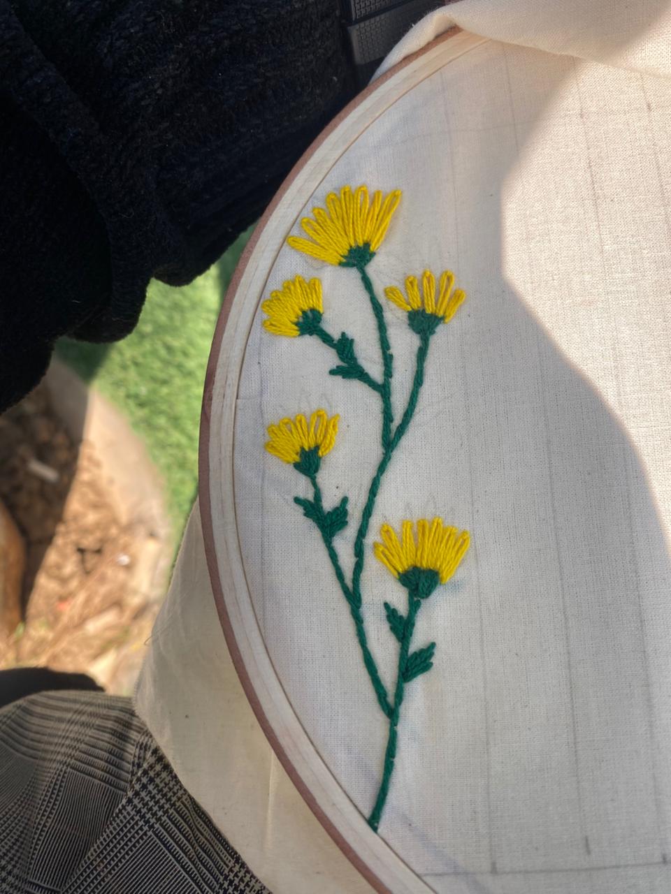 Now I moved to the flowers. I used yellow color for my embroidery flower. Because it was giving sunflower vibes.