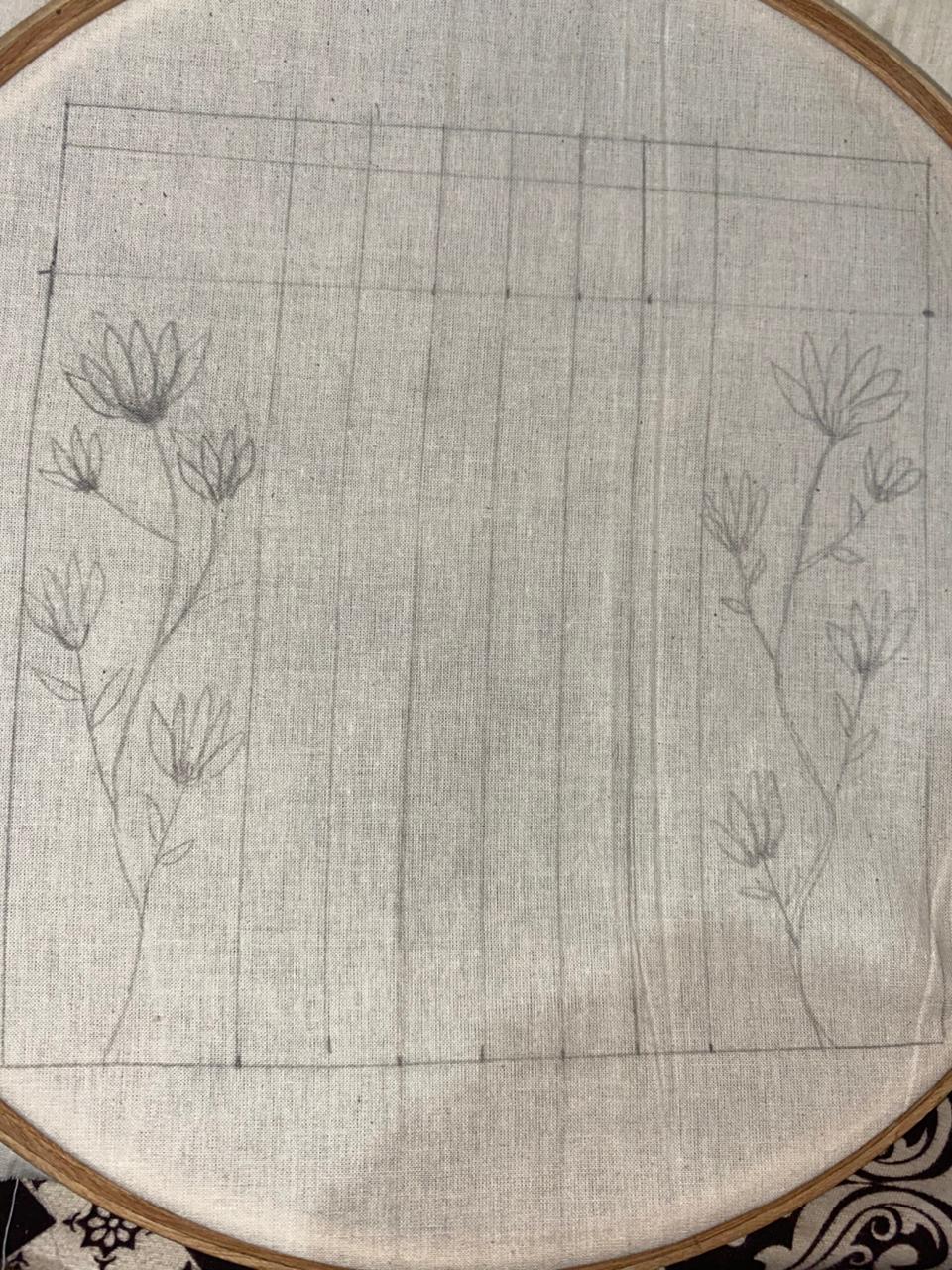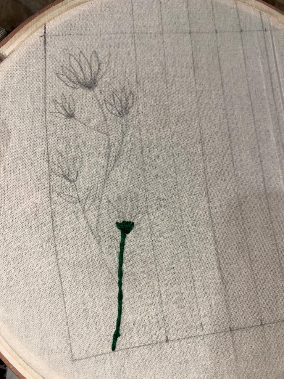Now I draw the design with lead pencil. It was a stem with flowers. It was totally with my own brain. I didn't coppy this from any side.