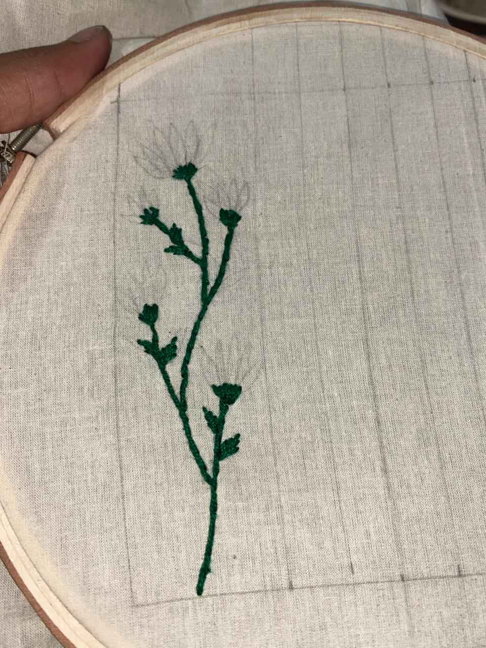 Then I was thinking which teach I must used in my embroidery. So you think about this teaches our teacher teach us. I started from back stich. I used in stamps and leaves so it was in green thread. So it was looking so good just like a stem.