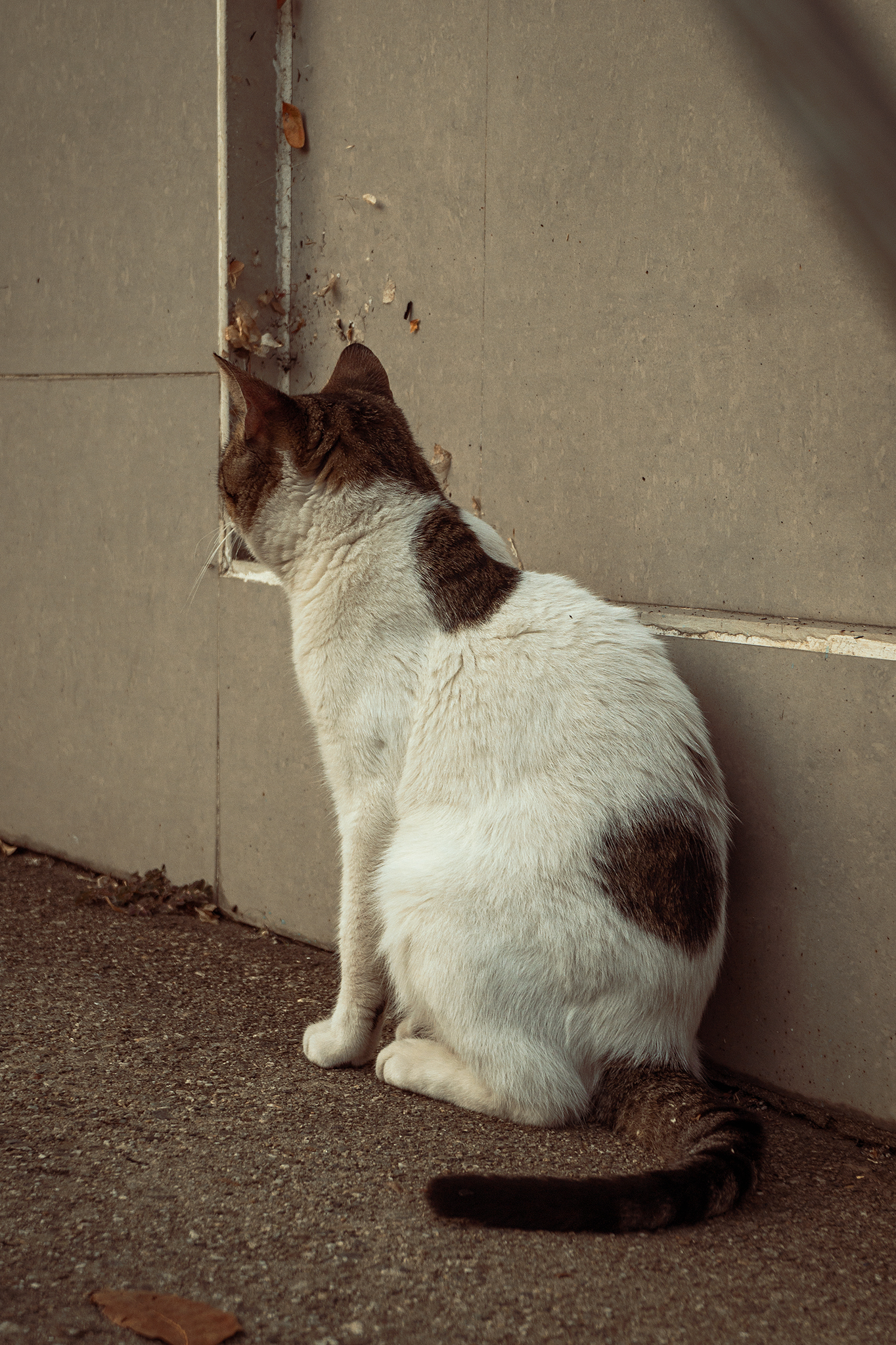 For the development, I tried to keep the original colors; I only had to increase the exposure and make some balance corrections, but otherwise, I really liked the setting, the cat, and the soft light of the place. I think it definitely captures a good street moment of a cat that is attentive and at the same time distracted by the things around it.