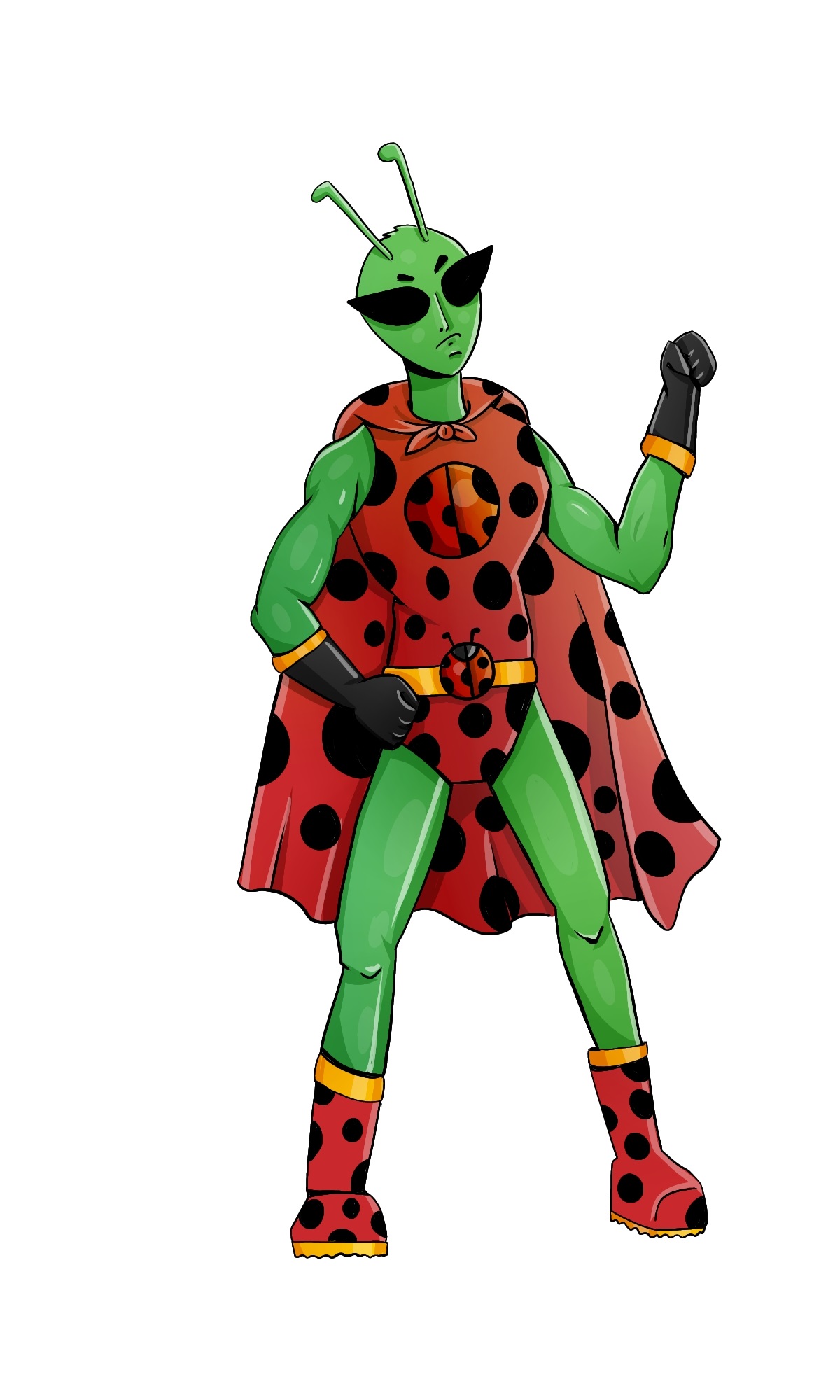The insecto que decidí evolucionar fue la mariquita que dibujé en la comunidad AlienArt, donde explicaba cómo los aliens se inspiran en insectos y cómo muchos creen que, de existir, los aliens tendrían forma de insectos. También narré la importancia de las mariquitas para el medio ambiente y la agricultura, sobre todo como controladores naturales de otras plagas. Decidí entonces que mi mariquita estaría inspirada en: la mariquita, el insecto que dibujé; el alien, por la teoría de que los insectos son los aliens de la Tierra; y el superhéroe, por su beneficiosa labor protegiendo cultivos. Para el proceso de evolución me inspiré en una de mis caricaturas favoritas, Digimon, donde la primera evolución siempre es un animal o una forma básica, y después una segunda forma, casi siempre humanoide, más fuerte y poderosa.