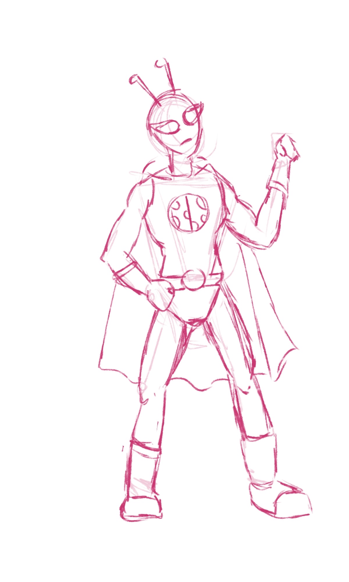 The second step was to begin what would be my final sketch, creating each feature and detail of my character: its antennas, its large eyes, belt and cape, gloves and boots.