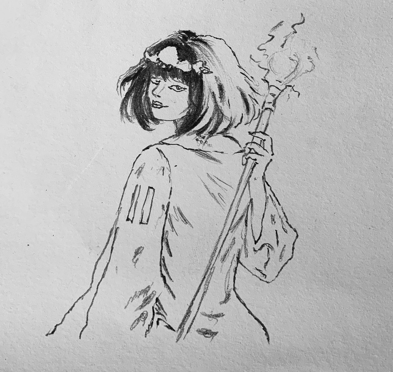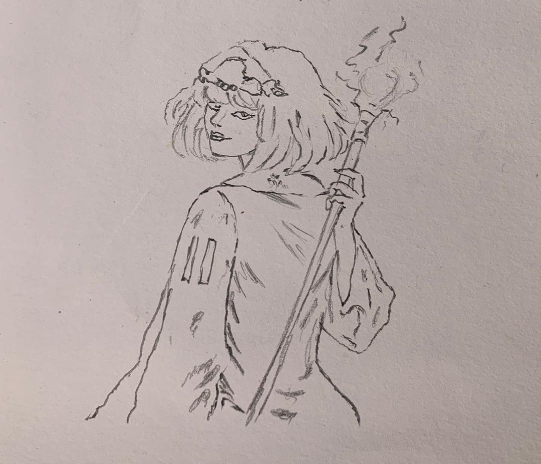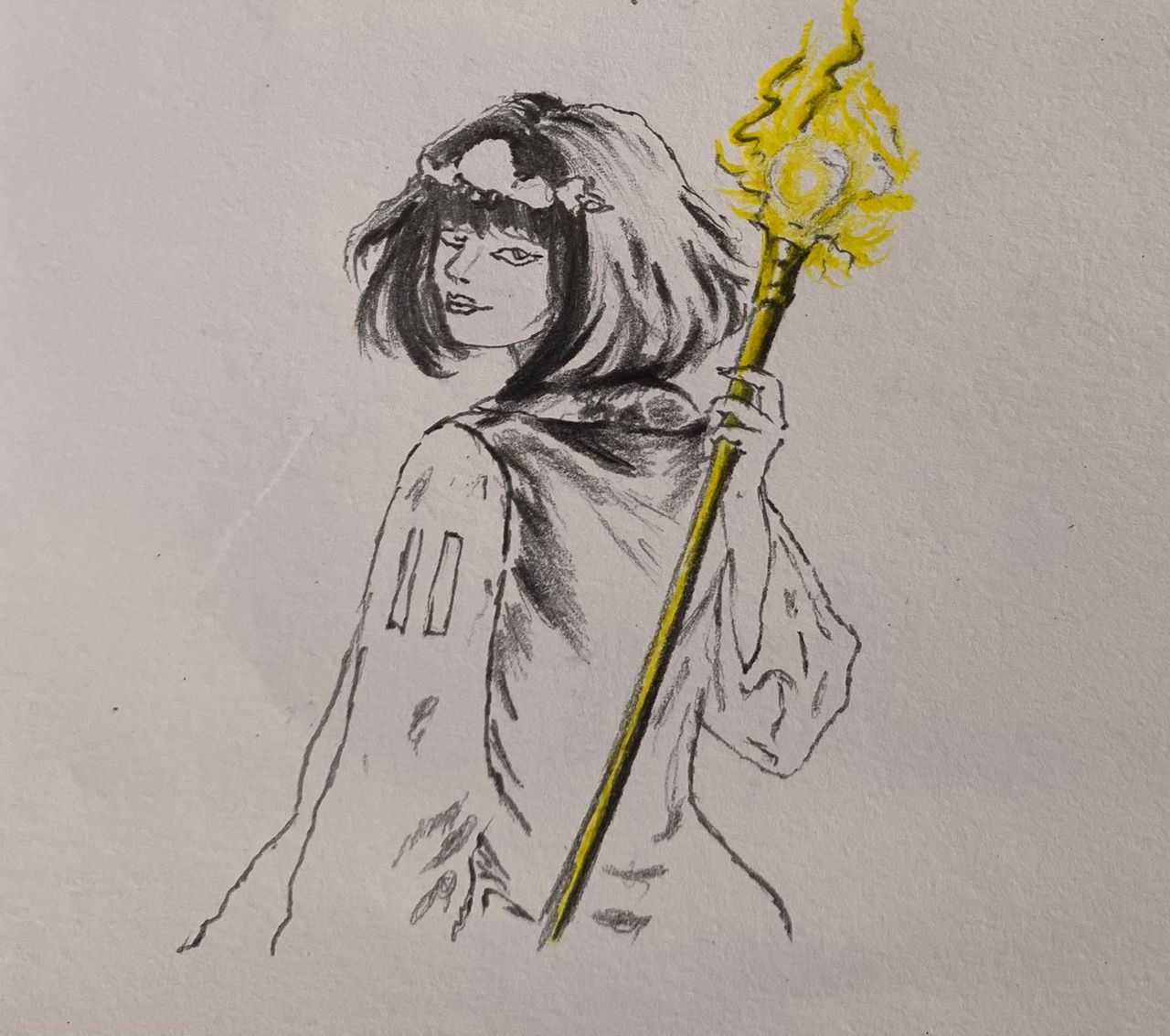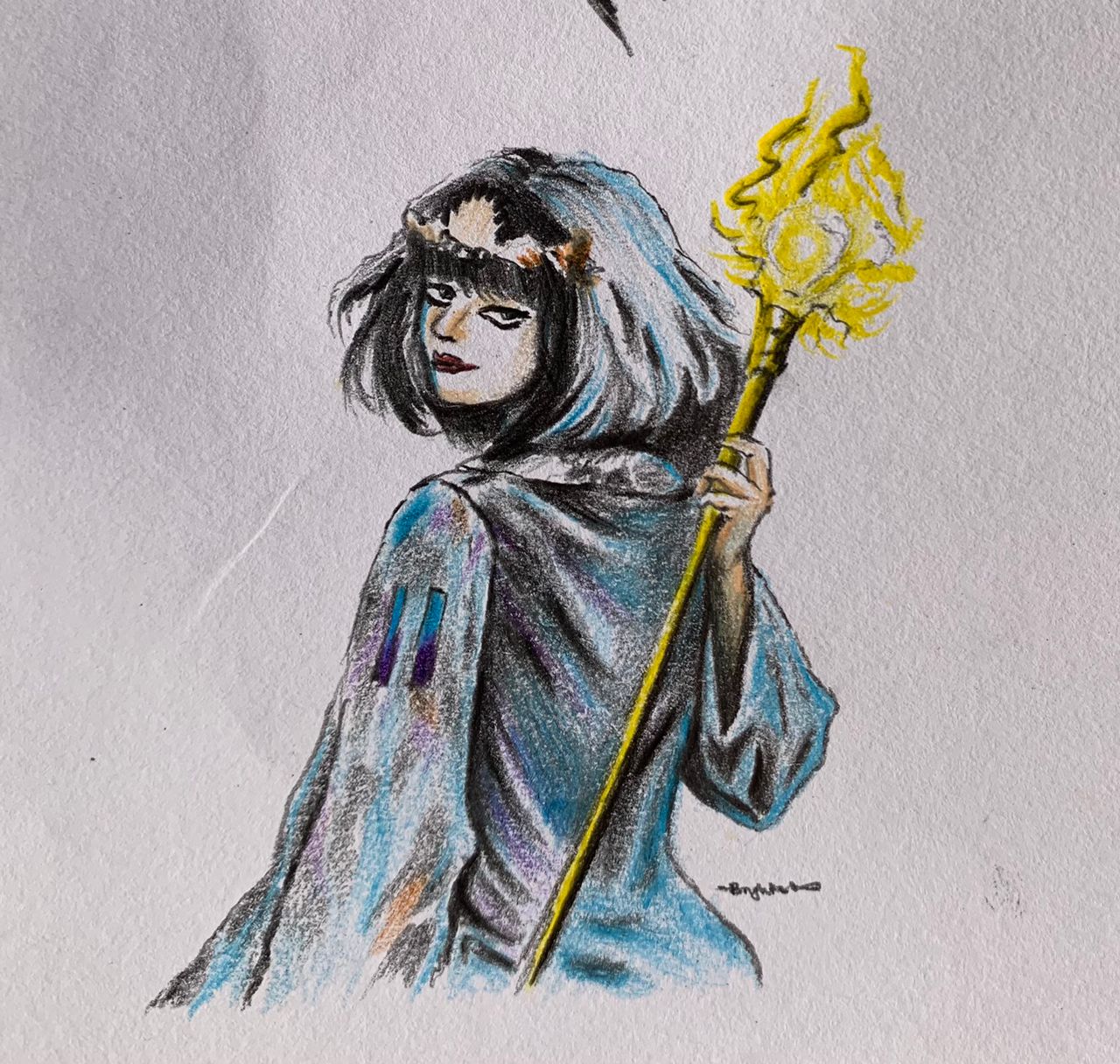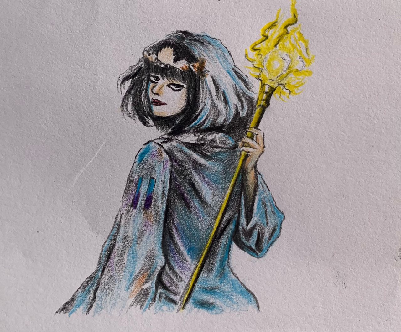 The glowing yellow staff contrast boldly against the cool palette, symbolizing healing energy and hope. Her expression is Serene yet watchful, suggesting wisdom earned through experience and a deep bond with nature.